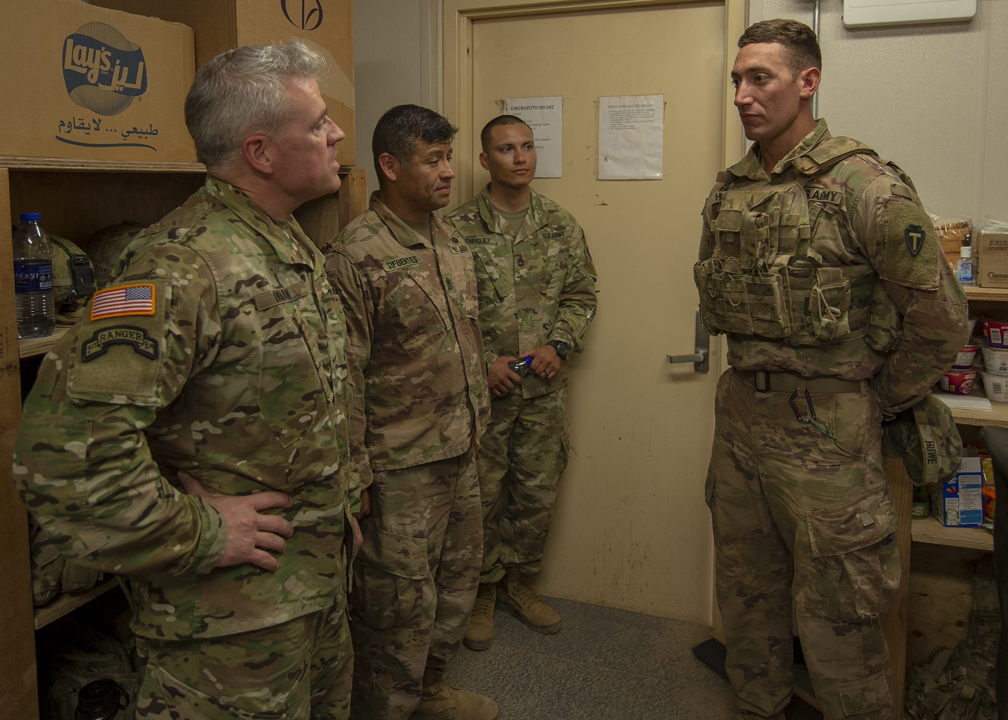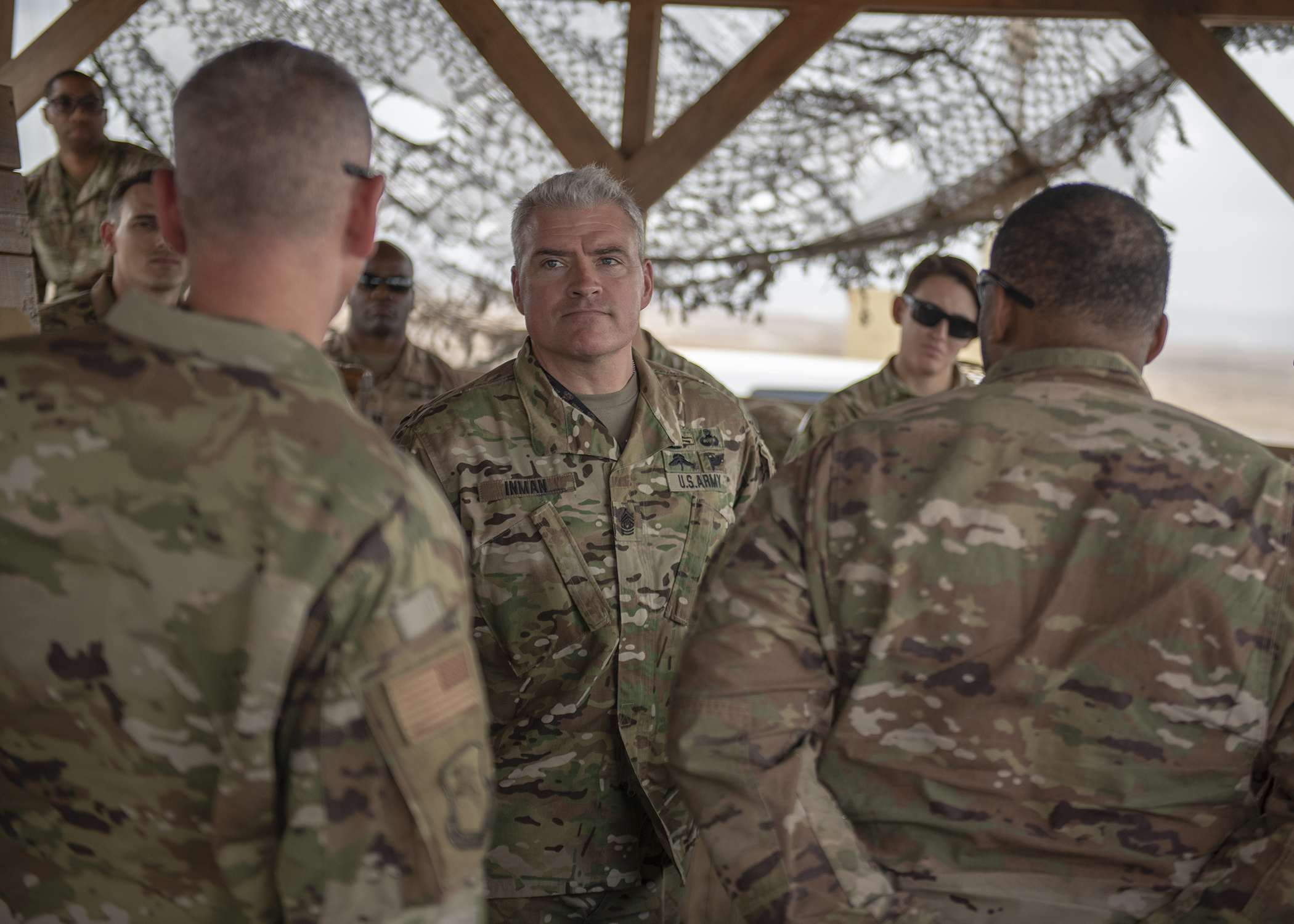 U.S. Army Command Sgt. Maj. Jeremiah E. Inman, command sergeant major of U.S. Army Africa (USARAF), meets with Soldiers assigned to Combined Joint Task Force-Horn of Africa (CJTF-HOA), during Inman’s visit to a forward operating location in East Africa, March 12, 2019. Inman visited to familiarize himself with the U.S. Army units embedded in CJTF-HOA and to help foster a better partnership between USARAF and CJTF-HOA. (U.S. Air Force photo by Tech. Sgt. Shawn Nickel)