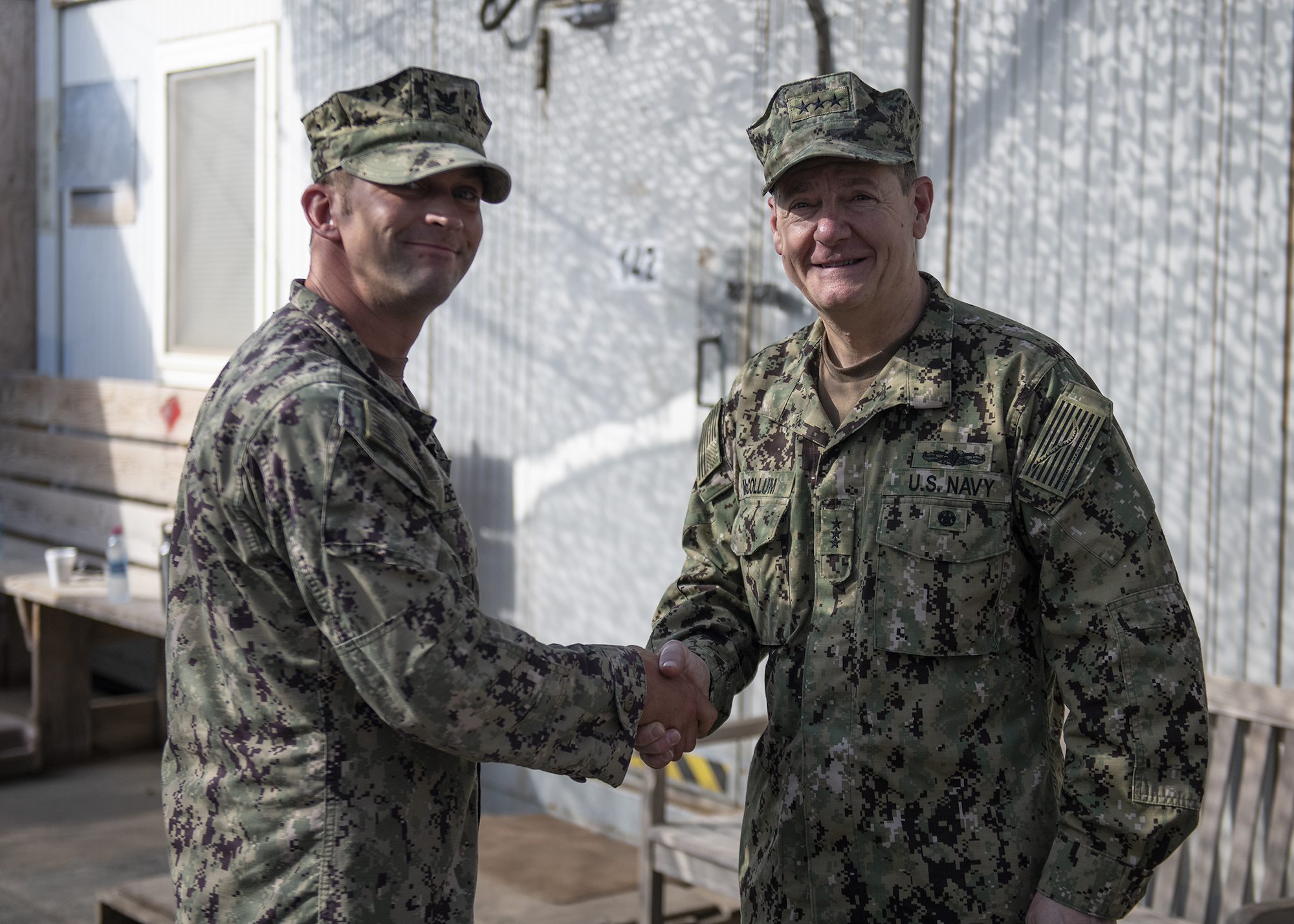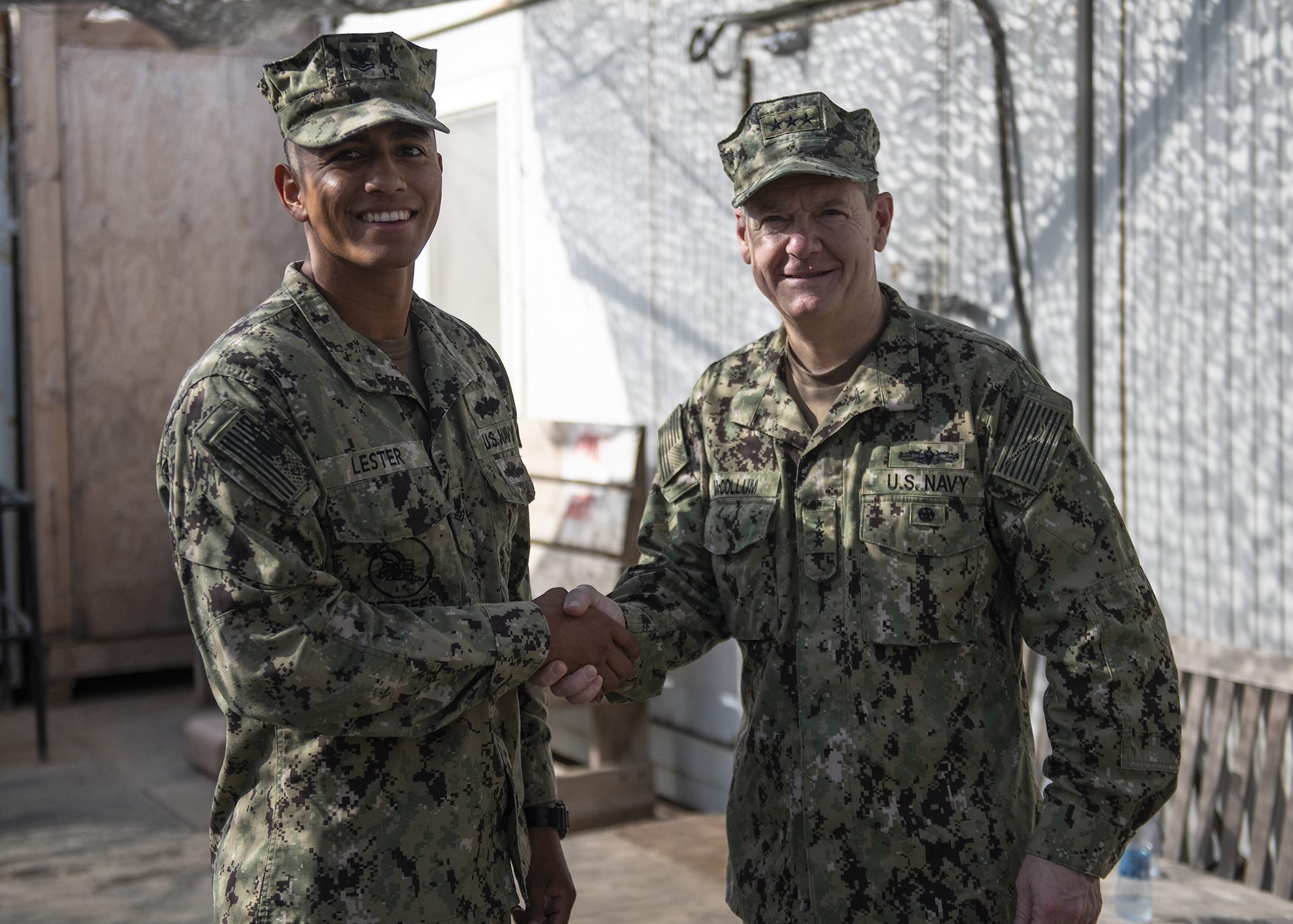 Chief of Navy Reserve Vice Adm. Luke McCollum presents a coin to U.S. Navy Petty Officer 2nd Class Jonathan Lester, a Seabee from Naval Mobile Construction Battalion 1, assigned to Combined Joint Task Force - Horn of Africa, while visiting Camp Lemonnier, Djibouti, Feb. 3, 2019. McCollum visited as part of a tour of Reserve units to answer questions, discuss leadership initiatives and interact with local Sailors. (U.S. Air Force photo by Tech. Sgt. Shawn Nickel)