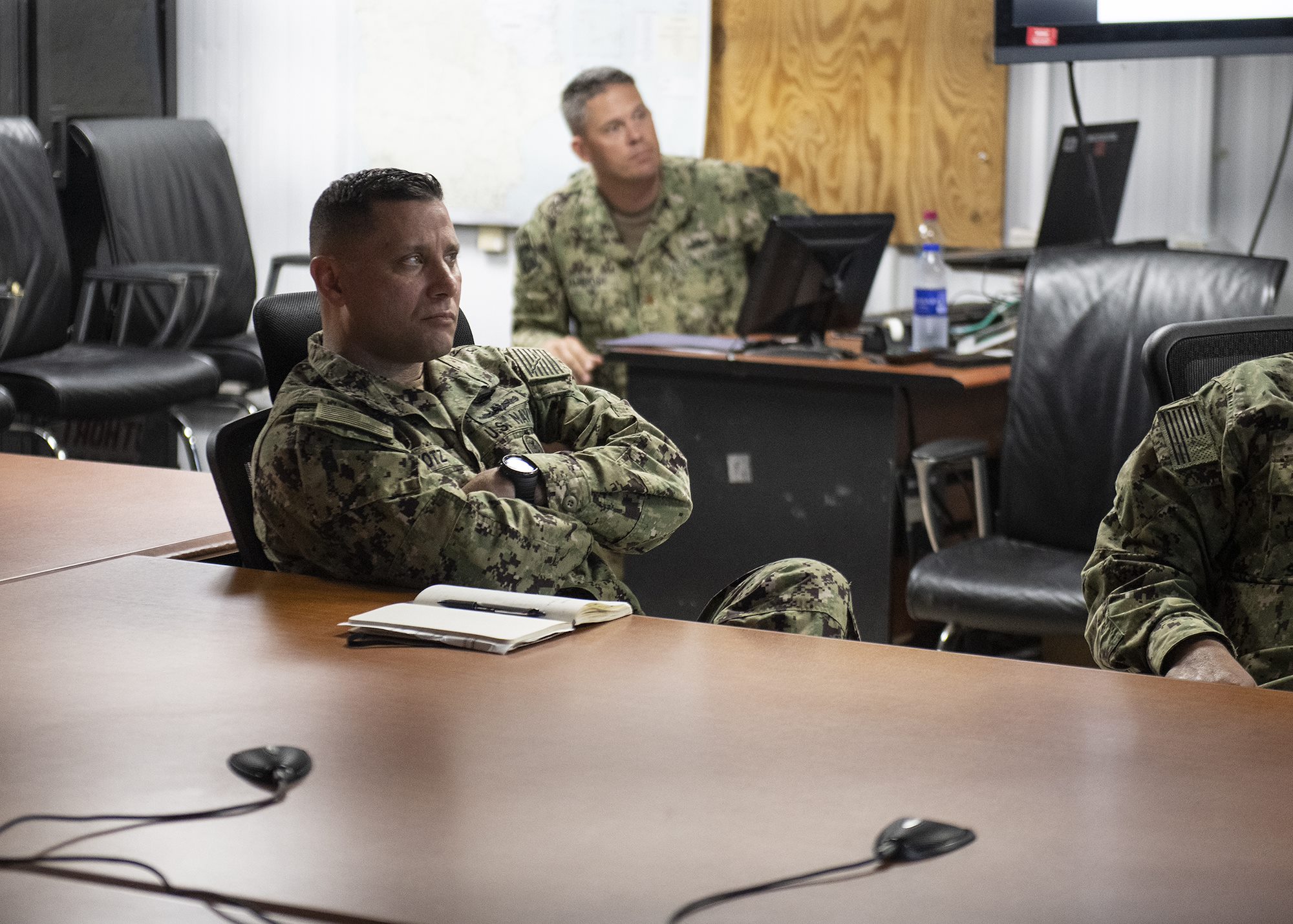U.S. Navy Reserve Force Master Chief Chris Kotz listens to a Coastal Riverine Squadron 11, Combined Joint Task Force - Horn of Africa, unit mission brief while visiting Camp Lemonnier, Djibouti, Feb. 3, 2019. Kotz visited as part of a tour of Reserve units to answer questions, discuss leadership initiatives and interact with local Sailors. (U.S. Air Force photo by Tech. Sgt. Shawn Nickel)