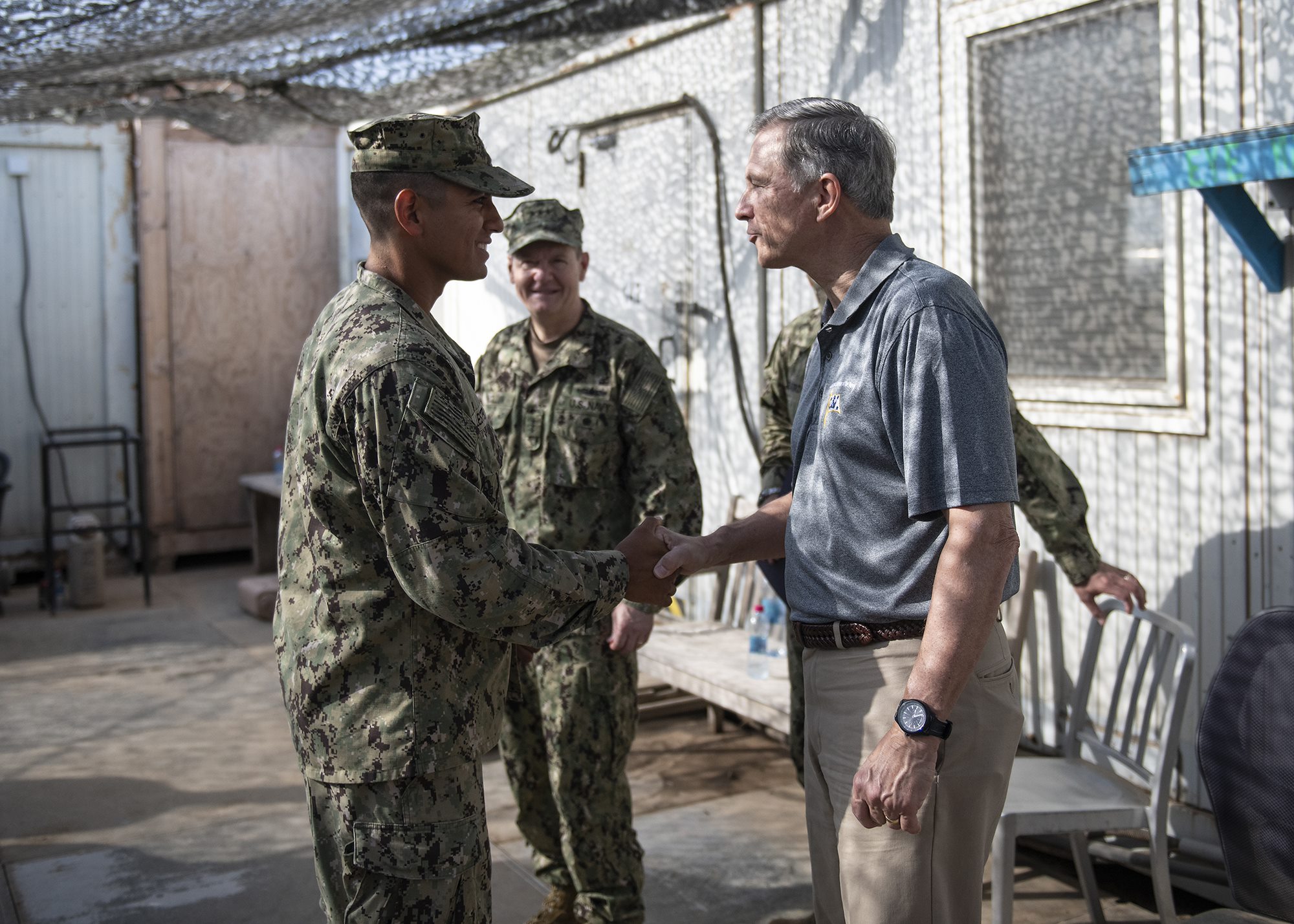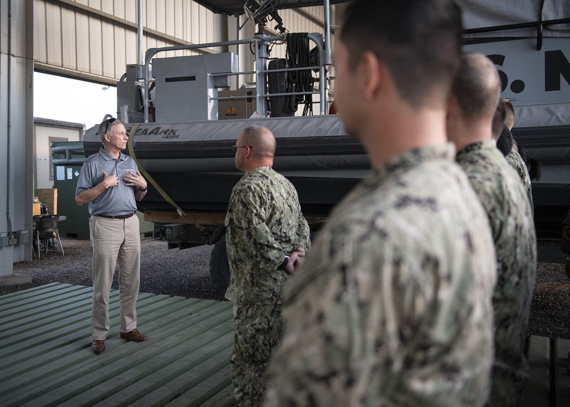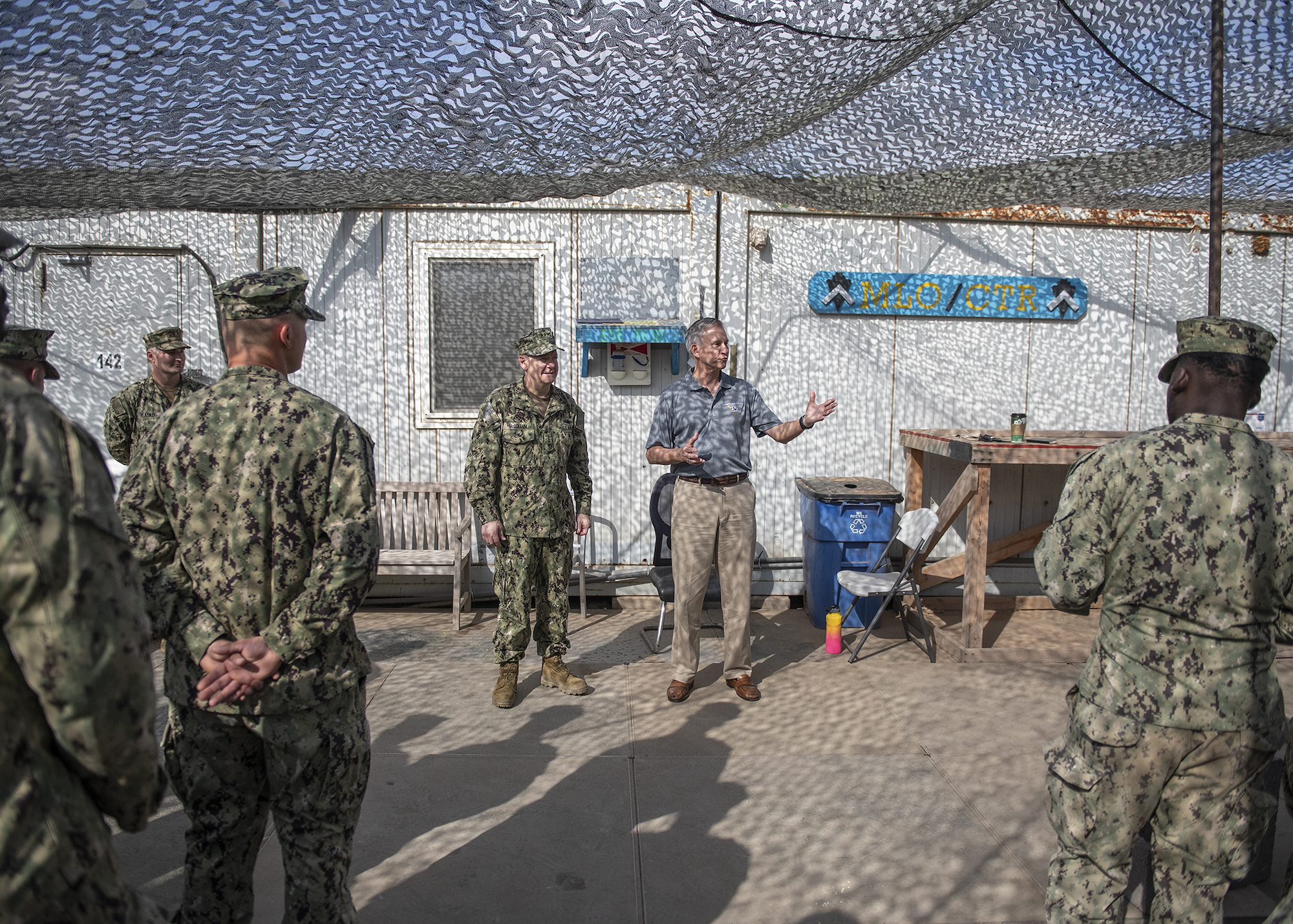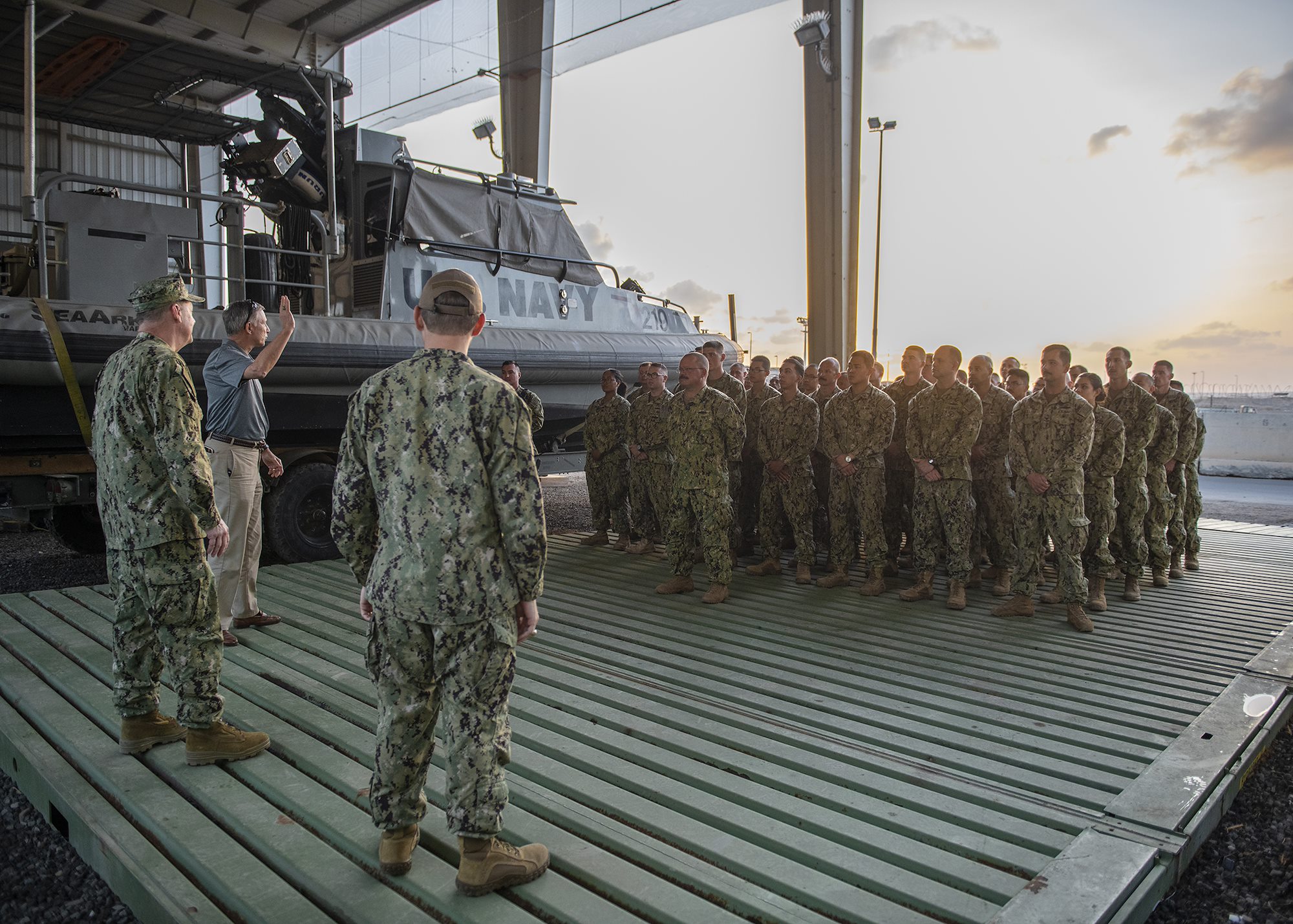 Assistant Secretary of the Navy (Manpower and Reserve Affairs), retired U.S. Navy Rear Adm. Gregory J. Slavonic speaks to Sailors from Coastal Riverine Squadron 11, assigned to Combined Joint Task Force - Horn of Africa, while visiting Camp Lemonnier, Djibouti, Feb. 3, 2019. Slavonic visited as part of a tour of Reserve units to answer questions, discuss leadership initiatives and interact with local Sailors. (U.S. Air Force photo by Tech. Sgt. Shawn Nickel)