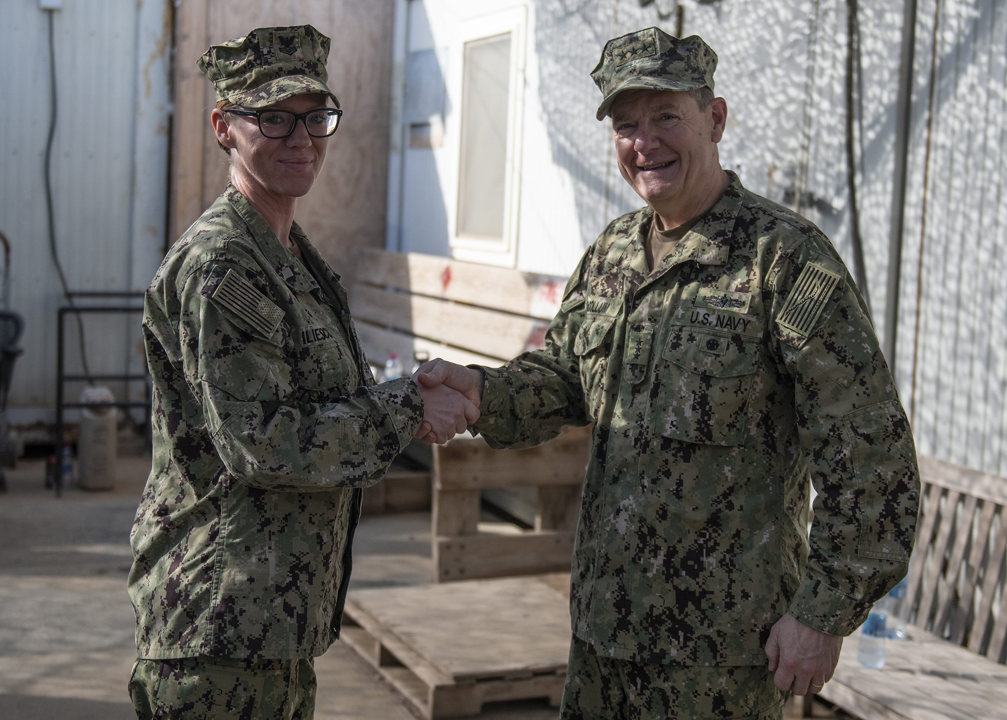 Chief of Navy Reserve Vice Adm. Luke McCollum presents a coin to U.S. Navy Petty Officer 2nd Class Kristina Iliesco, a Seabee from Naval Mobile Construction Battalion 1, assigned to Combined Joint Task Force - Horn of Africa, while visiting Camp Lemonnier, Djibouti, Feb. 3, 2019. McCollum visited as part of a tour of Reserve units to answer questions, discuss leadership initiatives and interact with local Sailors. (U.S. Air Force photo by Tech. Sgt. Shawn Nickel)