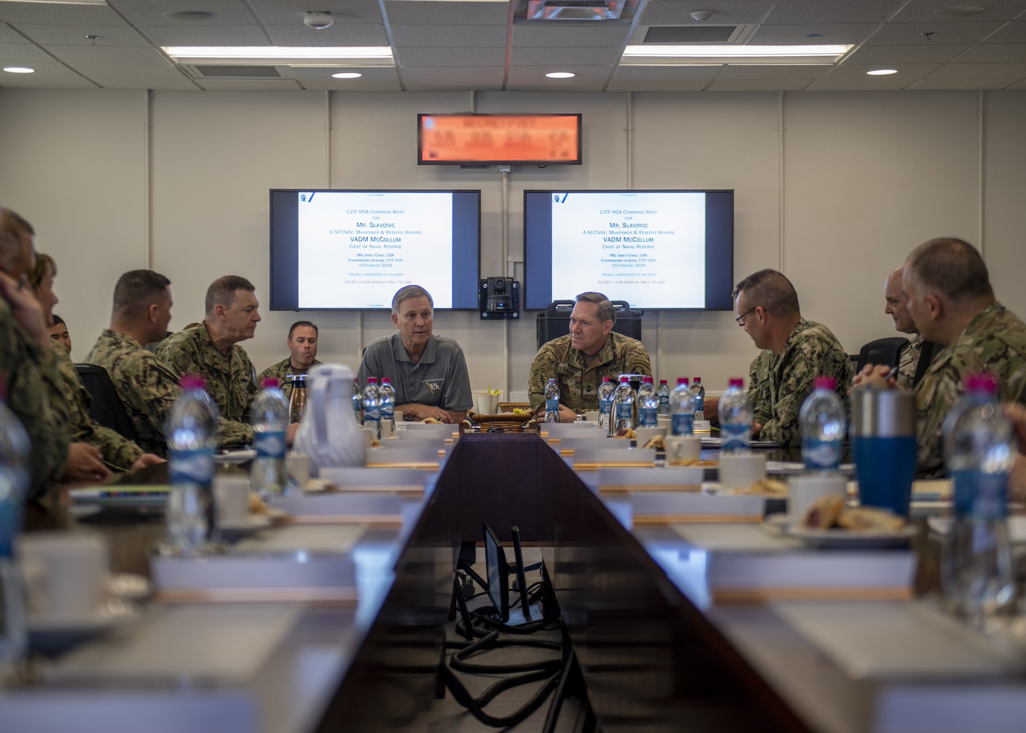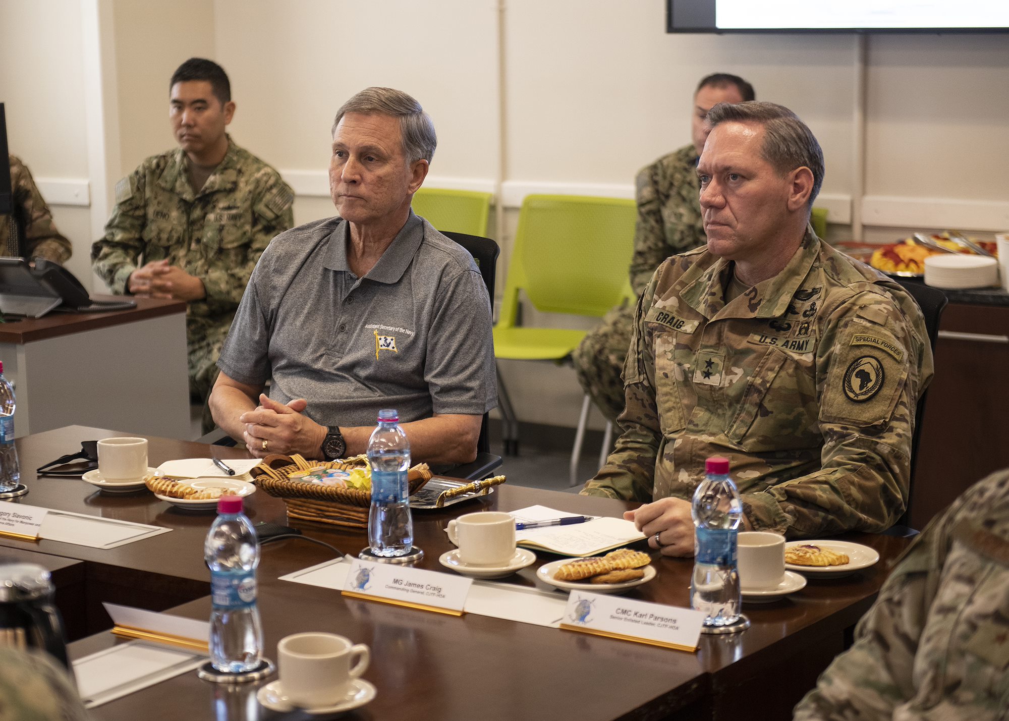 Assistant Secretary of the Navy (Manpower and Reserve Affairs), retired U.S. Navy Rear Adm. Gregory J. Slavonic, left, and U.S. Army Maj. Gen. James D. Craig, commanding general, Combined Joint Task Force-Horn of Africa, listen to a speaker during a unit mission brief about operations in the Horn of Africa while visiting Camp Lemonnier, Djibouti, Feb. 3, 2019. Slavonic visited as part of a tour of Reserve units to answer questions, discuss leadership initiatives and interact with local Sailors. (U.S. Air Force photo by Tech. Sgt. Shawn Nickel)