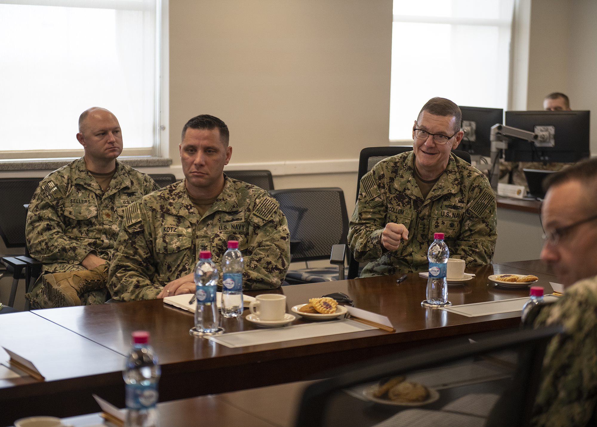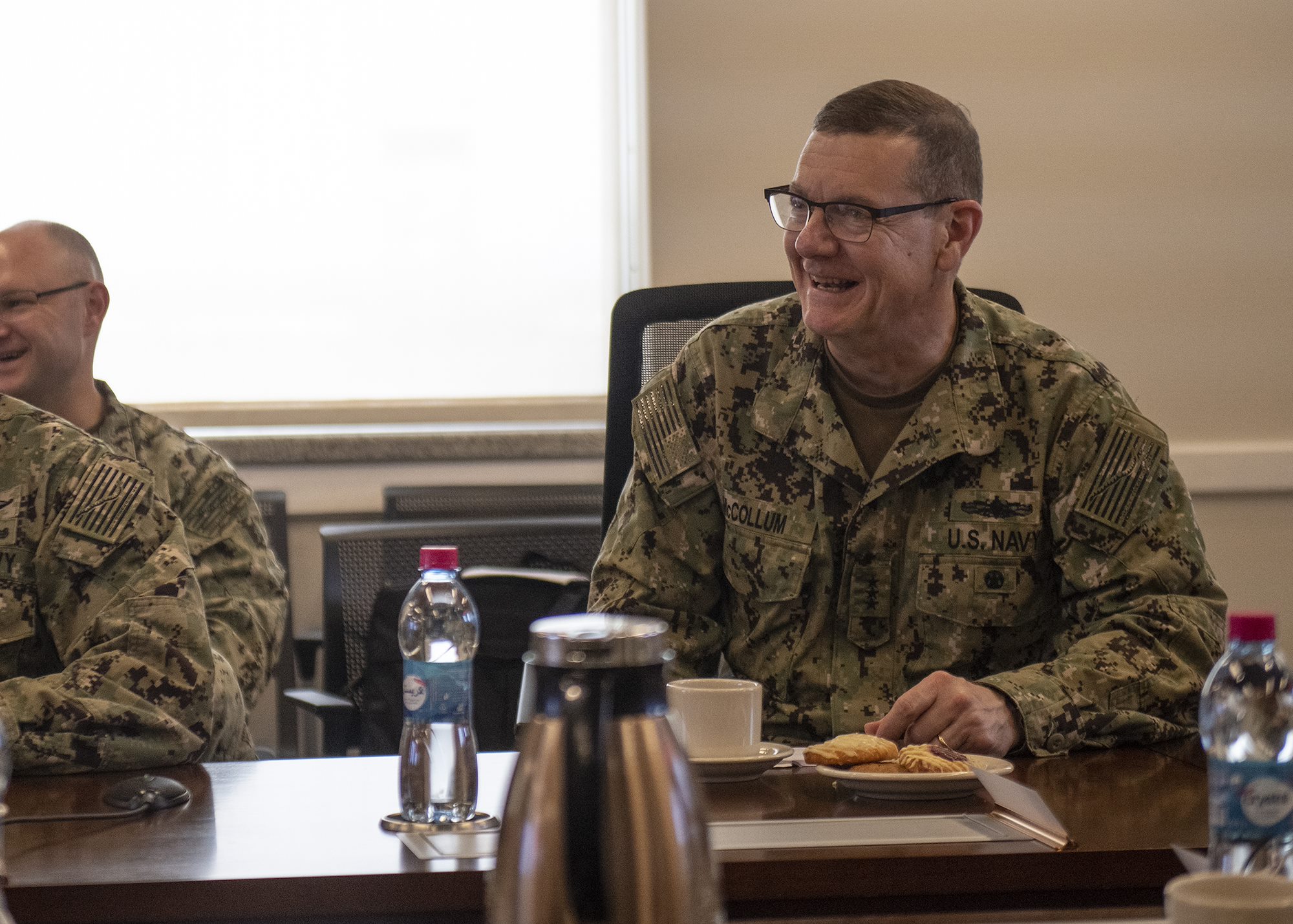 Chief of Navy Reserve Vice Adm. Luke McCollum laughs during a meeting with Combined Joint Task Force - Horn of Africa leadership during a unit mission brief about operations in the Horn of Africa while visiting Camp Lemonnier, Djibouti, Feb. 3, 2019. McCollum visited as part of a tour of Reserve units to answer questions, discuss leadership initiatives and interact with local Sailors. (U.S. Air Force photo by Tech. Sgt. Shawn Nickel)