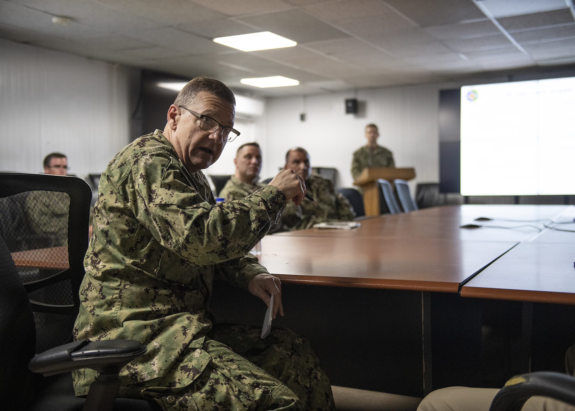 Chief of Navy Reserve Vice Adm. Luke McCollum asks a question during a Coastal Riverine Squadron 11, Combined Joint Task Force - Horn of Africa, unit mission brief while visiting Camp Lemonnier, Djibouti, Feb. 3, 2019. McCollum visited as part of a tour of Reserve units to answer questions, discuss leadership initiatives and interact with local Sailors. (U.S. Air Force photo by Tech. Sgt. Shawn Nickel)