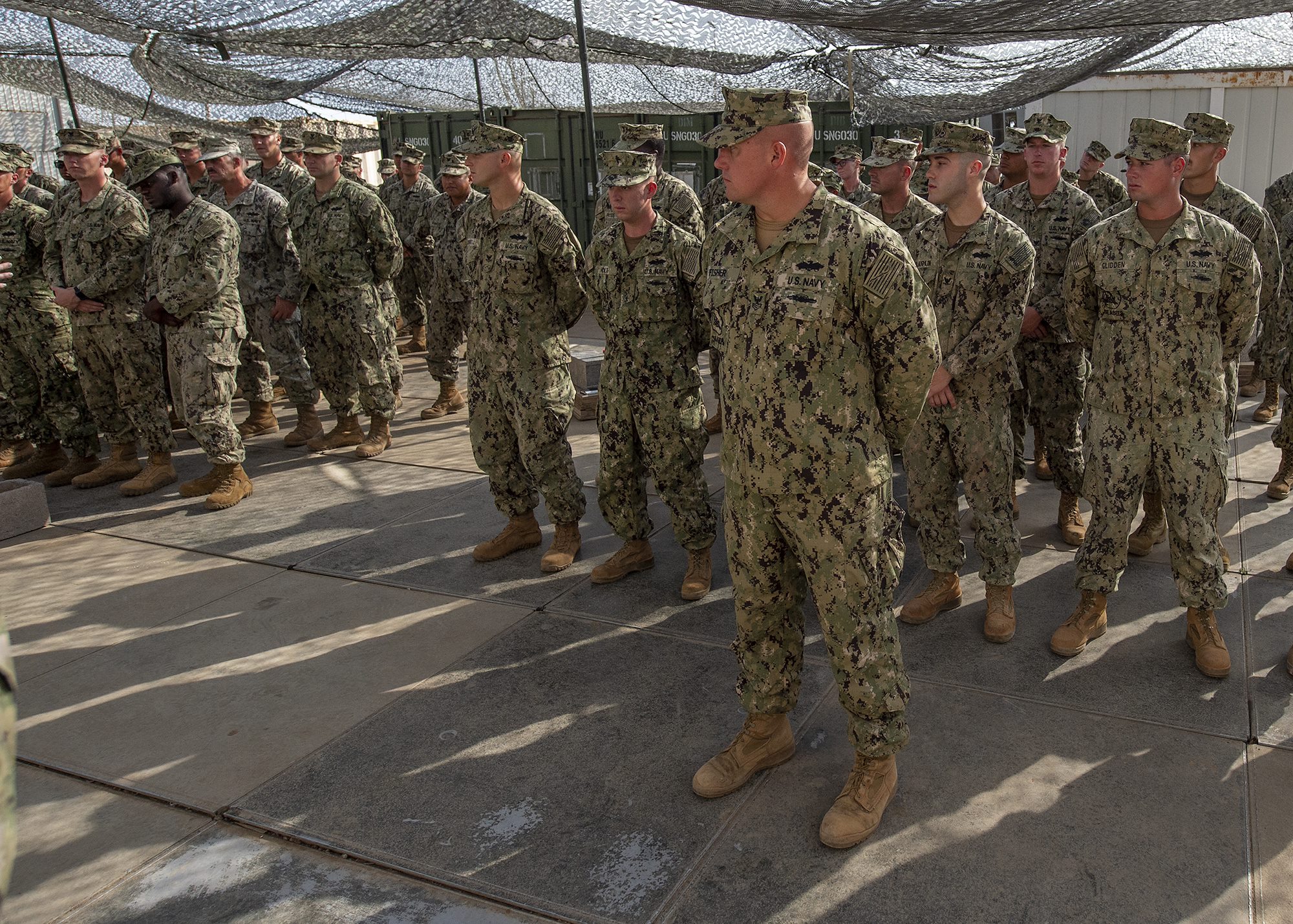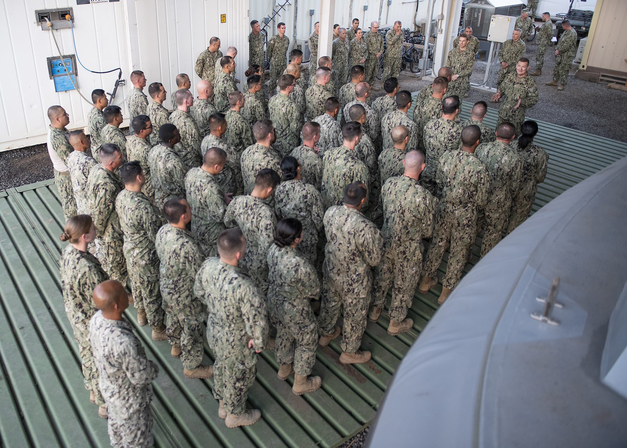 U.S. Navy Seabees from Naval Mobile Construction Battalion 1 (NMCB 1), assigned to Combined Joint Task Force - Horn of Africa, stand in formation while listening to Chief of Navy Reserve Vice Adm. Luke McCollum, and Assistant Secretary of the Navy (Manpower and Reserve Affairs) and retired Rear Adm. Gregory J. Slavonic address the Seabees from NMCB 1 while visiting Camp Lemonnier, Djibouti, Feb. 3, 2019. Slavonic and McCollum visited as part of a tour of Reserve units to answer questions, discuss leadership initiatives and interact with local Sailors. (U.S. Air Force photo by Tech. Sgt. Shawn Nickel)