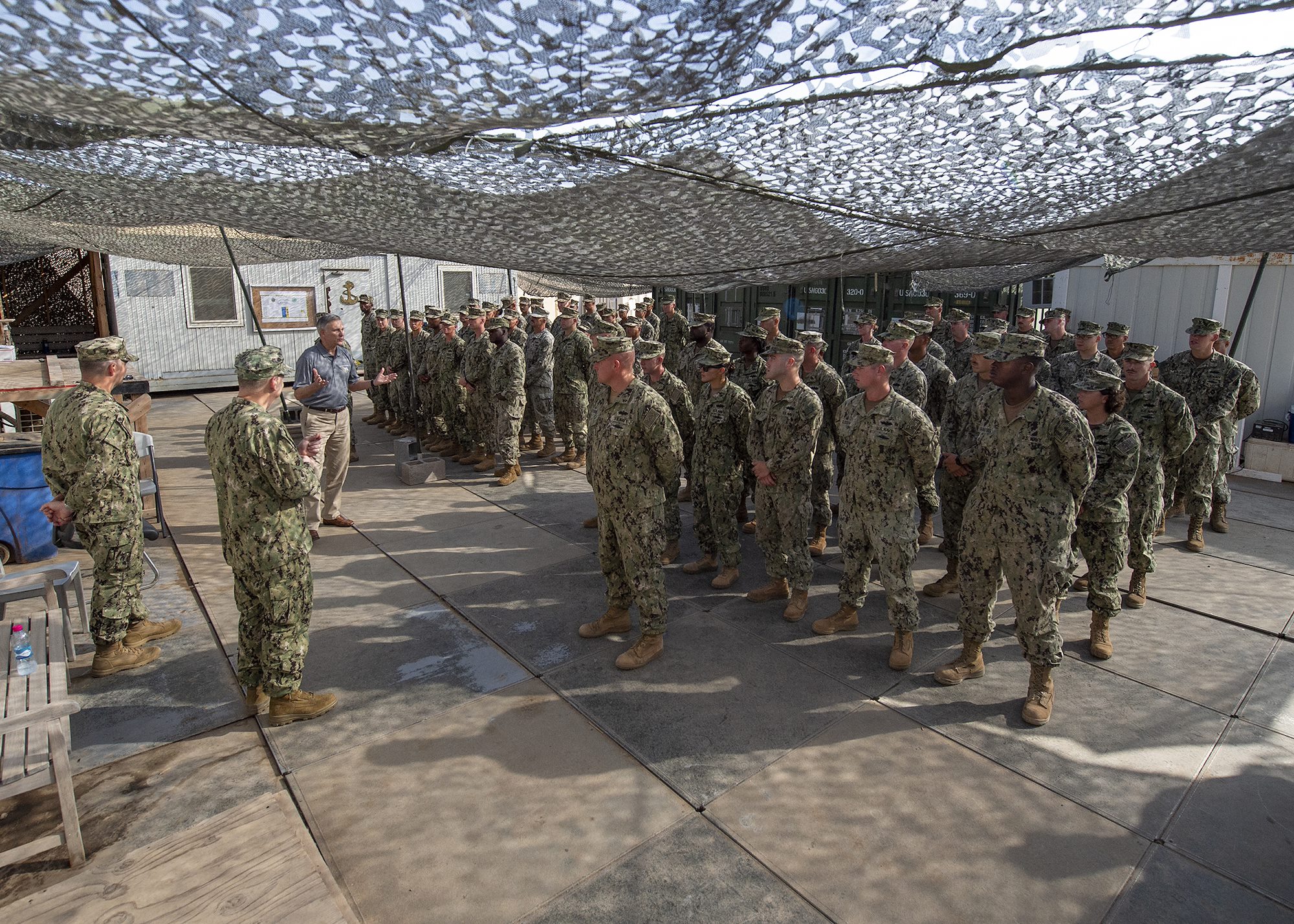 Assistant Secretary of the Navy (Manpower and Reserve Affairs), retired U.S. Navy Rear Adm. Gregory J. Slavonic addresses U.S. Navy Seabees, from Naval Mobile Construction Battalion 1, assigned to Combined Joint Task Force - Horn of Africa, while visiting Camp Lemonnier, Djibouti, Feb. 3, 2019. Slavonic visited as part of a tour of Reserve units to answer questions, discuss leadership initiatives and interact with local Sailors. (U.S. Air Force photo by Tech. Sgt. Shawn Nickel)