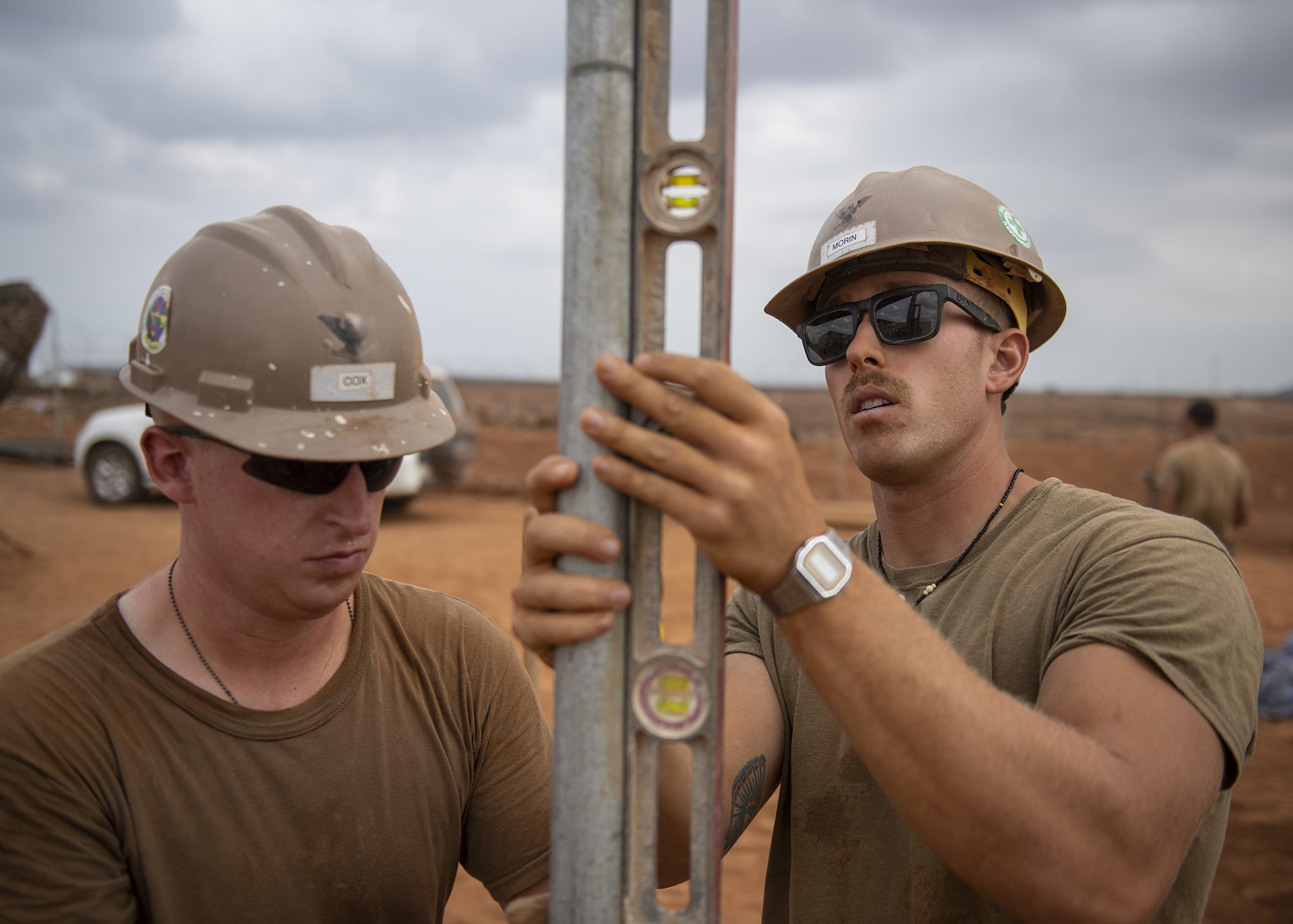 U.S. Navy Petty Officer 3rd Class Austin Cox, left, and Michael Morin, Seabees assigned to Naval Mobile Construction Battalion 1, Combined Joint Task Force-Horn of Africa, Camp Lemonnier, Djibouti, build a fence during the construction of the future Ali Oune, Djibouti, Women’s Medical Clinic, Dec. 27, 2018. The clinic is intended to enhance the Ministry of Health for Djibouti’s ability to provide basic medical, birth and after care to the Ali Oune village and its more than 1,000 residents and rural neighbors. (U.S. Air Force photo by Tech. Sgt. Shawn Nickel)