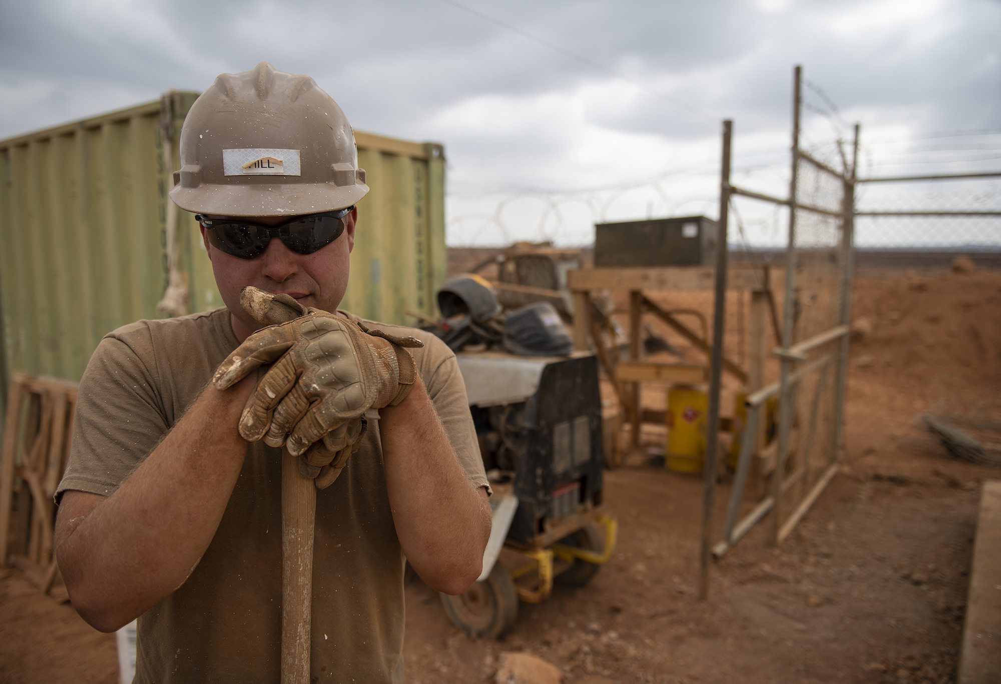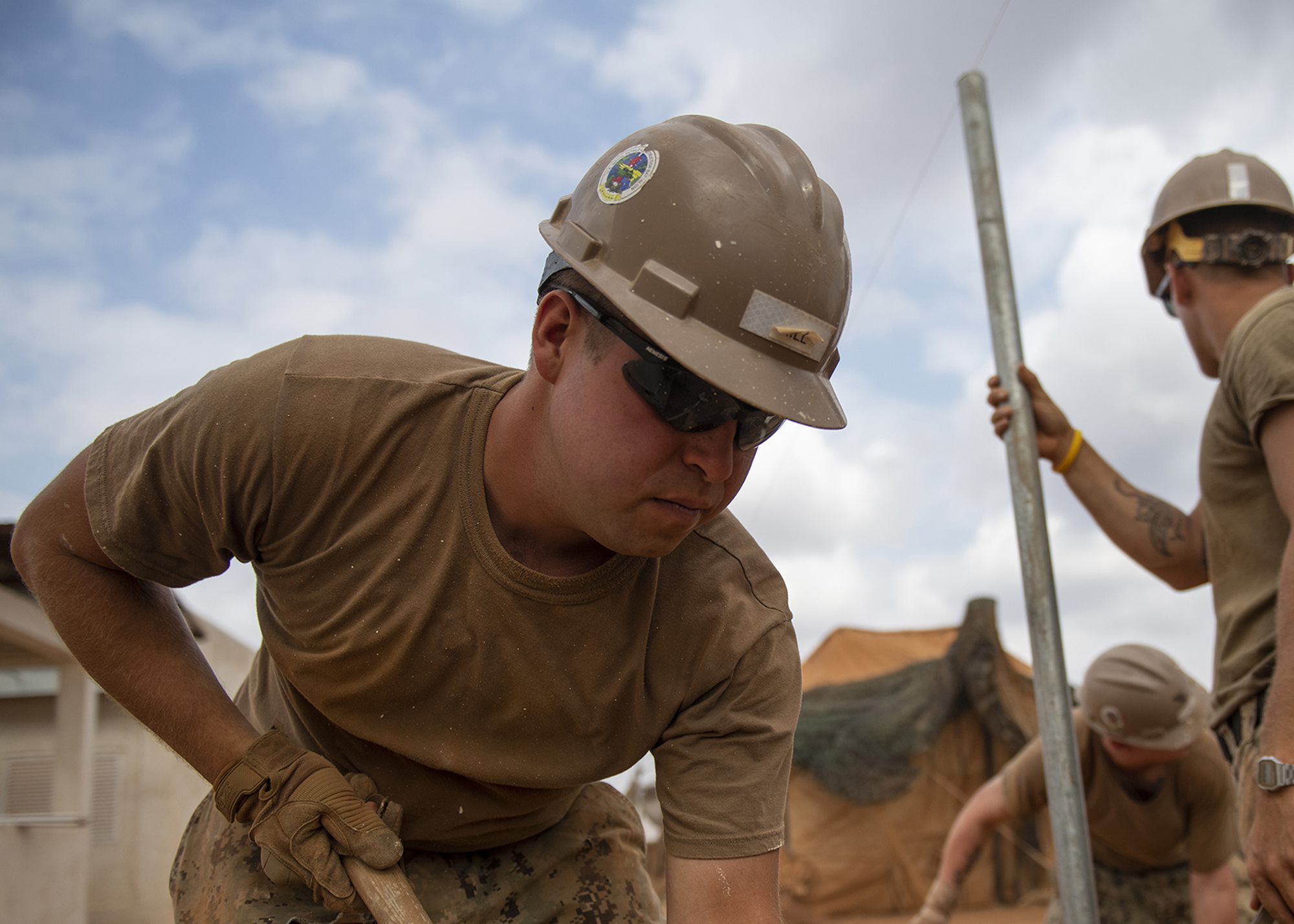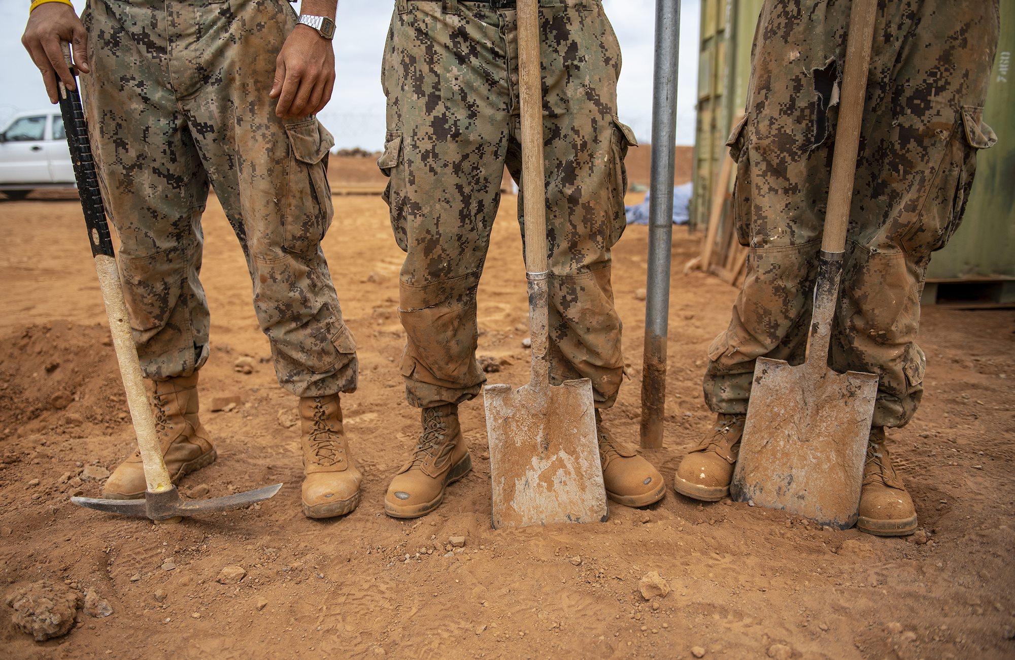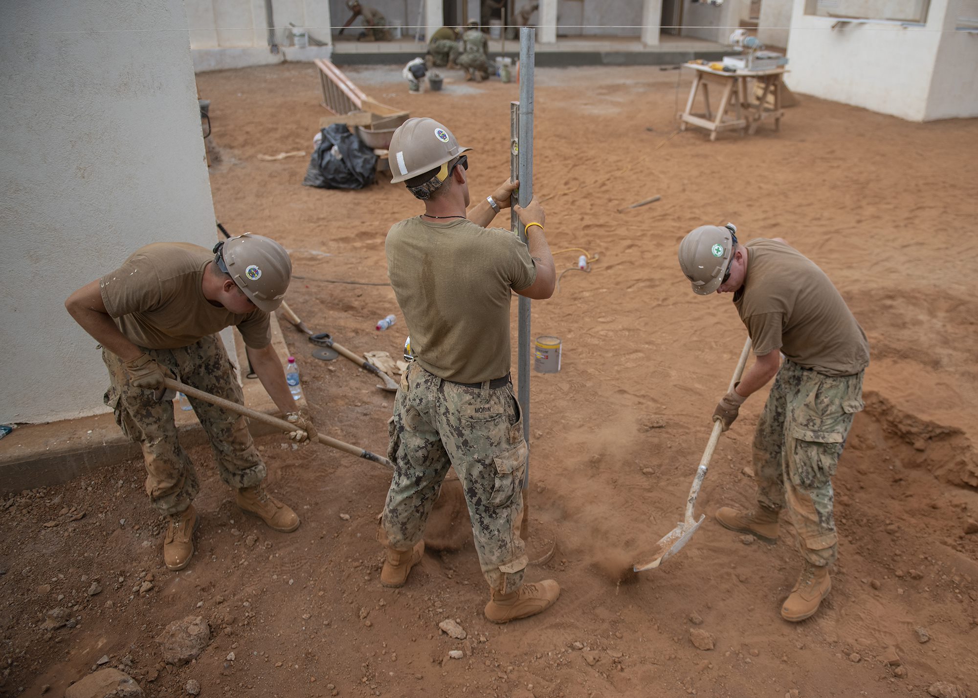U.S. Navy Seabees assigned to Naval Mobile Construction Battalion 1, Combined Joint Task Force-Horn of Africa, Camp Lemonnier, Djibouti, wait for a piece of heavy equipment while building a fence during the construction of the future Ali Oune, Djibouti, Women’s Medical Clinic, Dec. 27, 2018. The clinic is intended to enhance the Ministry of Health for Djibouti’s ability to provide basic medical, birth and after care to the Ali Oune village and its more than 1,000 residents and rural neighbors. (U.S. Air Force photo by Tech. Sgt. Shawn Nickel)
