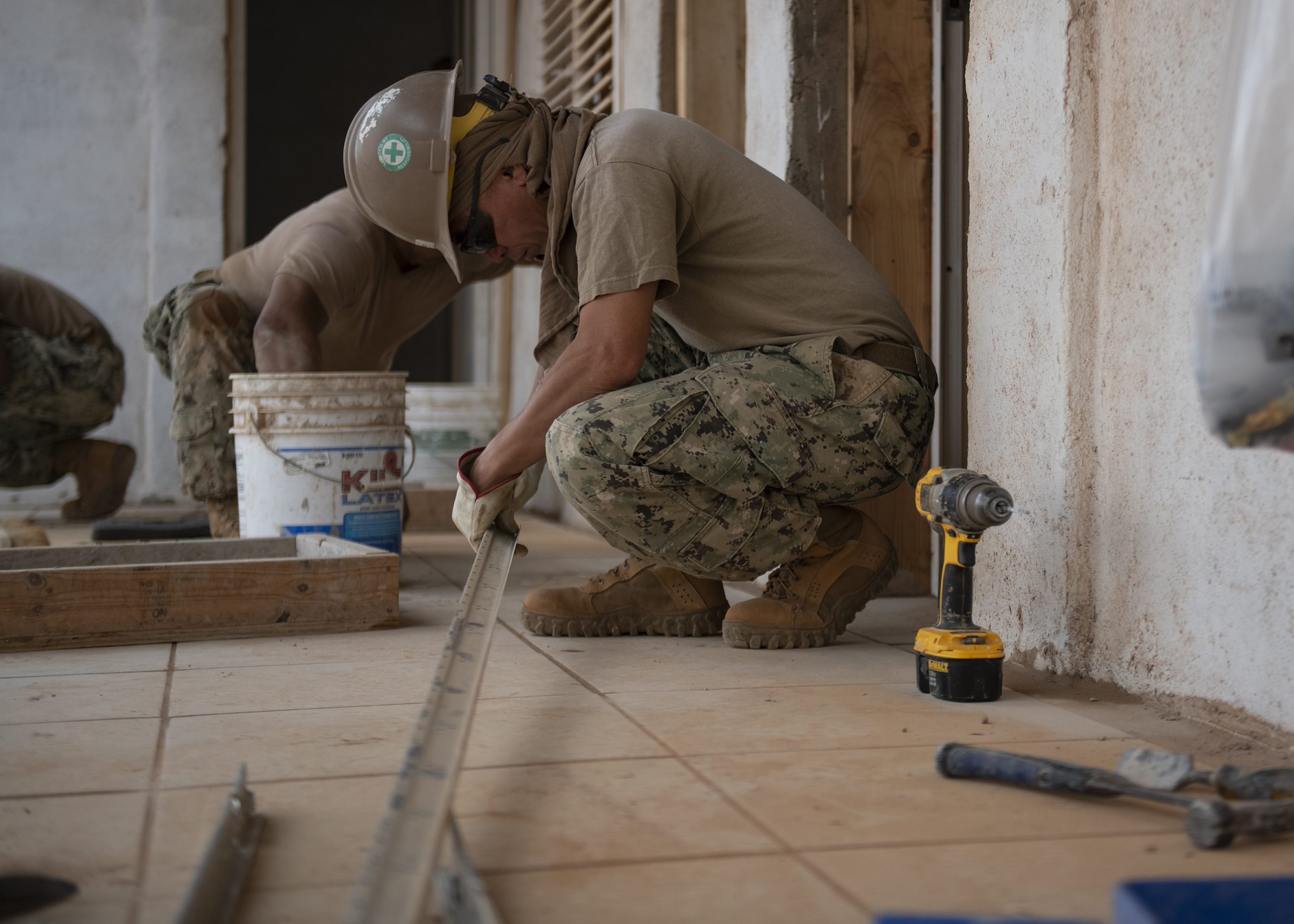 A U.S. Navy Seabee assigned to Naval Mobile Construction Battalion 1, Combined Joint Task Force-Horn of Africa, Camp Lemonnier, Djibouti, works on a drop ceiling during the construction of the future Ali Oune, Djibouti, Women’s Medical Clinic, Dec. 27, 2018. The clinic is intended to enhance the Ministry of Health for Djibouti’s ability to provide basic medical, birth and after care to the Ali Oune village and its more than 1,000 residents and rural neighbors. (U.S. Air Force photo by Tech. Sgt. Shawn Nickel)