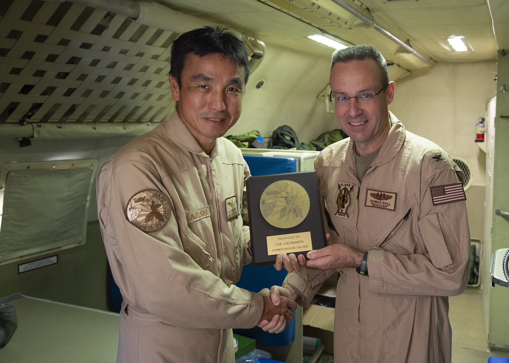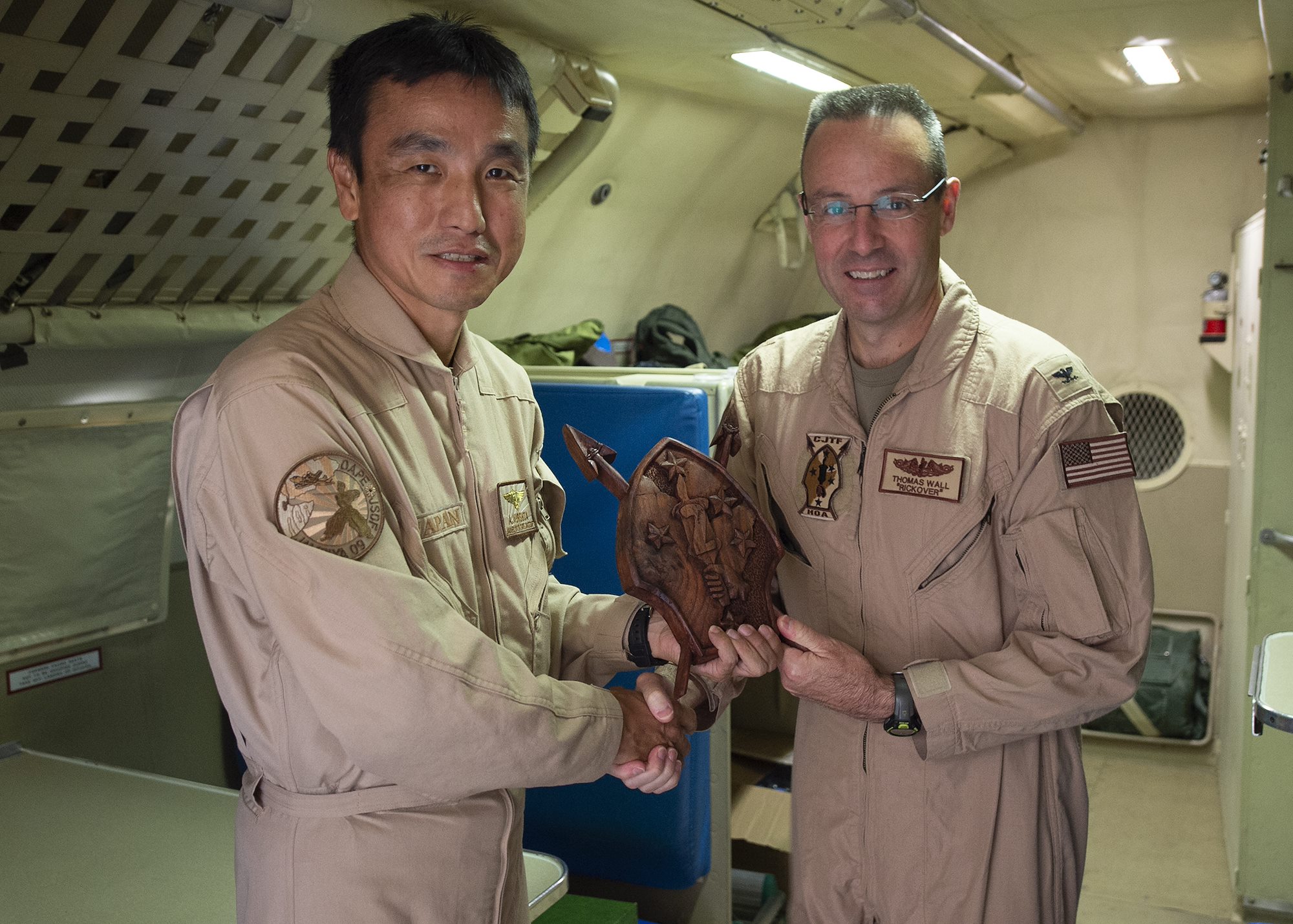 U.S. Navy Capt. Thomas Wall, chief of staff for Combined Joint Task Force-Horn of Africa (CJTF-HOA), right, and Japan Maritime Self-Defense Force Cmdr. Akihiko Kurishita, commander of Deployment Air Force for Counter-Piracy Operations, Djibouti, exchange gifts after a P-3C Orion familiarization flight Jan. 19, 2019 in Djibouti, Djibouti. Leadership from CJTF-HOA took the flight to gain a better perspective of the JMSDF mission. (U.S. Air Force photo by Tech. Sgt. Shawn Nickel)