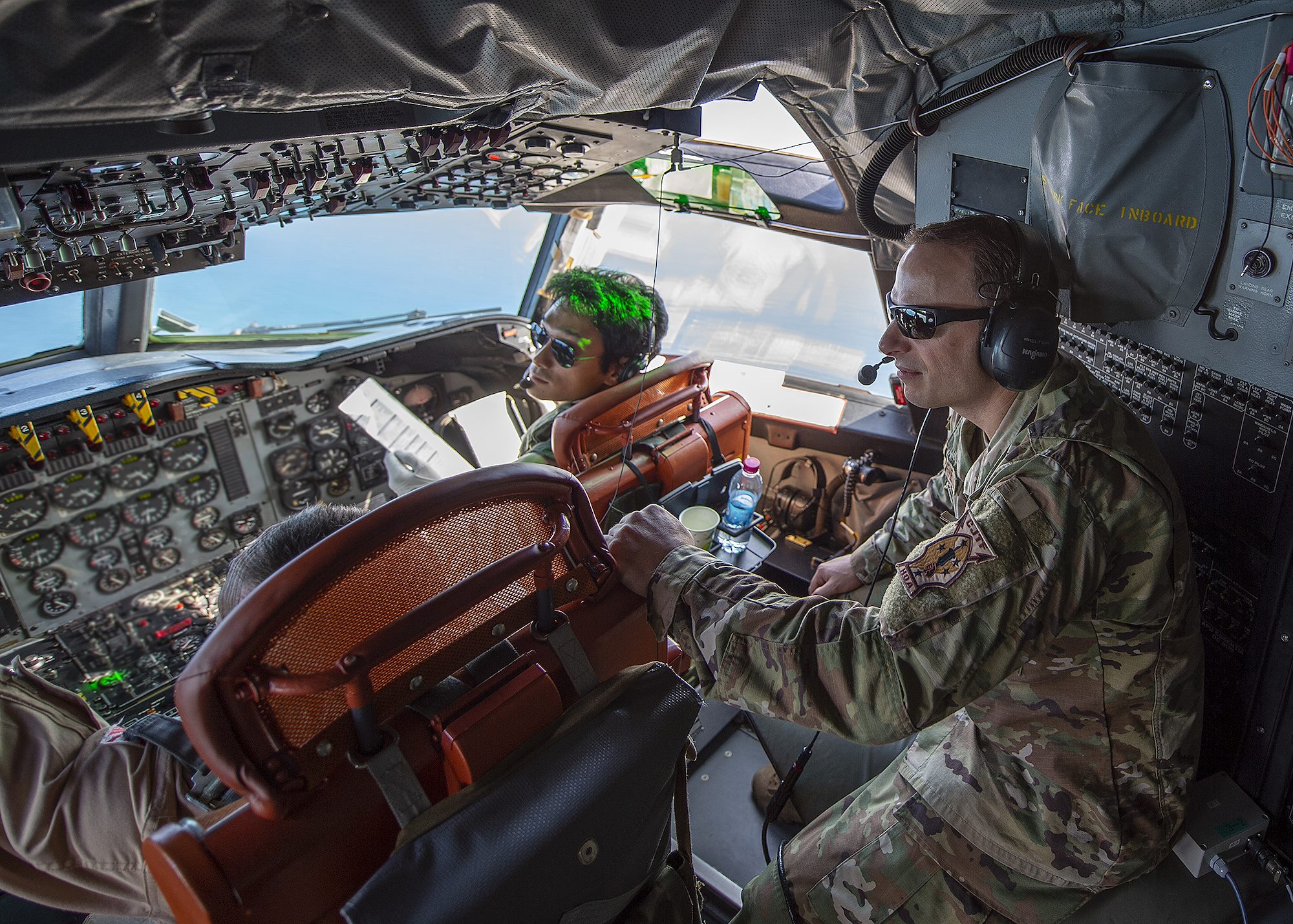 U.S. Air Force Lt. Col. Michael Mansfield, deputy chief of staff for Combined Joint Task Force-Horn of Africa (CJTF-HOA), looks out the cockpit of a Japan Maritime Self-Defense Force (JMSDF) P-3C Orion during a familiarization flight Jan. 19, 2019 in Djibouti, Djibouti. Leadership from CJTF-HOA took the flight to gain a better perspective of the JMSDF mission. (U.S. Air Force photo by Tech. Sgt. Shawn Nickel)