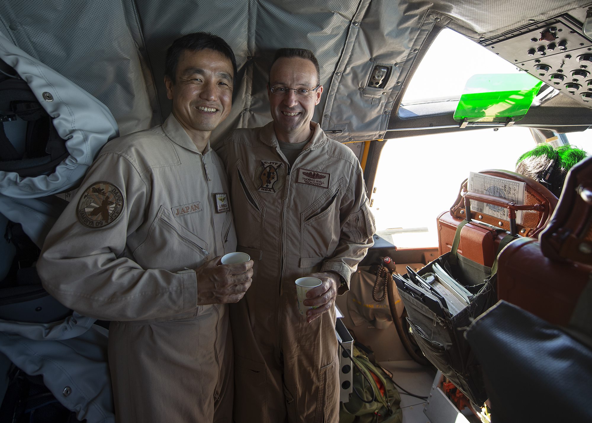 U.S. Navy Capt. Thomas Wall, chief of staff for Combined Joint Task Force-Horn of Africa (CJTF-HOA), right, and Japan Maritime Self-Defense Force Cmdr. Akihiko Kurishita, commander of Deployment Air Force for Counter-Piracy Operations, Djibouti, pose for a photo during a P-3C Orion familiarization flight Jan. 19, 2019 in Djibouti, Djibouti. Leadership from CJTF-HOA took the flight to gain a better perspective of the JMSDF mission. (U.S. Air Force photo by Tech. Sgt. Shawn Nickel)