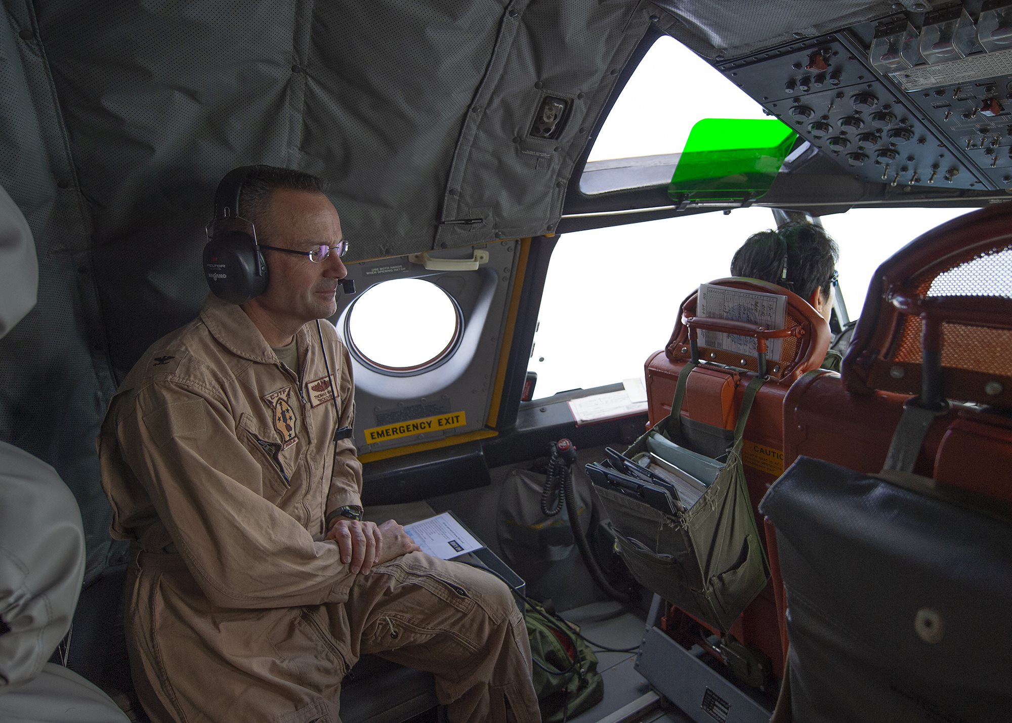 U.S. Navy Capt. Thomas Wall, chief of staff for Combined Joint Task Force-Horn of Africa (CJTF-HOA), looks out the cockpit of a Japan Maritime Self-Defense Force (JMSDF) P-3C Orion during a familiarization flight Jan. 19, 2019 in Djibouti, Djibouti. Leadership from CJTF-HOA took the flight to gain a better perspective of the JMSDF mission. (U.S. Air Force photo by Tech. Sgt. Shawn Nickel)