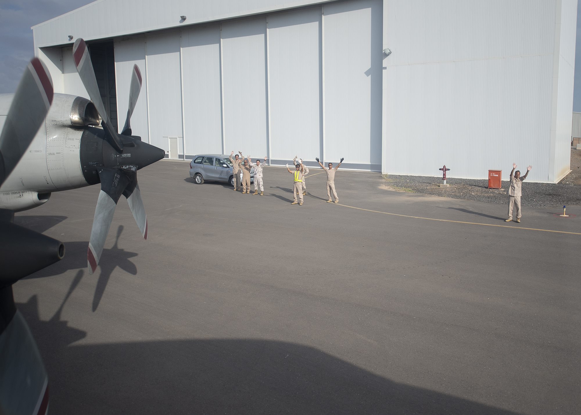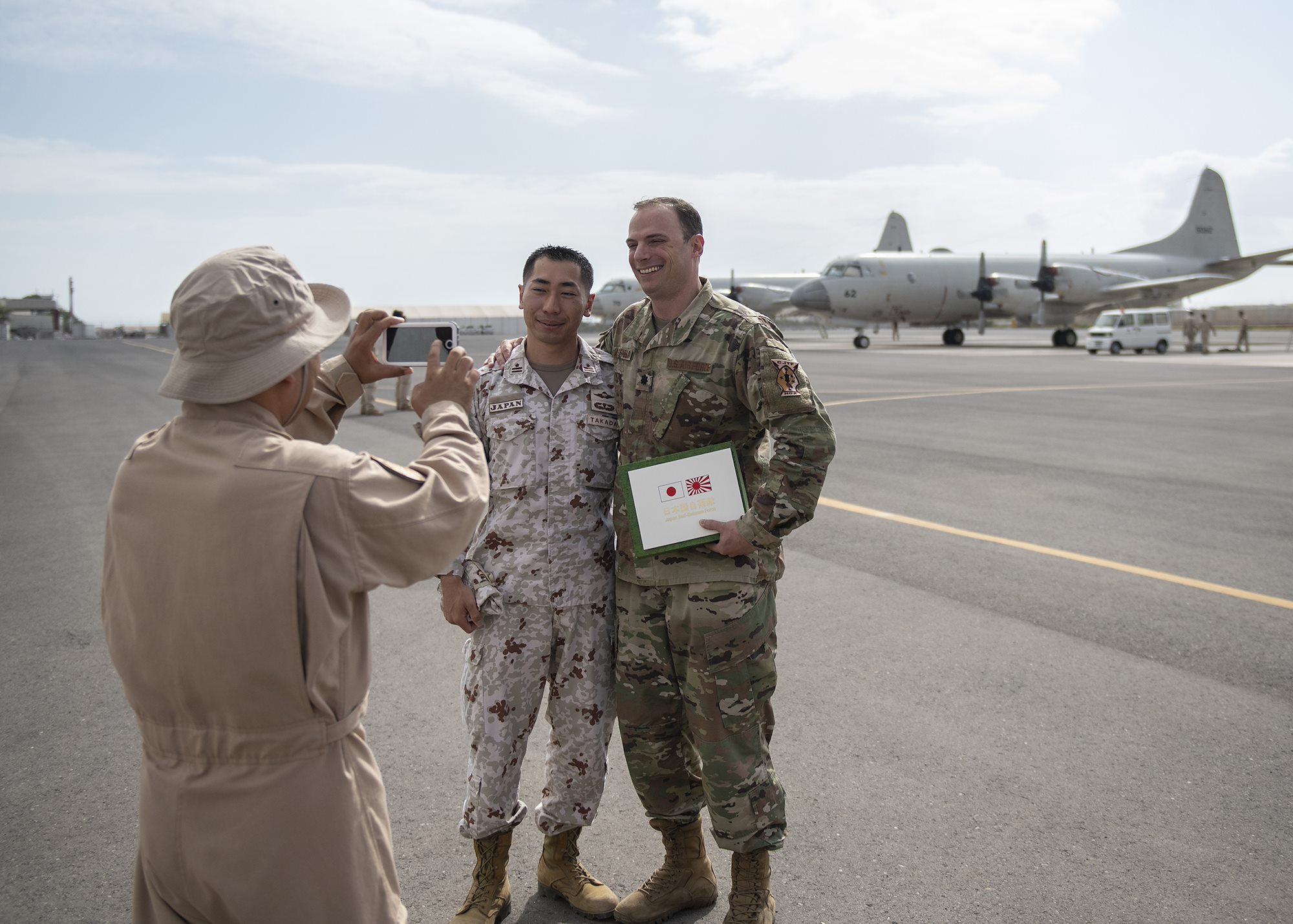 Japan Maritime Self-Defense Force (JMSDF) members assigned to Deployment Air Force for Counter-Piracy Operations, Djibouti, bid farewell to Combined Joint Task Force-Horn of Africa leadership prior to a P-3C Orion familiarization flight Jan. 19, 2019 in Djibouti, Djibouti. Leadership from CJTF-HOA took the flight to gain a better perspective of the JMSDF mission. (U.S. Air Force photo by Tech. Sgt. Shawn Nickel)