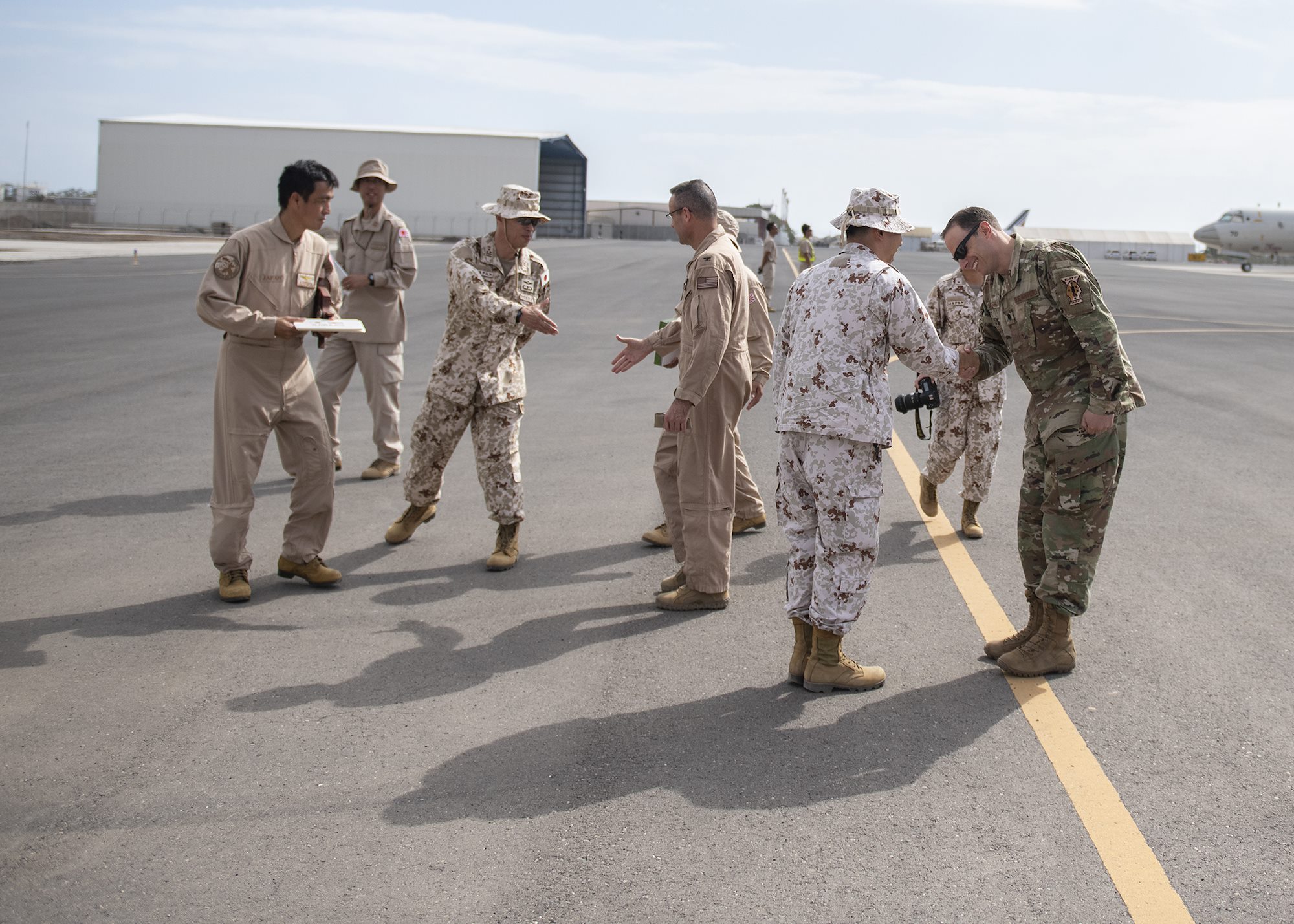 Combined Joint Task Force-Horn of Africa (CJTF-HOA) and Japan Maritime Self-Defense Force (JMSDF) leadership greet each other after a P-3C Orion familiarization flight Jan. 19, 2019 in Djibouti, Djibouti. Leadership from CJTF-HOA took the flight to gain a better perspective of the JMSDF mission. (U.S. Air Force photo by Tech. Sgt. Shawn Nickel)