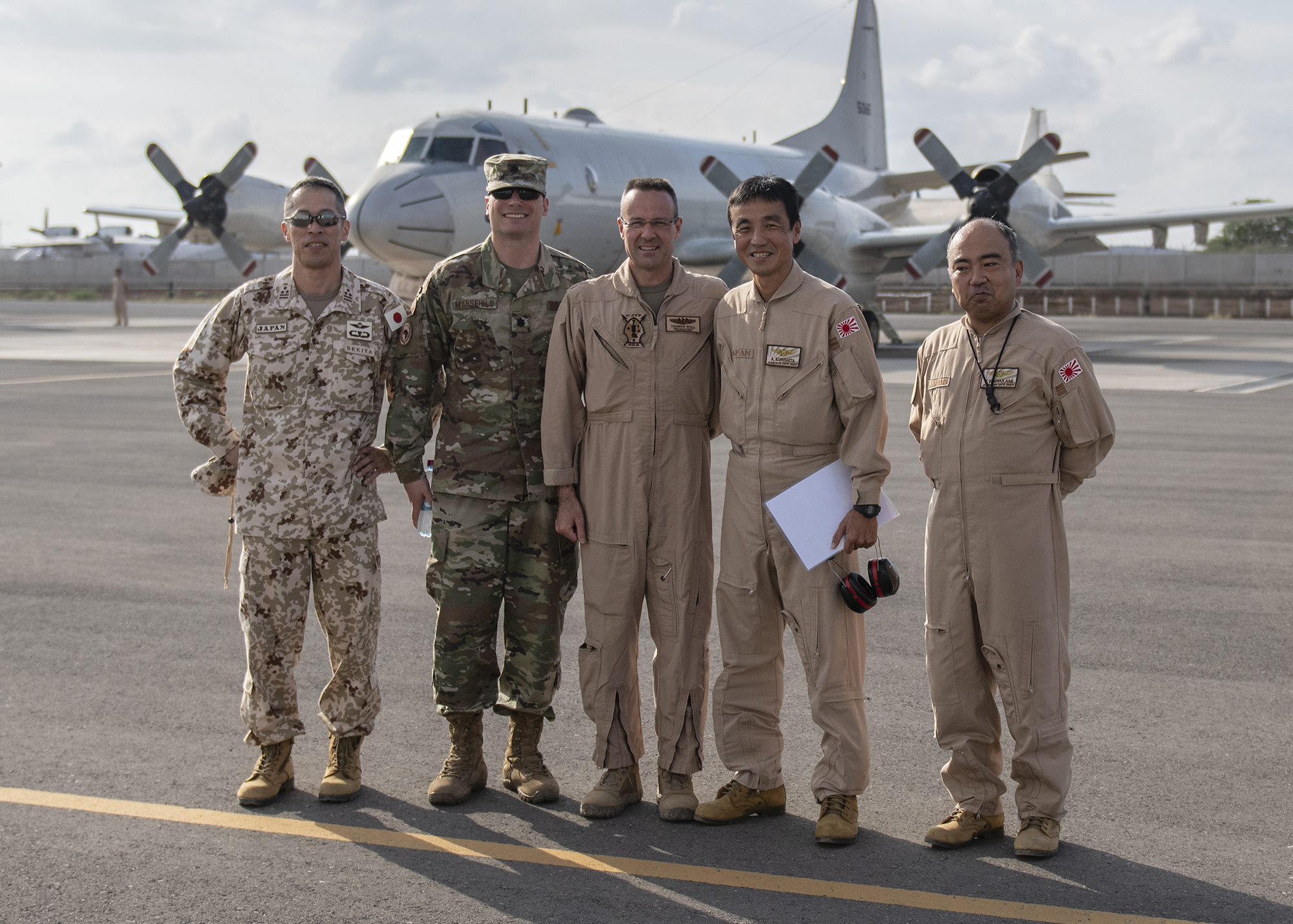Combined Joint Task Force-Horn of Africa (CJTF-HOA) and Japan Maritime Self-Defense Force (JMSDF) leadership pose for a photo after a P-3C Orion familiarization flight Jan. 19, 2019 in Djibouti, Djibouti. Leadership from CJTF-HOA took the flight to gain a better perspective of the JMSDF mission. (U.S. Air Force photo by Tech. Sgt. Shawn Nickel)