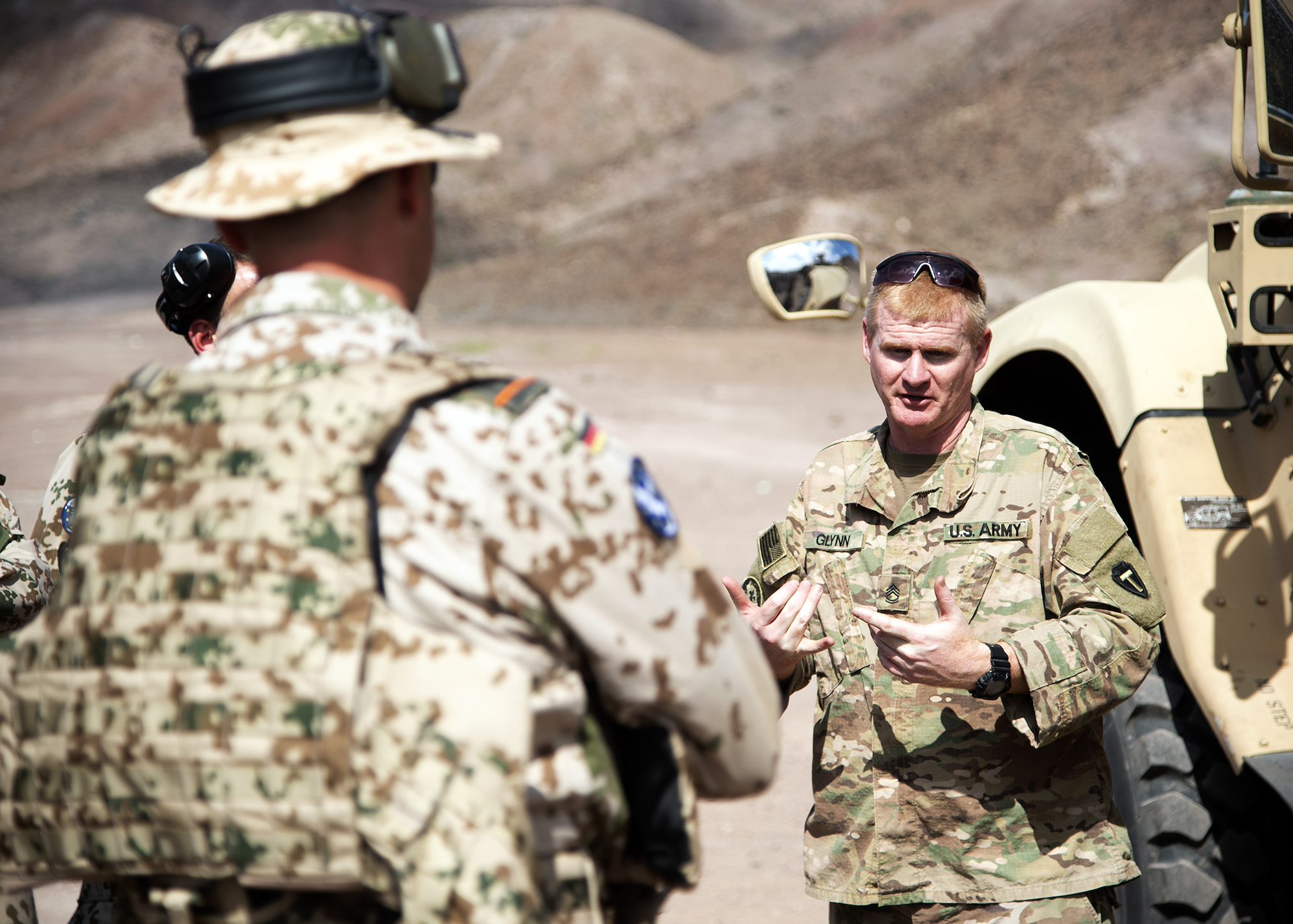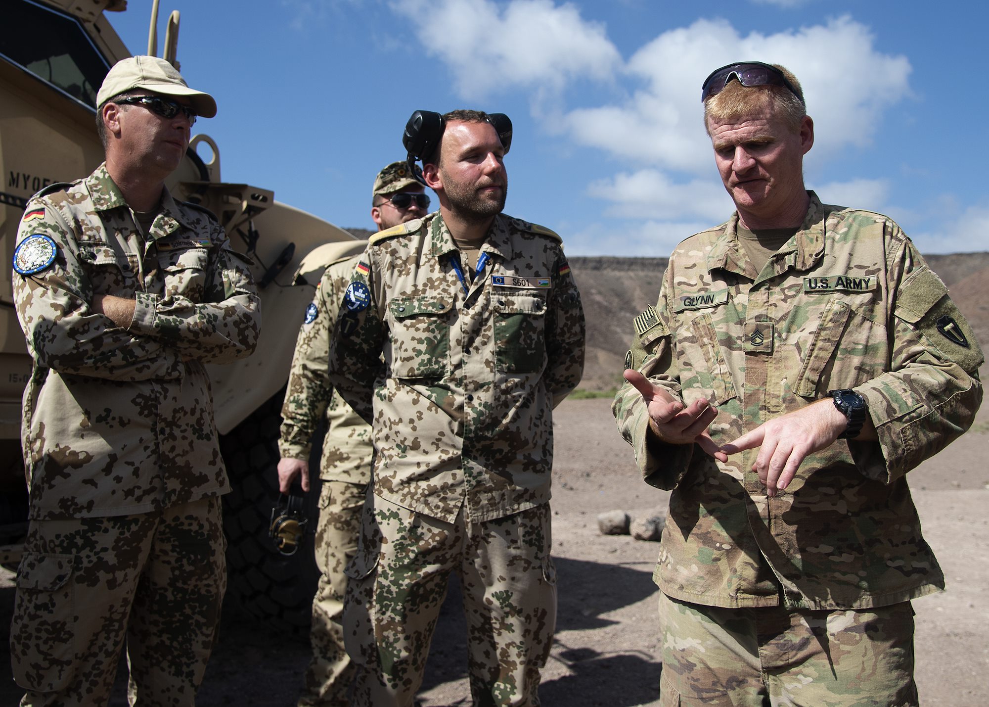 U.S. Army Sgt. 1st Class Brian Glynn, Delta Company, 1-141st Infantry Regiment, Task Force Alamo, Texas National Guard, assigned to Combined Joint Task Force-Horn of Africa (CJTF-HOA), Djibouti, discusses range safety with German military personnel prior to training at a military range in Djibouti, Jan. 19, 2019. Task Force Alamo is responsible for rapidly deploying in response to any crisis threatening U.S. personnel or property throughout CJTF-HOA, an area nearly half the size of the continental United States. (U.S. Navy photo by Mass Communication Specialist 1st Class Nick Scott)