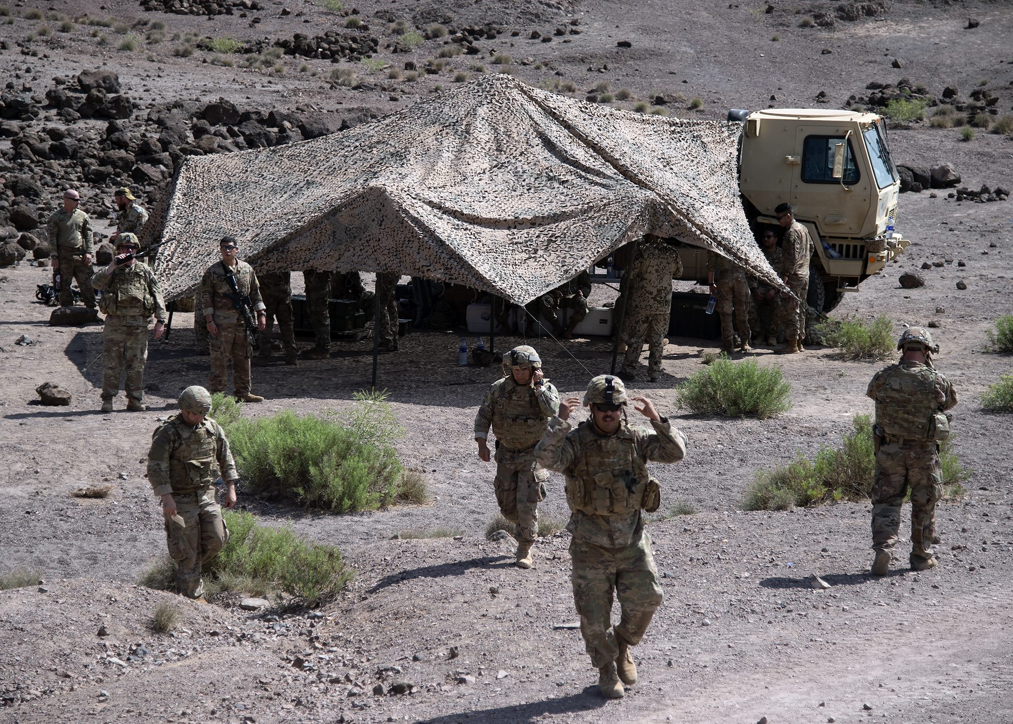 U.S. Army Soldiers from Task Force Alamo, Texas National Guard, assigned to Combined Joint Task Force-Horn of Africa (CJTF-HOA), Djibouti, prepare for a range exercise in Djibouti, Jan. 19, 2019. Task Force Alamo is responsible for rapidly deploying in response to any crisis threatening U.S. personnel or property throughout CJTF-HOA, an area nearly half the size of the continental United States. (U.S. Navy photo by Mass Communication Specialist 1st Class Nick Scott)