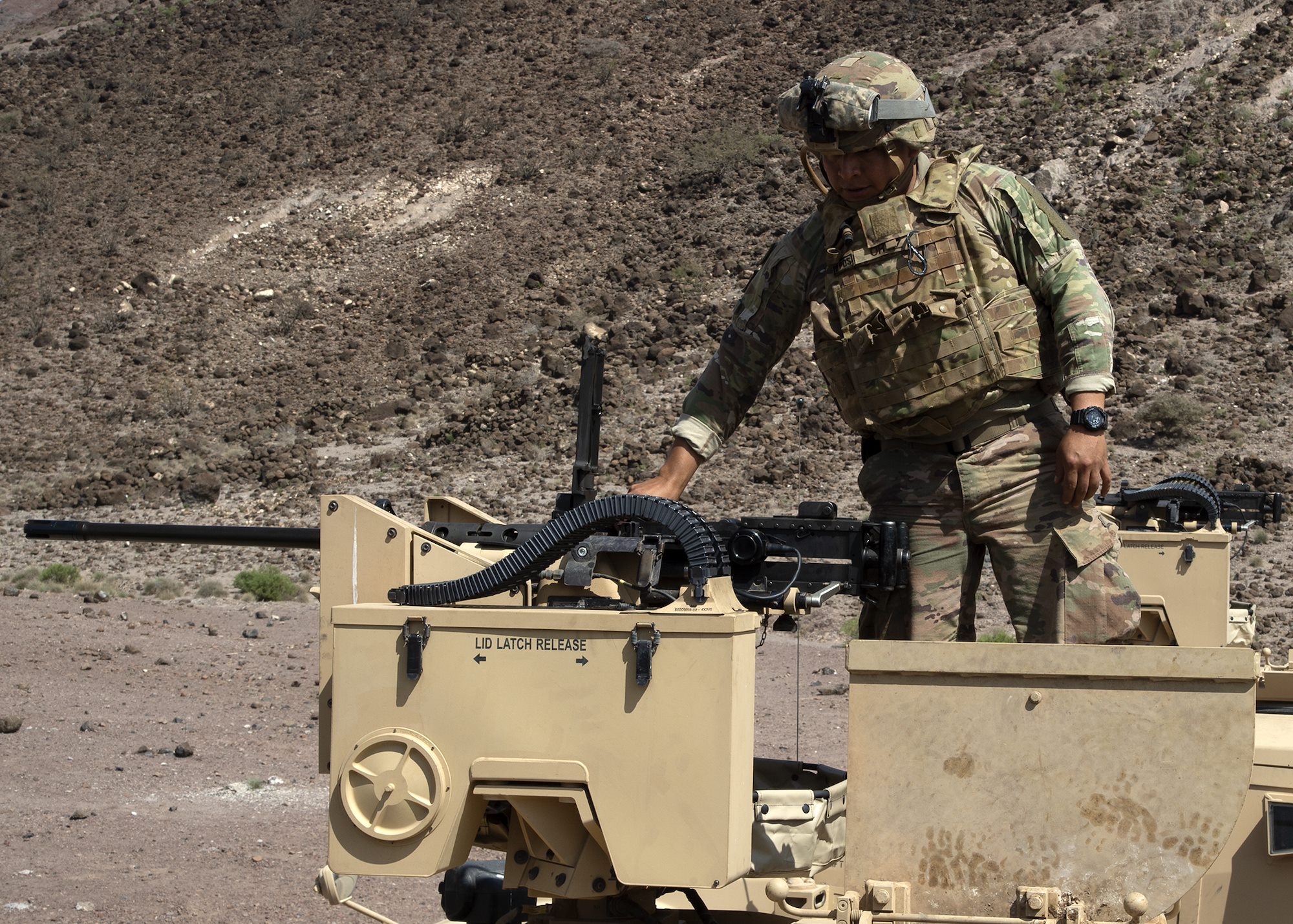 U.S. Army Spc. Luis Ortiz, Delta Company, 1-141st Infantry Regiment, Task Force Alamo, Texas National Guard, assigned to Combined Joint Task Force-Horn of Africa (CJTF-HOA), Djibouti, loads a .50-caliber machine gun at a military range in Djibouti, Jan. 19, 2019. Task Force Alamo is responsible for rapidly deploying in response to any crisis threatening U.S. personnel or property throughout CJTF-HOA, an area nearly half the size of the continental United States. (U.S. Navy photo by Mass Communication Specialist 1st Class Nick Scott)
