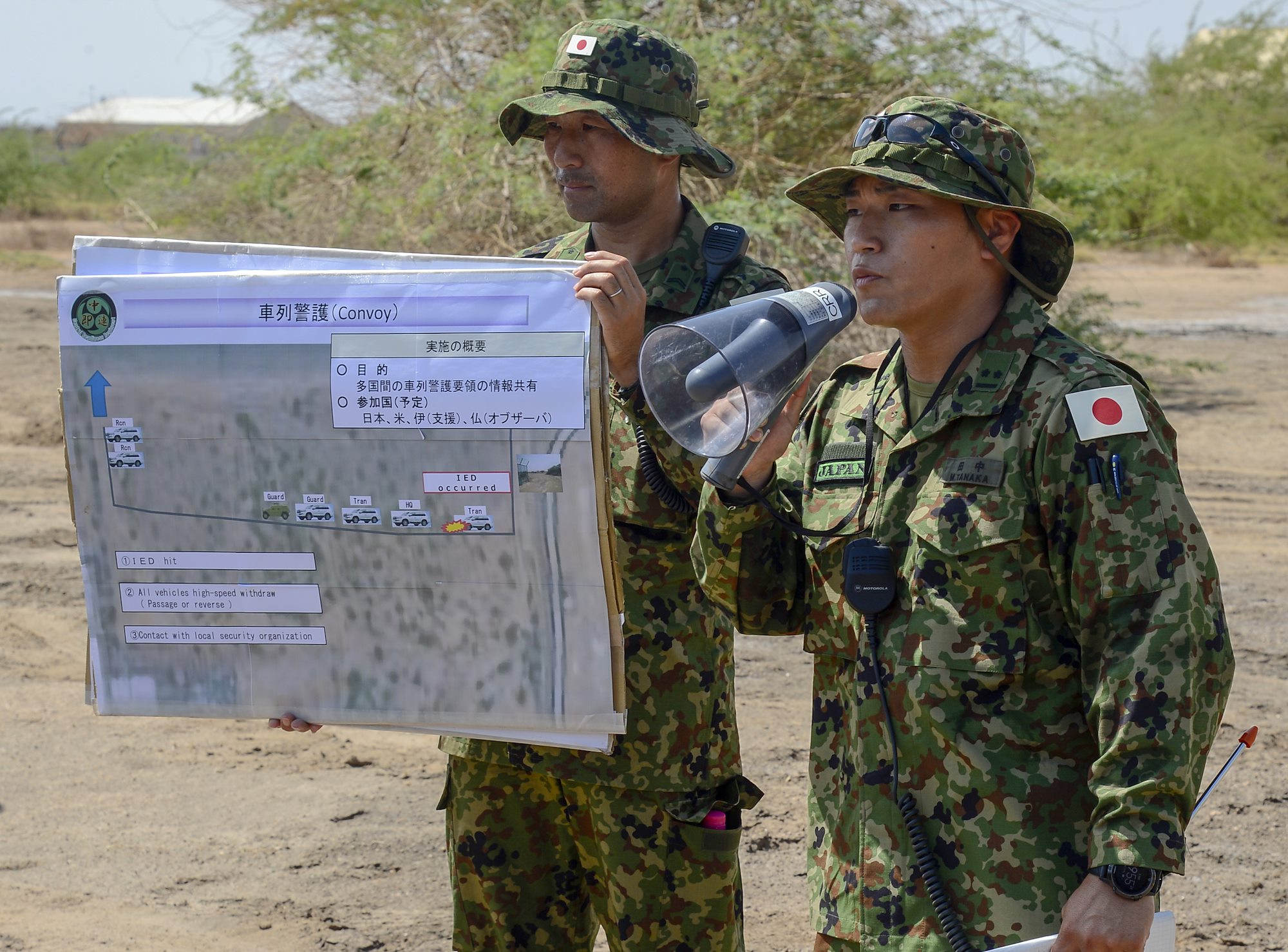 Japanese Self Defense Force 1st Lt. Masaki Tanaka presents a brief on Japanese convoy evacuation operations during a joint coalition exercise at Camp Lemonnier, Djibouti, Sep. 5, 2018. The joint exercise allowed coalition forces from Italy, Japan, France, and Djibouti to learn alongside the U.S. Army and exchane best practices. (U.S. Navy Photo by Mass Communication Specialist 2nd Class Timothy M. Ahearn)