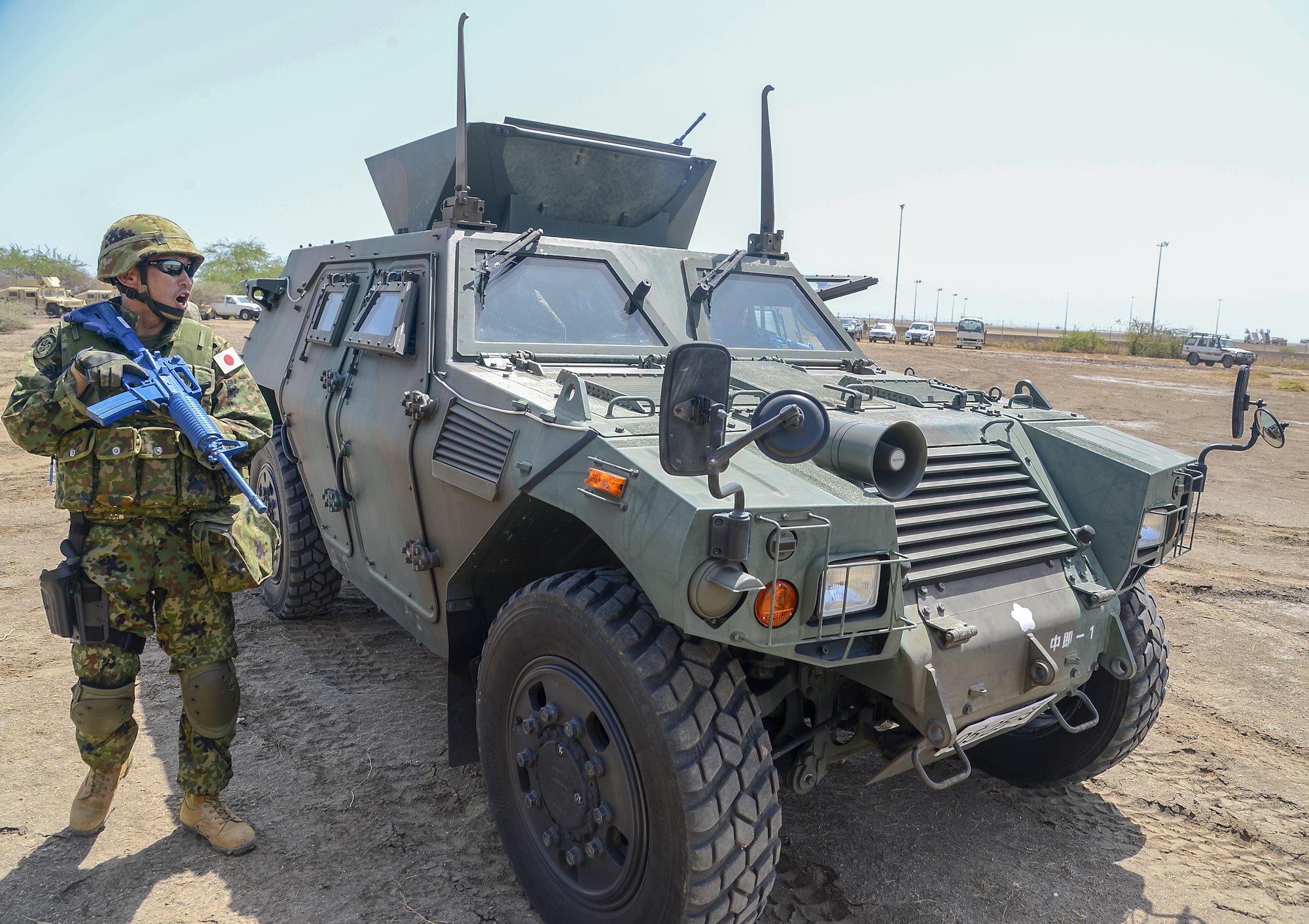 A Japanese Self Defense Force soldier participates in a convoy evacuation operation during a joint coalition exercise at Camp Lemonnier, Djibouti, Sep. 5, 2018. The joint exercise allowed coalition forces from Italy, Japan, France, and Djibouti to learn alongside the U.S. Army and exchane best practices. (U.S. Navy Photo by Mass Communication Specialist 2nd Class Timothy M. Ahearn)