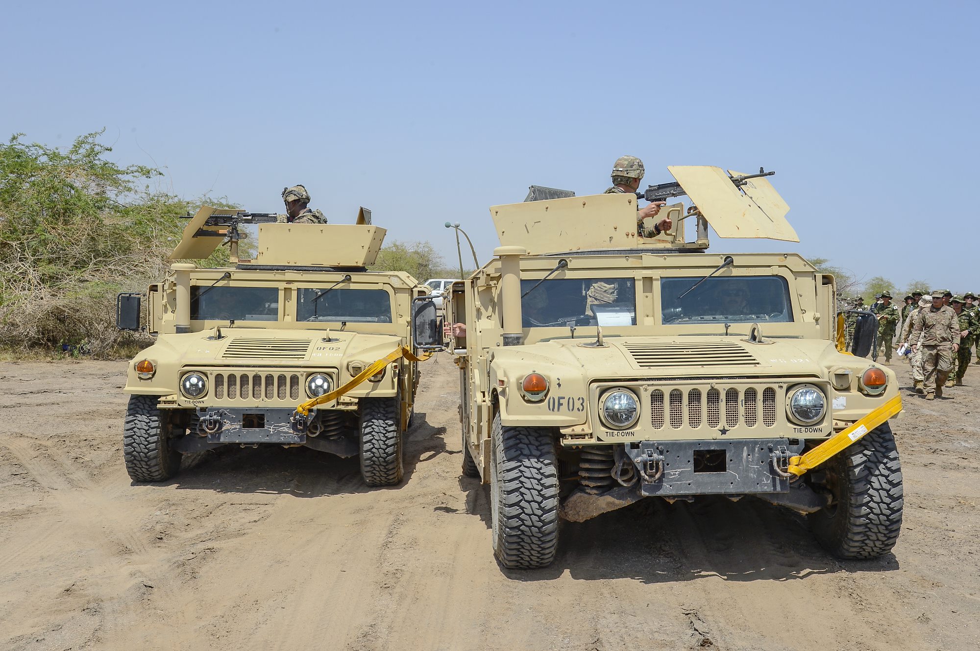U.S. Army Soldiers conduct convoy evacuation operations in Humvees during a joint coalition exercise at Camp Lemonnier, Djibouti, Sep. 5, 2018. The joint exercise allowed coalition forces from Italy, Japan, France, and Djibouti to learn alongside the U.S. Army and exchane best practices. (U.S. Navy Photo by Mass Communication Specialist 2nd Class Timothy M. Ahearn)
