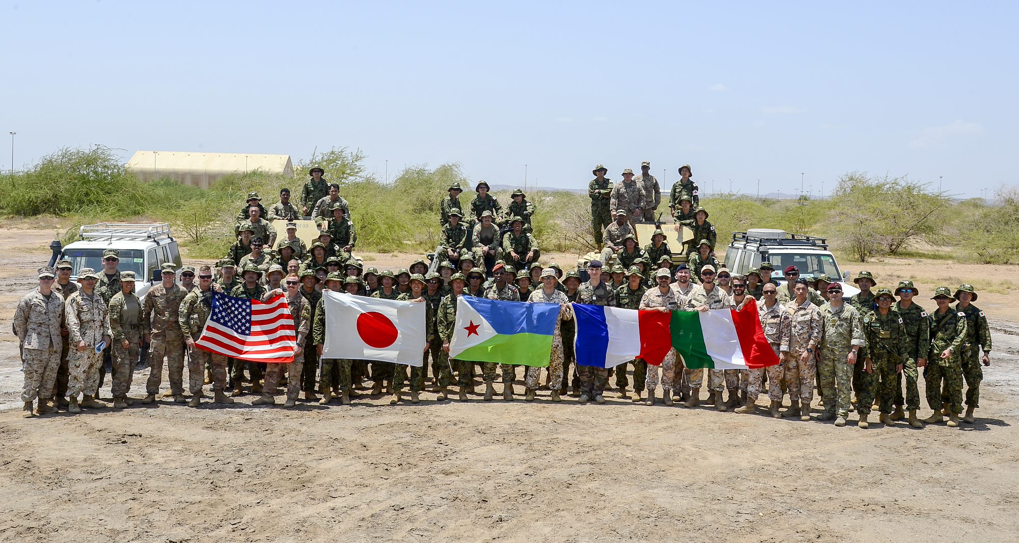 U.S. and coalition forces pose for a group photo following a joint coalition exercise at Camp Lemonnier, Djibouti, Sep. 5, 2018. The joint exercise allowed coalition forces from Italy, Japan, France, and Djibouti to learn alongside the U.S. Army and exchane best practices. (U.S. Navy Photo by Mass Communication Specialist 2nd Class Timothy M. Ahearn)