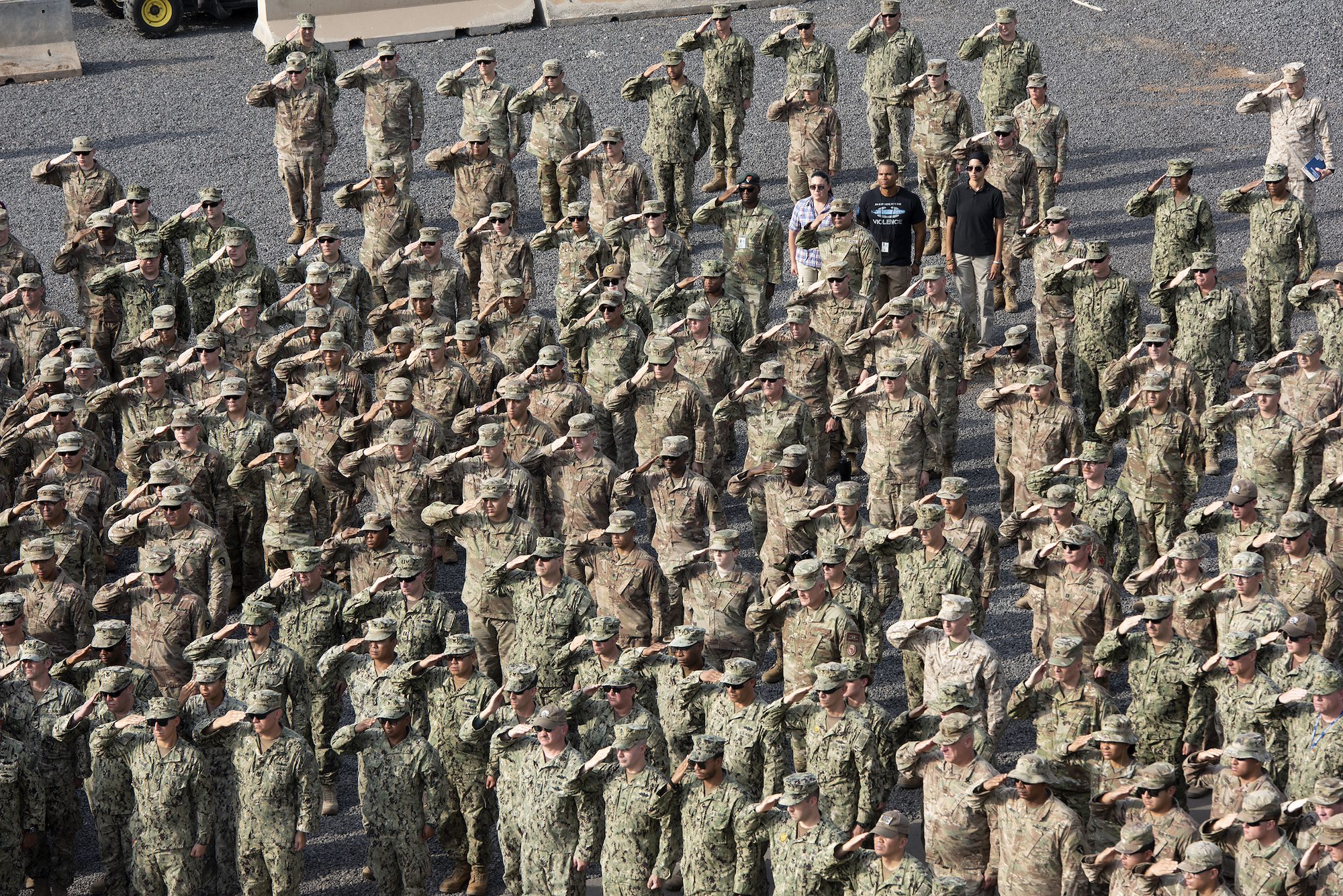 U.S. Service members deployed to the Horn of Africa salute during a 9/11 remembrance ceremony on Camp Lemonnier, Djibouti, Sept. 11, 2018. The ceremony honored those who lost their lives in New York City, Washington D.C. and Pennsylvania 17 years ago. (U.S. Air National Guard photo by Master Sgt. Sarah Mattison)