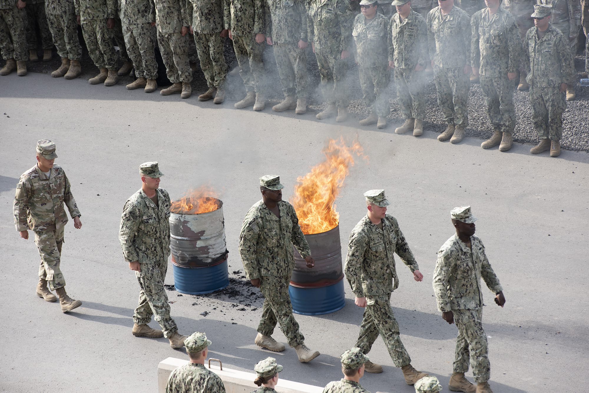 A flag detail, composed of U.S. service members, ceremoniously retire four American flags during a 9/11 ceremony, on Camp Lemonnier, Djibouti, Sept. 11, 2018. The four flags were retired in remembrance of the four 9/11 flights. (U.S. Air National Guard photo by Master Sgt. Sarah Mattison)