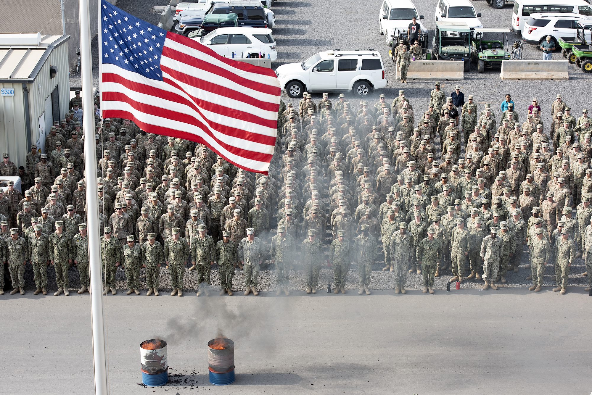 U.S. service members deployed to the Horn of Africa participate in a 9/11 remembrance ceremony on Camp Lemonnier, Djibouti, Sept. 11, 2018. The service members stood at attention as four American flags, one for each of the 9/11 flights, were ceremoniously retired from Camp Lemonnier. (U.S. Air National Guard photo by Master Sgt. Sarah Mattison)