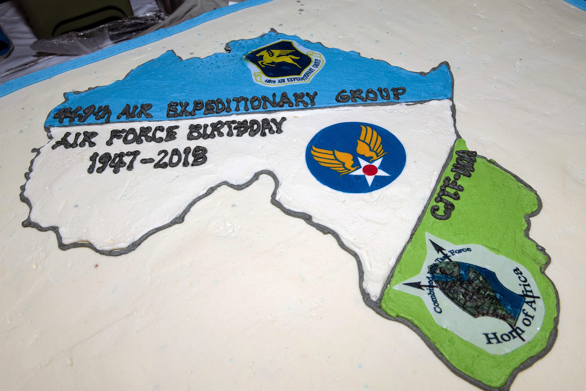 A cake for the U.S. Air Force’s 71st birthday was decorated to highlight the 449th Air Expeditionary Group serving in the Horn of Africa, on Camp Lemonnier, Djibouti, Sept. 18, 2018. U.S. service members and distinguished guests gathered together with Airmen with the 449th Air Expeditionary Group and Combined Joint Task Force-Horn of Africa to celebrate the U.S. Air Force’s birthday during a combat dining out. (U.S. Air National Guard photo by Master Sgt. Sarah Mattison)