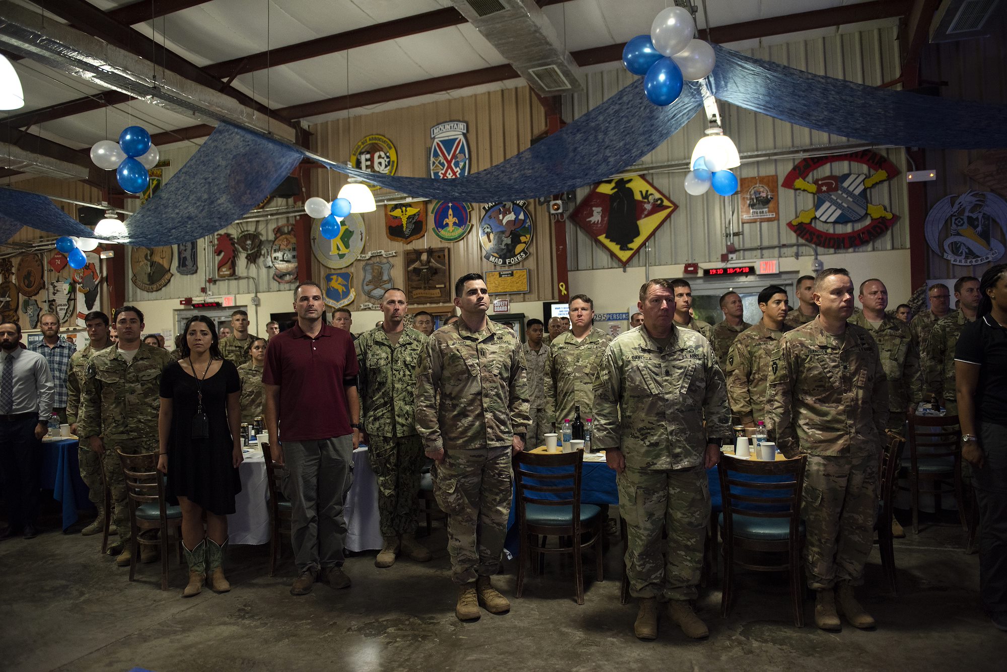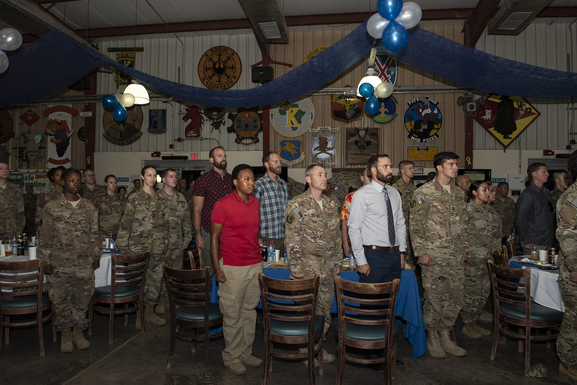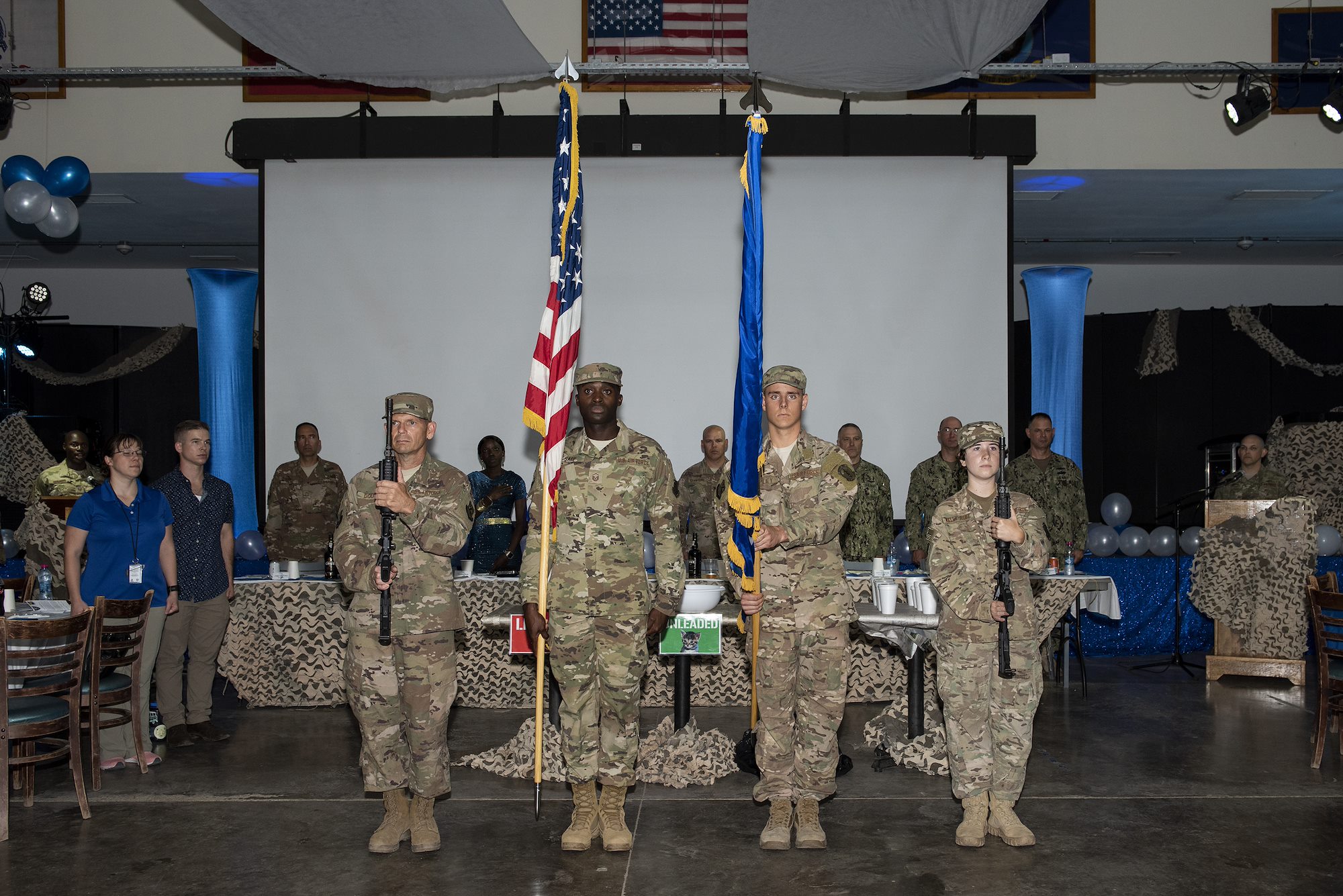 U.S. service members and distinguished guests stand for the National Anthem during a celebration of the U.S. Air Force’s 71st birthday on Camp Lemonnier, Djibouti, Sept. 18, 2018. U.S. service members and distinguished guests gathered together with Airmen assigned to 449th Air Expeditionary Group and Combined Joint Task Force-Horn of Africa to celebrate the U.S. Air Force’s 71st birthday during a combat dining out. (U.S. Air National Guard photo by Master Sgt. Sarah Mattison)