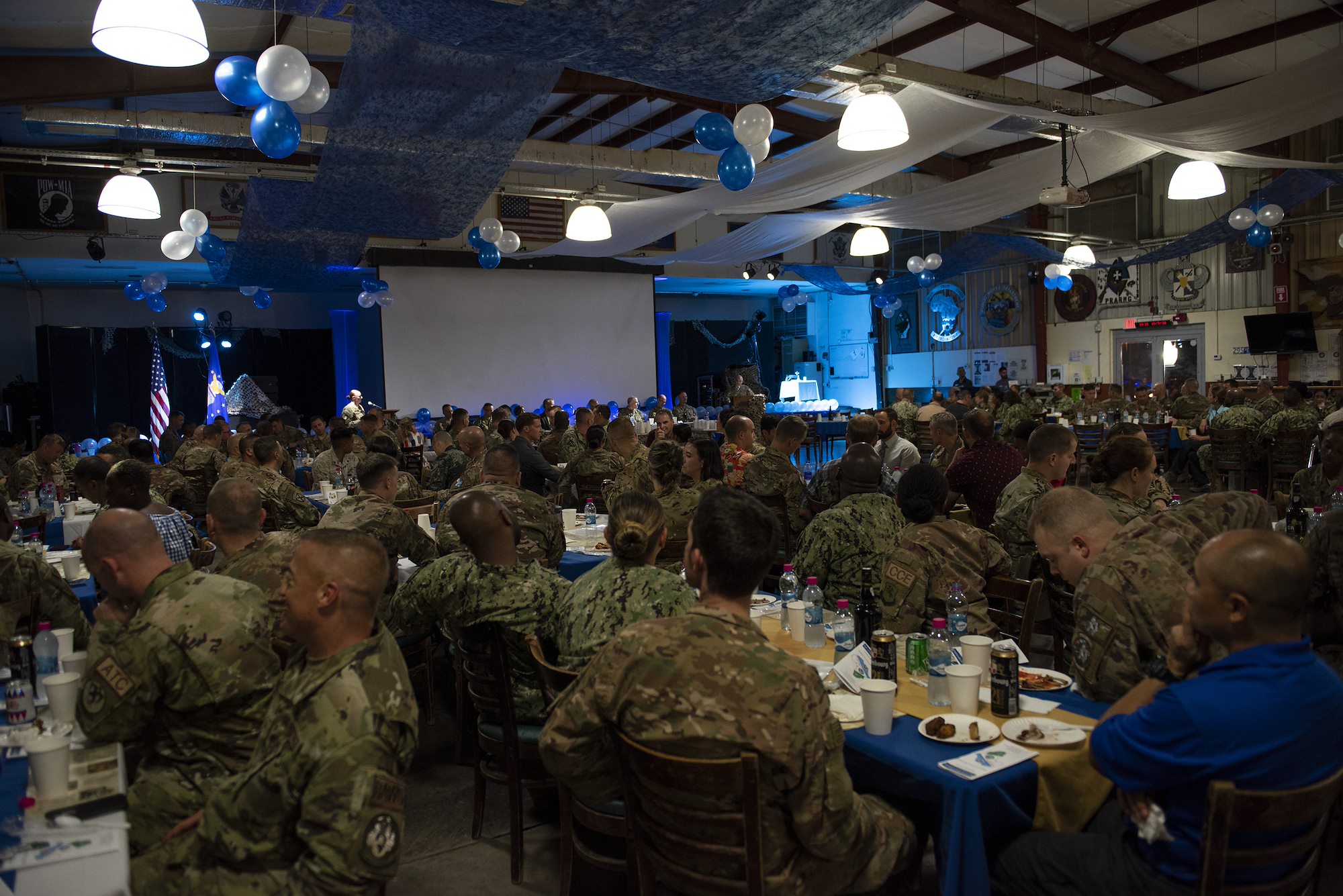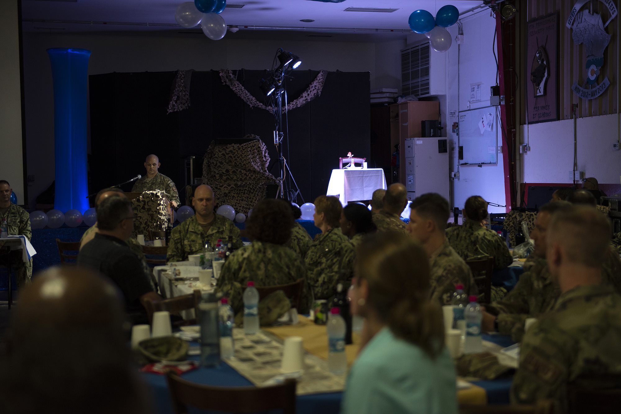 U.S. service members and distinguished guests gathered together with Airmen with the 449th Air Expeditionary Group and Combined Joint Task Force-Horn of Africa to celebrate the U.S. Air Force’s 71st birthday on Camp Lemonnier, Djibouti, Sept. 18, 2018. The birthday celebration was part of a combat dining out, giving Airmen an opportunity to build morale and esprit de corps with their fellow deployed service members. (U.S. Air National Guard photo by Master Sgt. Sarah Mattison)