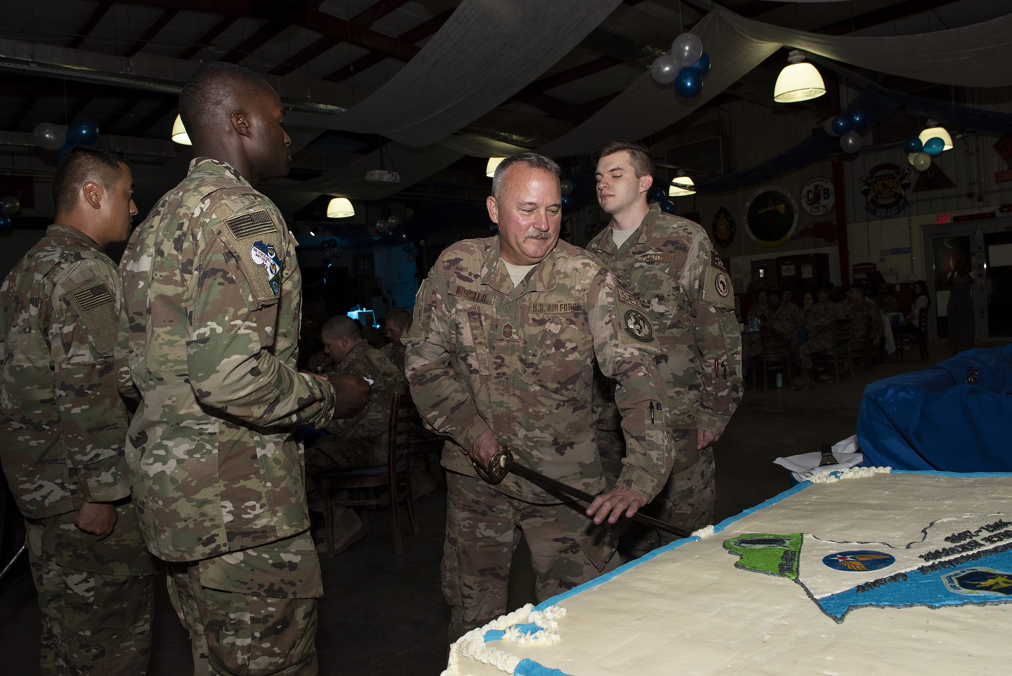 U.S. Air Force Chief Master Sgt. Timothy Whisler, senior enlisted leader, 449th Air Expeditionary Group, cuts a cake on Camp Lemonnier, Djibouti, Sept. 18, 2018. Whisler took part in the time-honored tradition for the Air Force’s 71st birthday, where the most senior and junior ranking time-in-service military members participate in a cake-cutting ceremony. (U.S. Air National Guard photo by Master Sgt. Sarah Mattison)