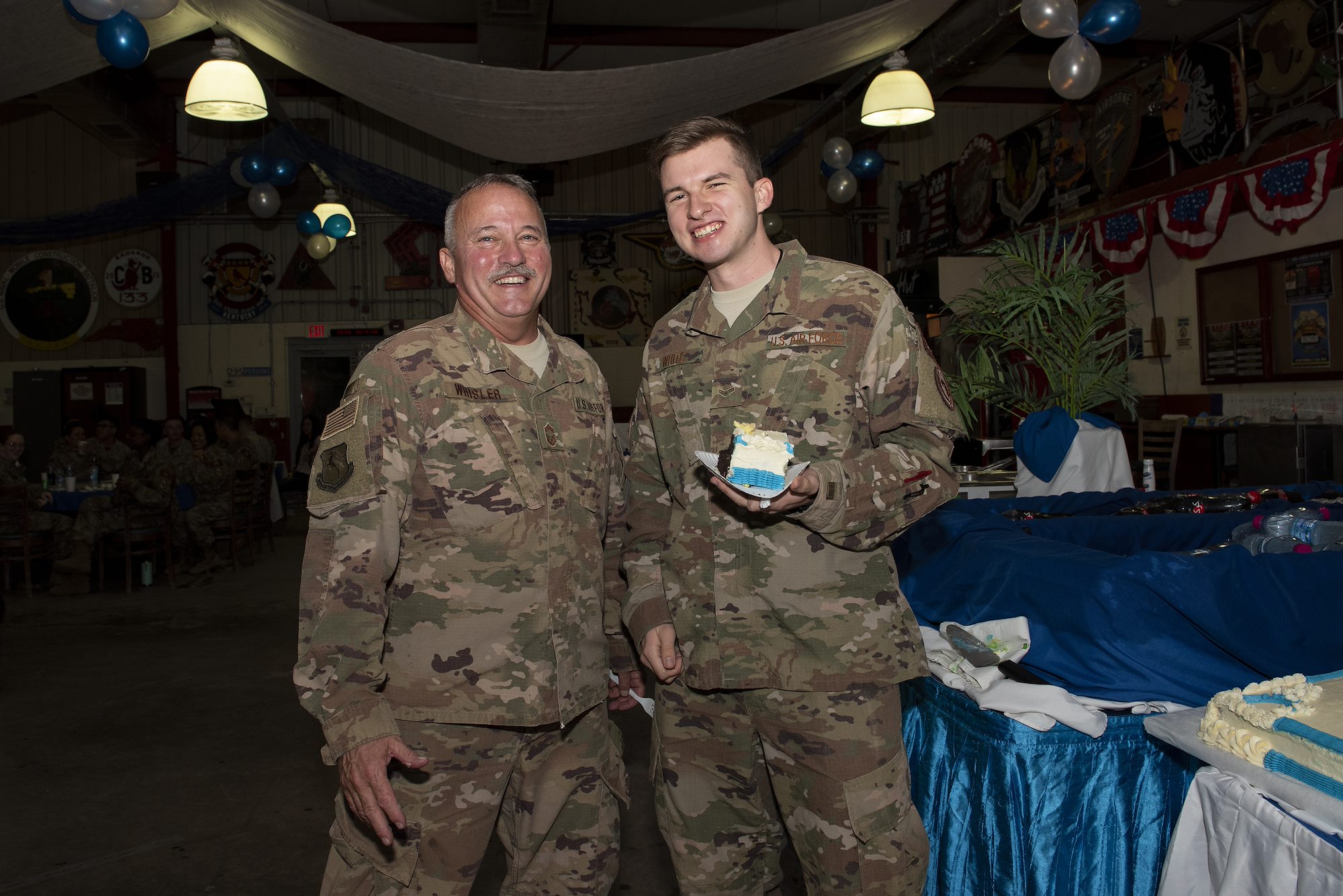 U.S. Air Force Chief Master Sgt. Timothy Whisler and Airman 1st Class Adyn White, both assigned to the 449th Air Expeditionary Group, pose for a photo on Camp Lemonnier, Djibouti, Sept. 18, 2018. Whisler and White both participated in a time-honored tradition, where the most senior and junior ranking time-in-service military members participate in a cake-cutting ceremony, for the Air Force’s 71st birthday. (U.S. Air National Guard photo by Master Sgt. Sarah Mattison)