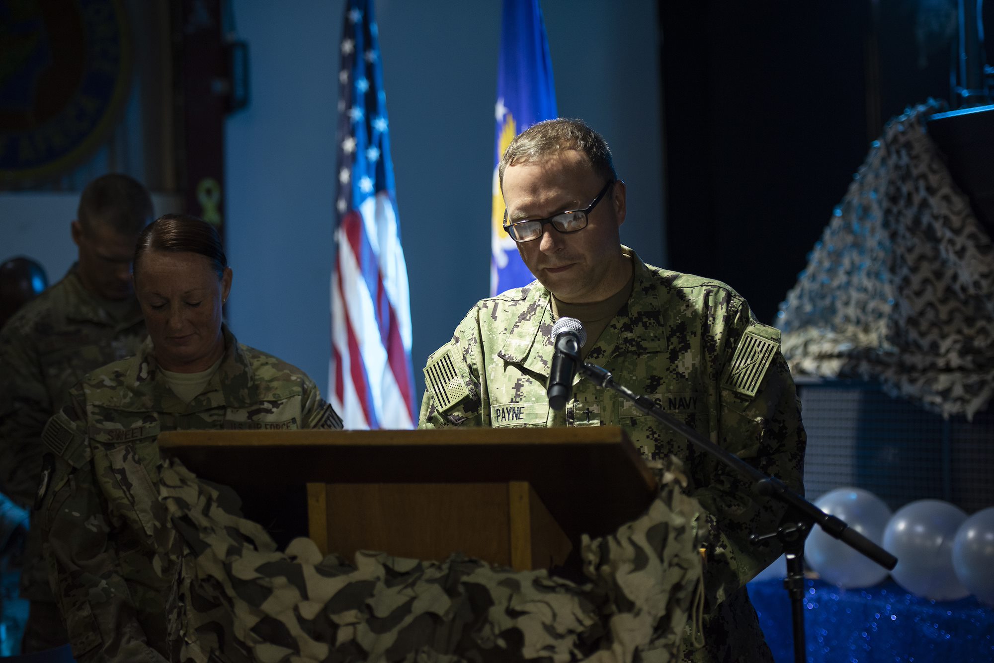 U.S. Navy Lt. Kevin Payne, chaplain, delivers the invocation during the 449th Air Expeditionary Group’s Combat Dining Out on Camp Lemonnier, Djibouti, Sept. 18, 2018. The event included a celebration for the U.S. Air Force’s 71st birthday celebration, giving Airmen an opportunity to build morale and esprit de corps with their fellow deployed service members. (U.S. Air National Guard photo by Master Sgt. Sarah Mattison)