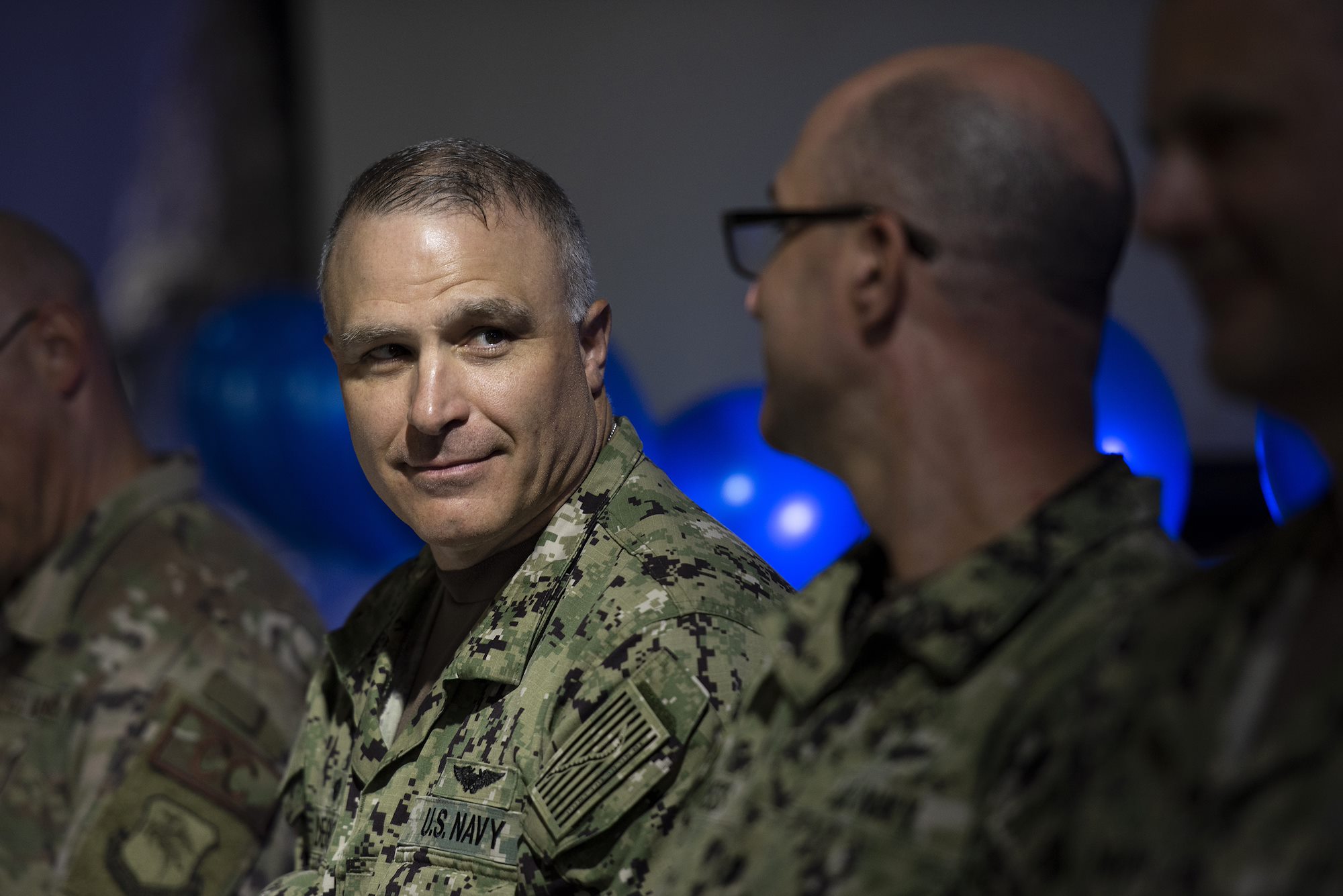 U.S. Navy Capt. Charles DeGilio, commanding officer, Camp Lemonnier, attends an Air Force birthday celebration on Camp Lemonnier, Djibouti, Sept. 18, 2018. DeGilio attended the 449th Air Expeditionary Group’s Combat Dining Out, which celebrated the Air Force’s 71st birthday, giving Airmen an opportunity to build morale and esprit de corps with their fellow deployed service members. (U.S. Air National Guard photo by Master Sgt. Sarah Mattison)