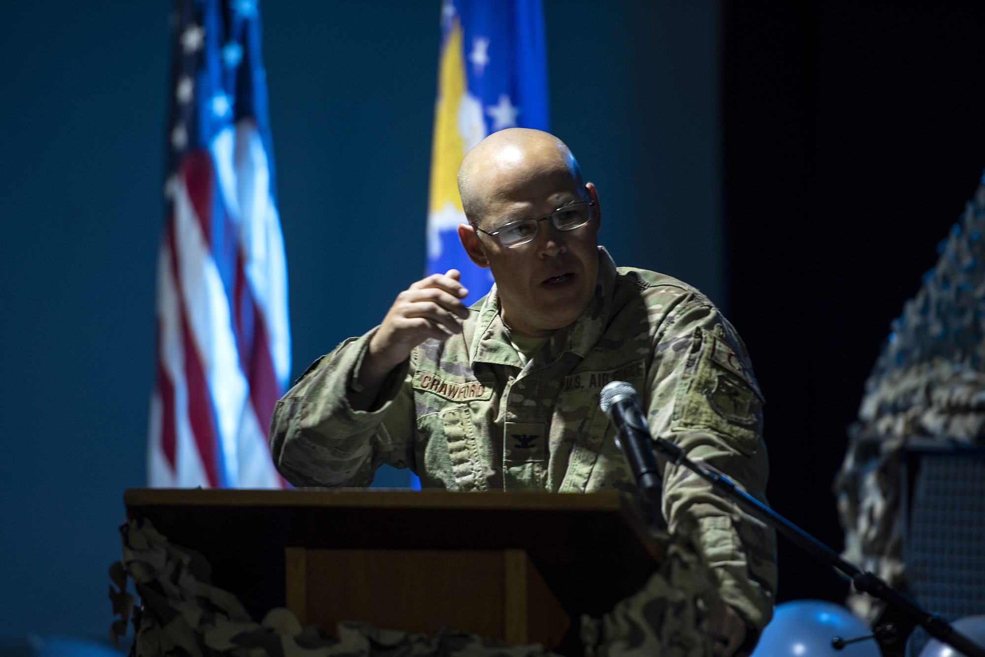 U.S. Air Force Col. Keith Crawford, commander, 449th Air Expeditionary Group, speaks to guests during a combat dining out on Camp Lemonnier, Djibouti, Sept. 18, 2018. The event included a celebration for the U.S. Air Force’s 71st birthday celebration, giving Airmen an opportunity to build morale and esprit de corps with their fellow deployed service members. (U.S. Air National Guard photo by Master Sgt. Sarah Mattison)