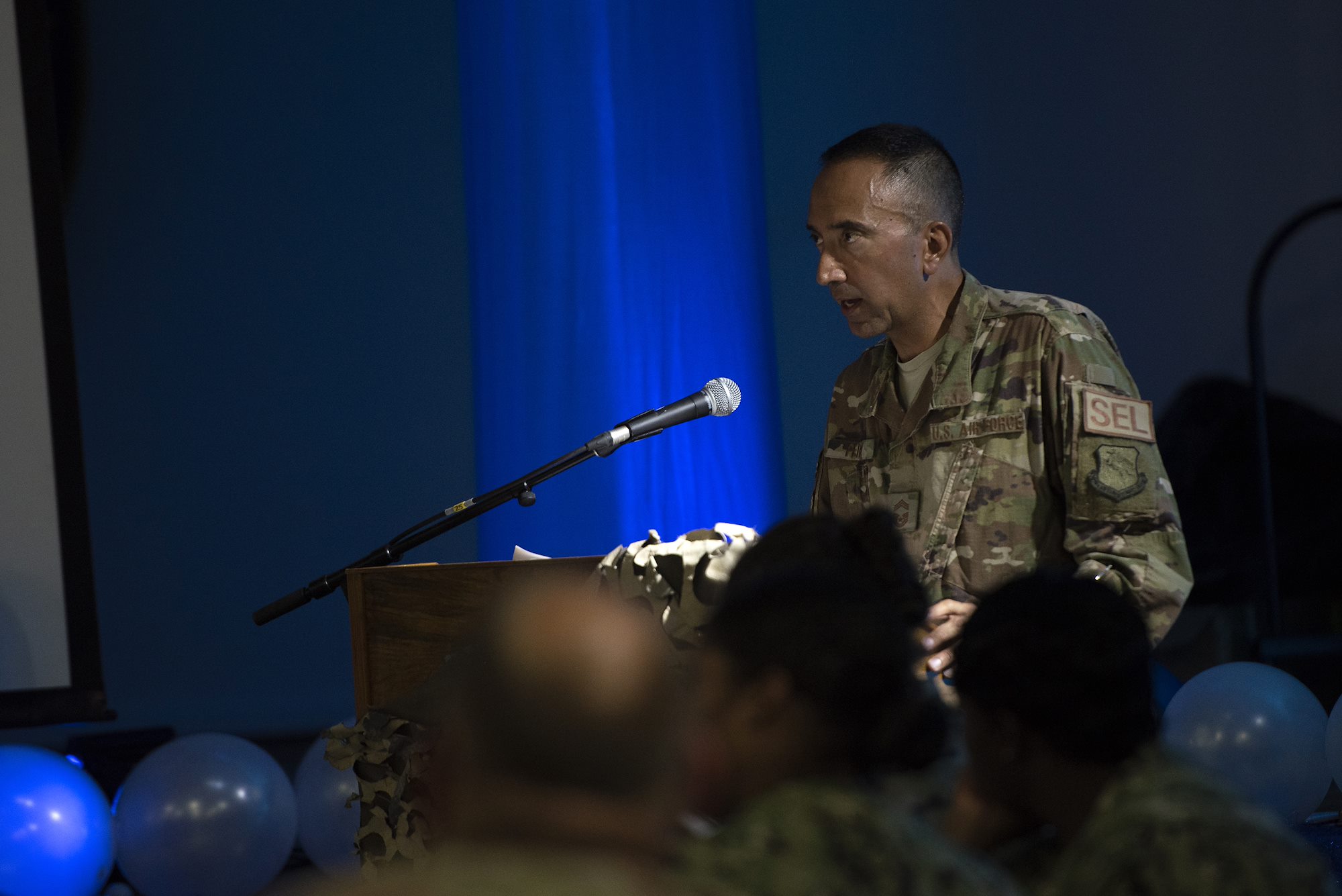 U.S. Air Force Chief Master Sgt. Arthur Perez, chief enlisted manager, 449th Air Expeditionary Group, speaks to guests during a combat dining out on Camp Lemonnier, Djibouti, Sept. 18, 2018. The event included a celebration for the U.S. Air Force’s 71st birthday celebration, giving Airmen an opportunity to build morale and esprit de corps with their fellow deployed service members. (U.S. Air National Guard photo by Master Sgt. Sarah Mattison)