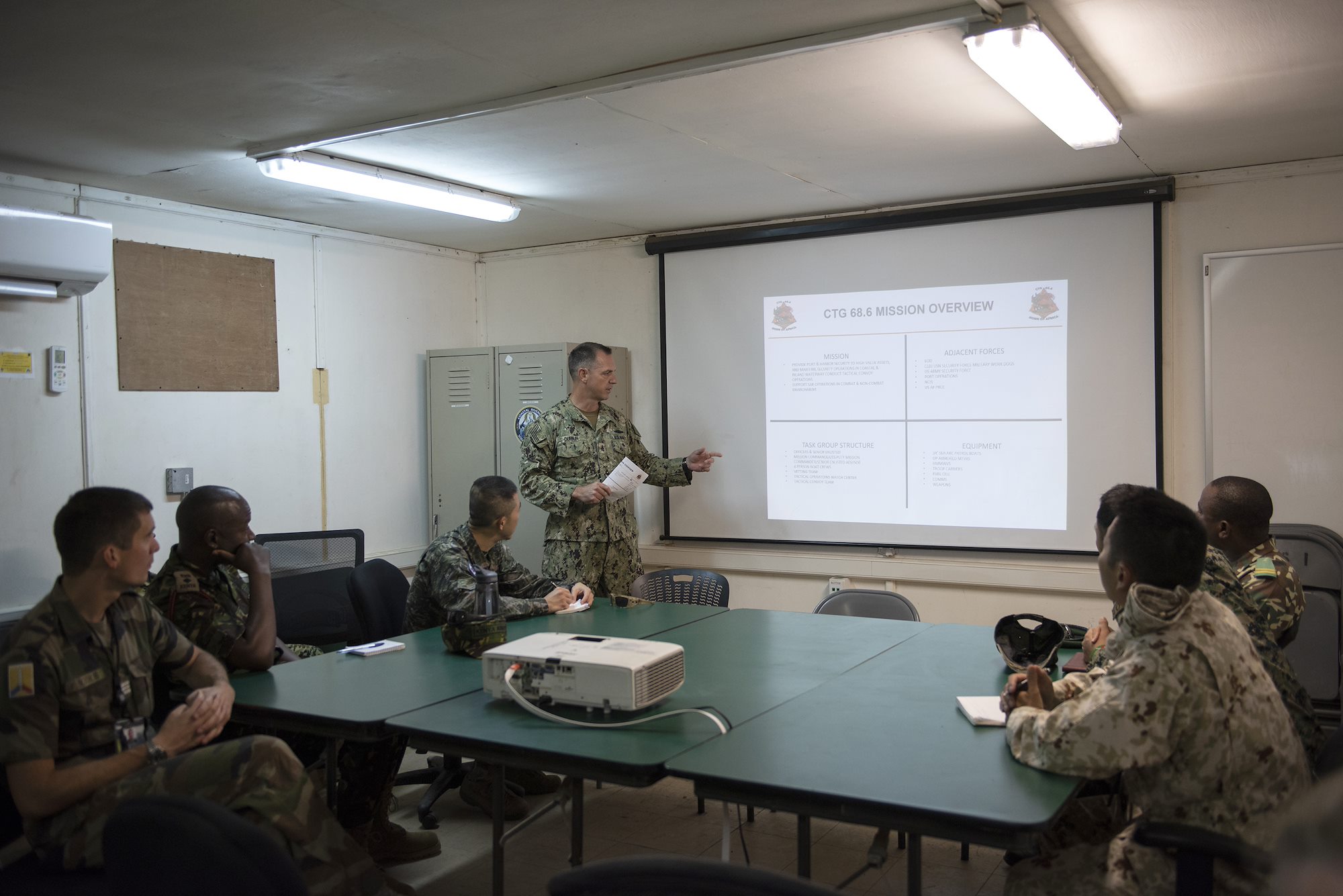 U.S. Navy Senior Chief Petty Officer Edward Durkin, patrol lead with Coastal Riverine Squadron (CRS) 8, briefs foreign liaison officers assigned to Combined Joint Task Force-Horn of Africa on Camp Lemonnier, Djibouti, Sept. 14, 2018. Durkin spoke about CRS’s mission, the structure and the type of equipment they use. (U.S. Air National Guard photo by Master Sgt. Sarah Mattison)