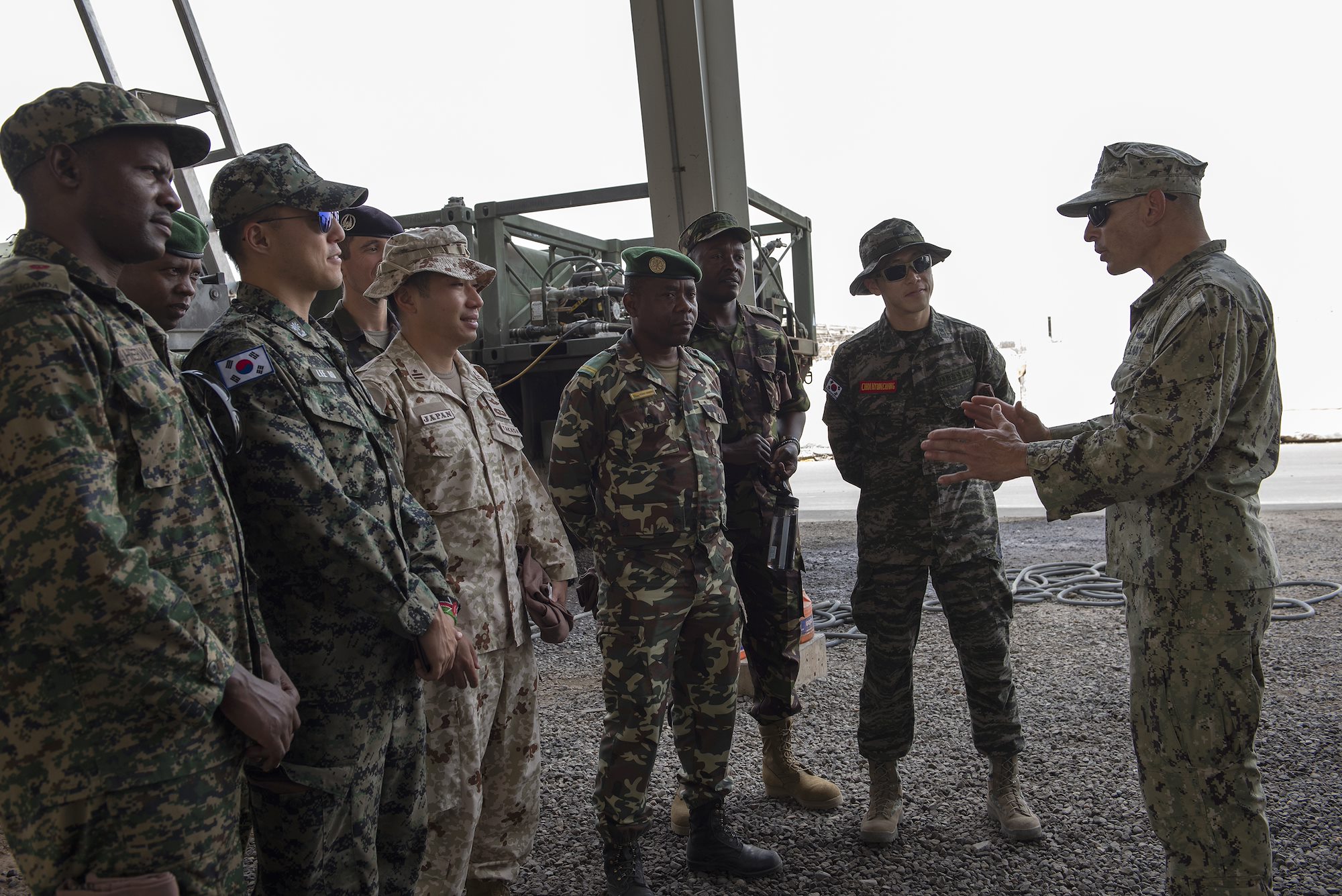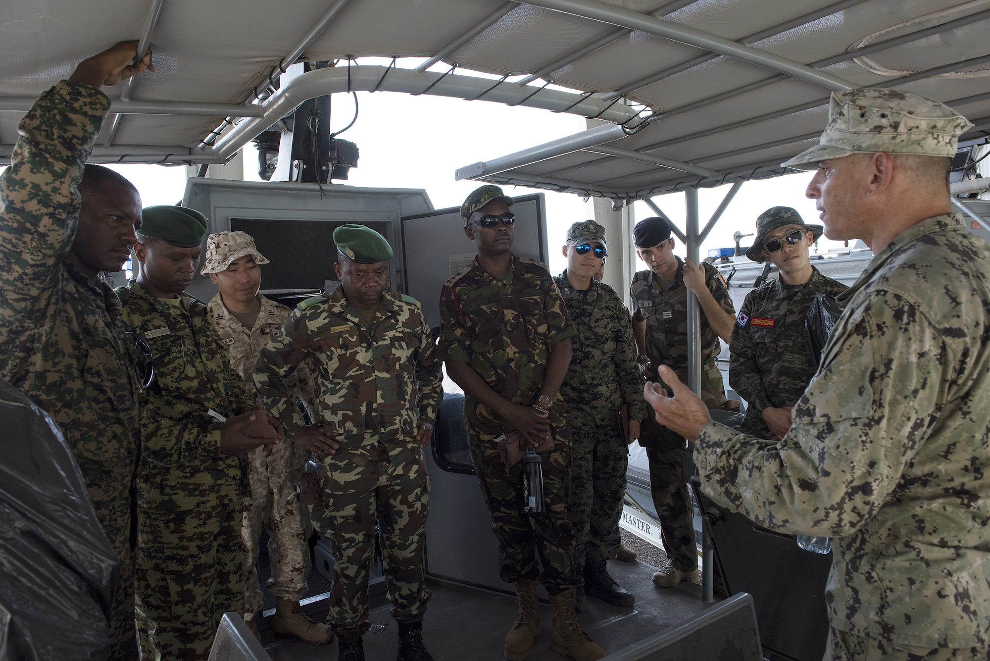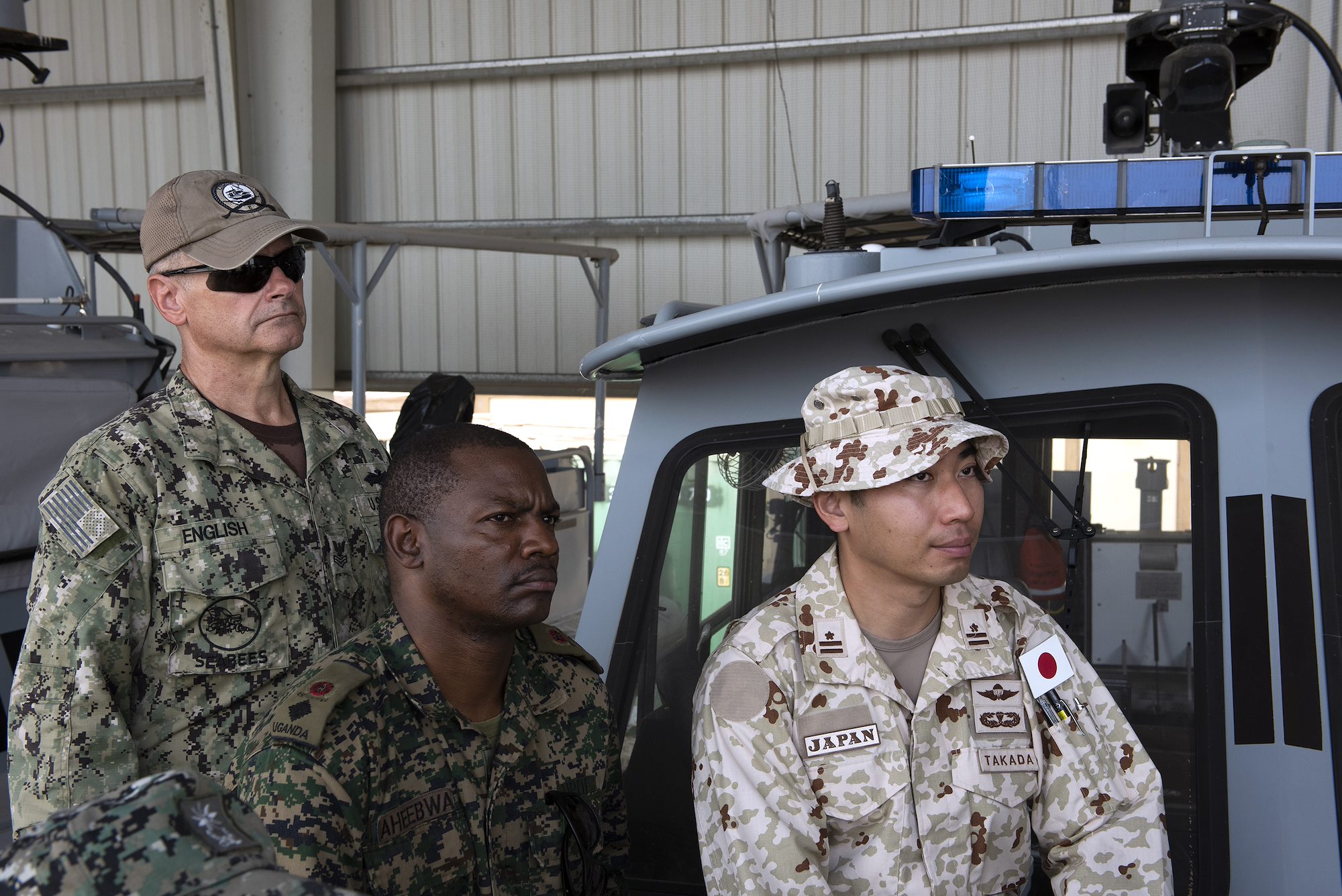 From left: U.S. Navy Construction Electrician 1st Class Richard English with Coastal Riverine Squadron 8 (CRS8), Ugandan Lt. Col. Nelson Aheebwa with the Ugandan People’s Defense Force and Japanese Maj. Shinsuke Takada with the Japan Ground Self-Defense Force listen during a brief on Camp Lemonnier, Djibouti, Sept. 14, 2018. Both Aheebwa and Takada, foreign liaison officers from their respective countries assigned to Combined Joint Task Force-Horn of Africa, attended a brief on CRS 8 and toured one of their patrol boats. (U.S. Air National Guard photo by Master Sgt. Sarah Mattison)
