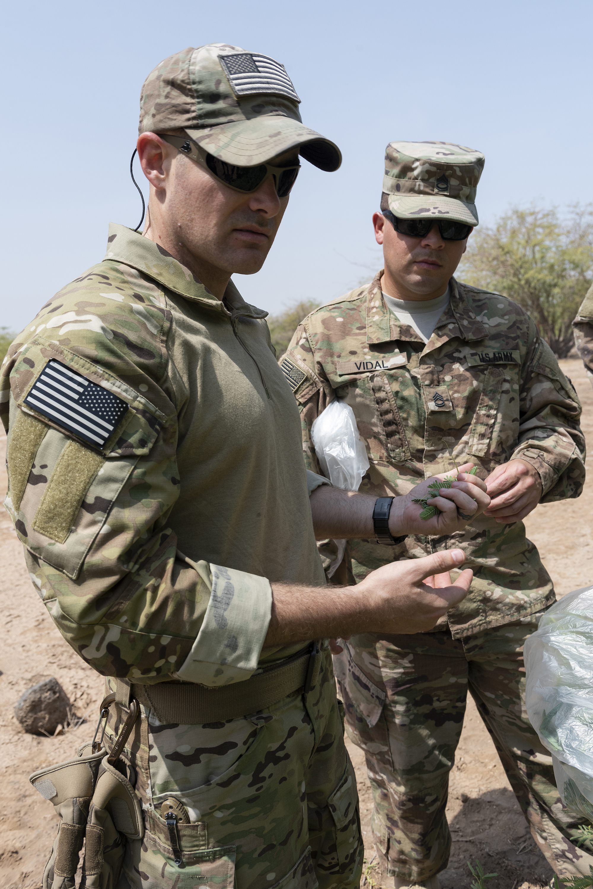 U.S. Air Force Tech. Sgt. Adam Murphy, a survival, evasion, resistance and escape specialist assigned to Combined Joint Task Force-Horn of Africa, and Army Sergeant 1st Class Amando Vidal, a field artillery firefinder radar operator with 3rd Battalion, 133rd Field Artillery Regiment, Texas National Guard, collect leaves from a Sickle Bush during survival skills training on Camp Lemonnier, Djibouti, Oct. 13, 2018. Murphy and Vidal placed the leaves in a plastic bag and exposed the bag to the sun, which allowed condensation to gather and enabled them to create an alternative water source in an austere environment. (U.S. Air National Guard photo by Master Sgt. Sarah Mattison)