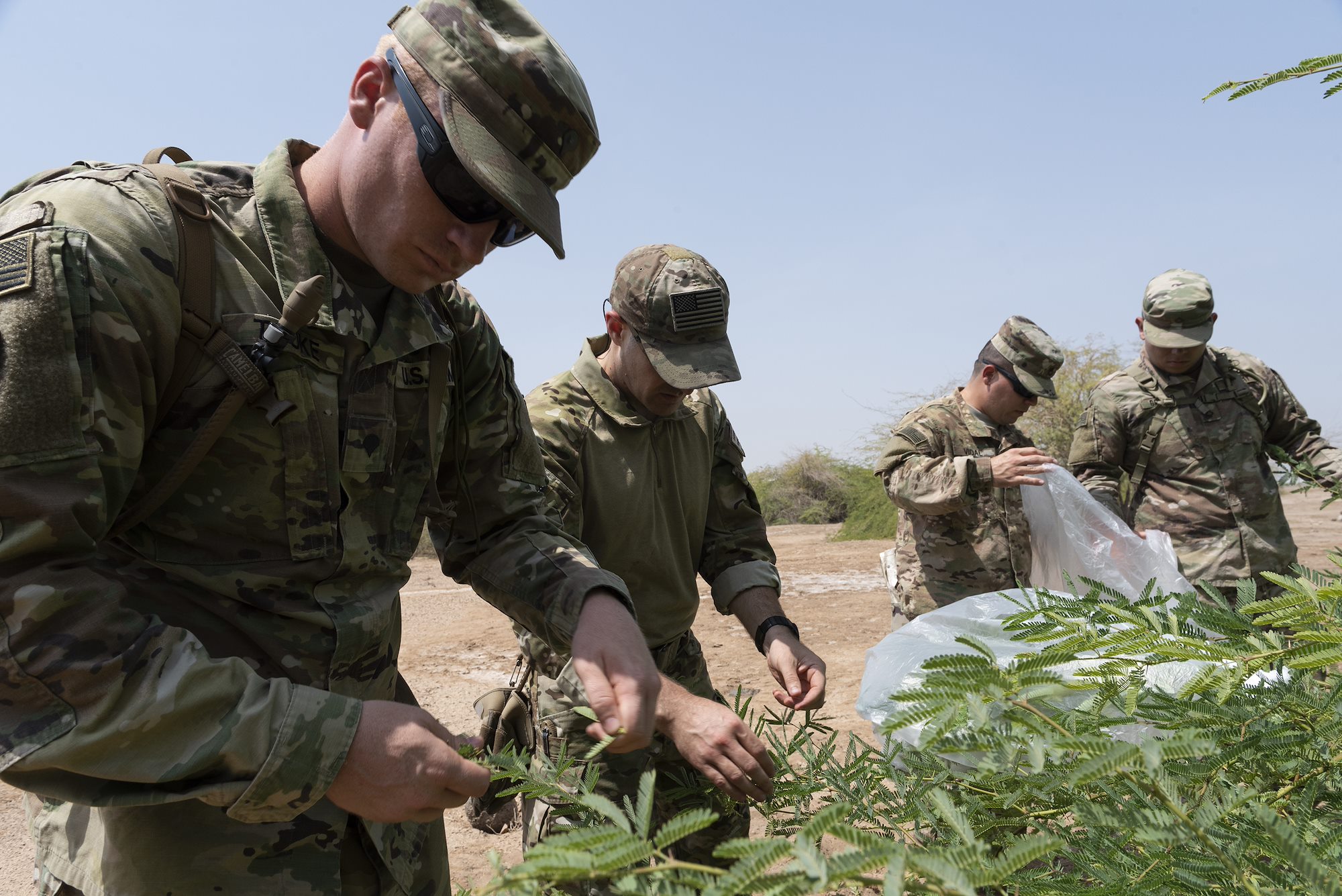 U.S. Soldiers assigned to Combined Joint Task Force Horn of Africa collect leaves during survival skills training on Camp Lemonnier, Djibouti, Oct. 13, 2018. The service members placed the leaves in a plastic bag and exposed the bag to the sun, which allowed condensation to gather and enabled them to create an alternative water source in an austere environment. (U.S. Air National Guard photo by Master Sgt. Sarah Mattison)