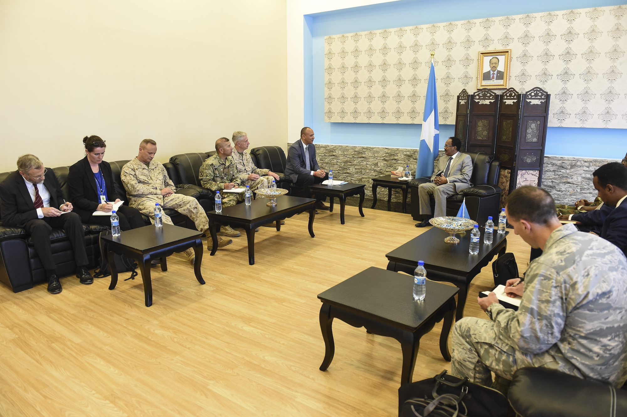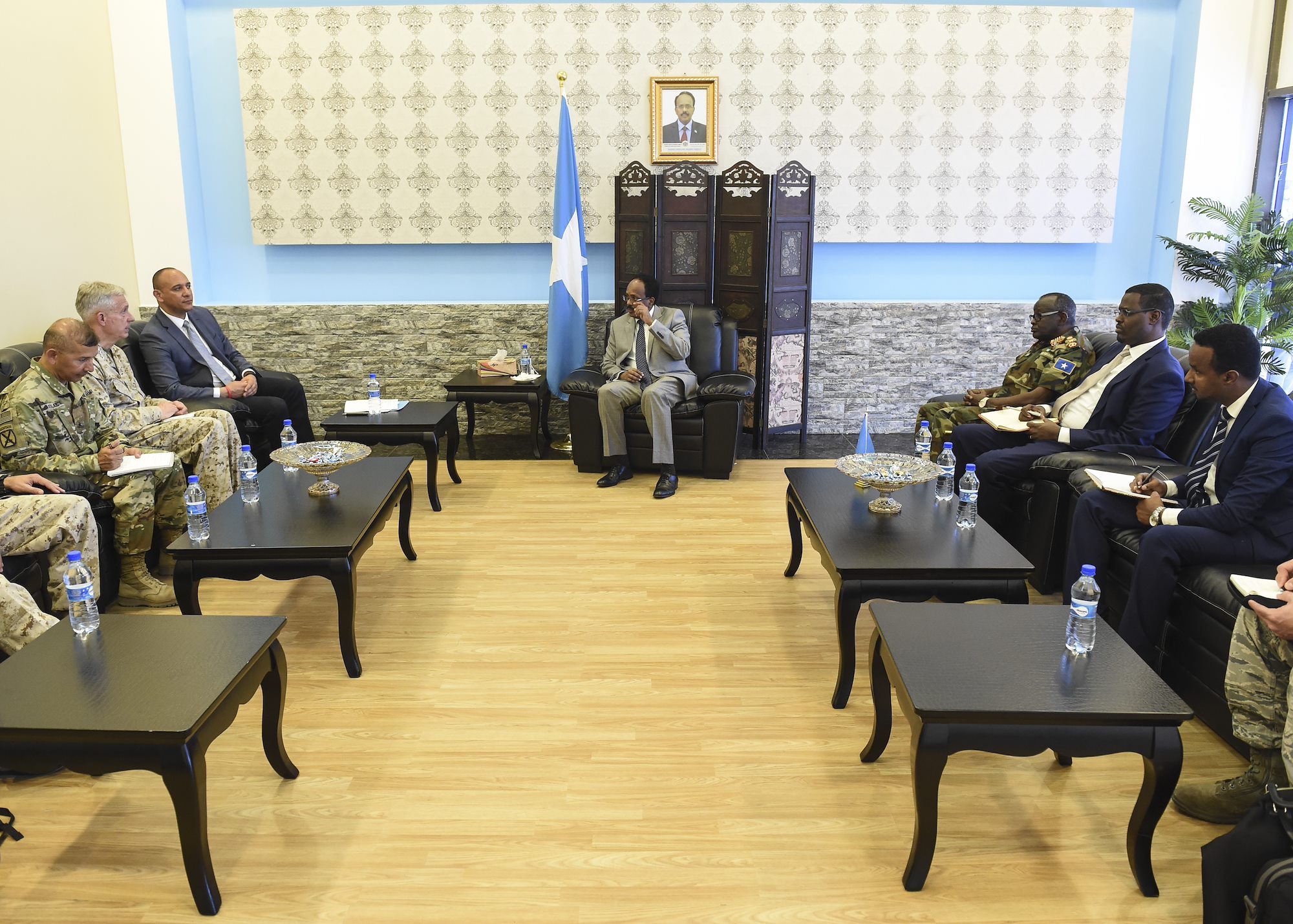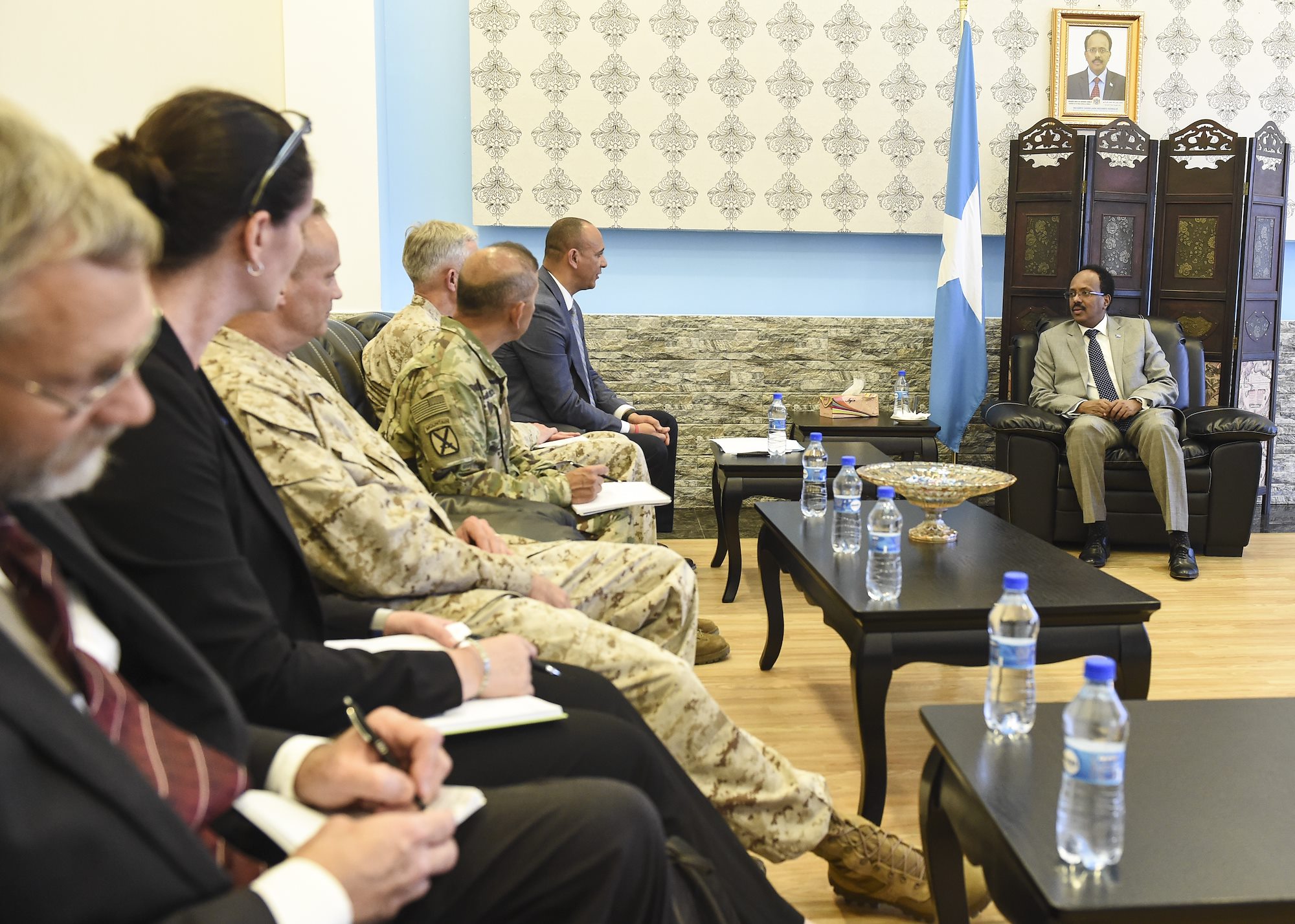 U.S. military and Department of State officials meet with Somalia President Mohamed Abdullahi Mohamed in Mogadishu, Somalia, Oct. 12, 2017. Topics of interest covered during the meeting included U.S. and Somali national interests in the region and opportunities to strengthen the Somali National Security Forces, particularly as the African Union mission in Somalia troops transition out of the security role in coming years. Attendees of the meeting included Martin Dale, the Chargé d’Affaires of the U.S. Mission to Somalia, U.S. Marine Corps Gen. Thomas Waldhauser, U.S. Africa Command commander, U.S. Marine Corps Brig. Gen. David Furness, Combined Joint Task Force – Horn of Africa commanding general, and U.S. Army Brig. Gen. Miguel Castellanos, deputy commanding general of CJTF-HOA in Somalia (U.S. Air Force photo by Staff Sgt. Eboni Prince)
