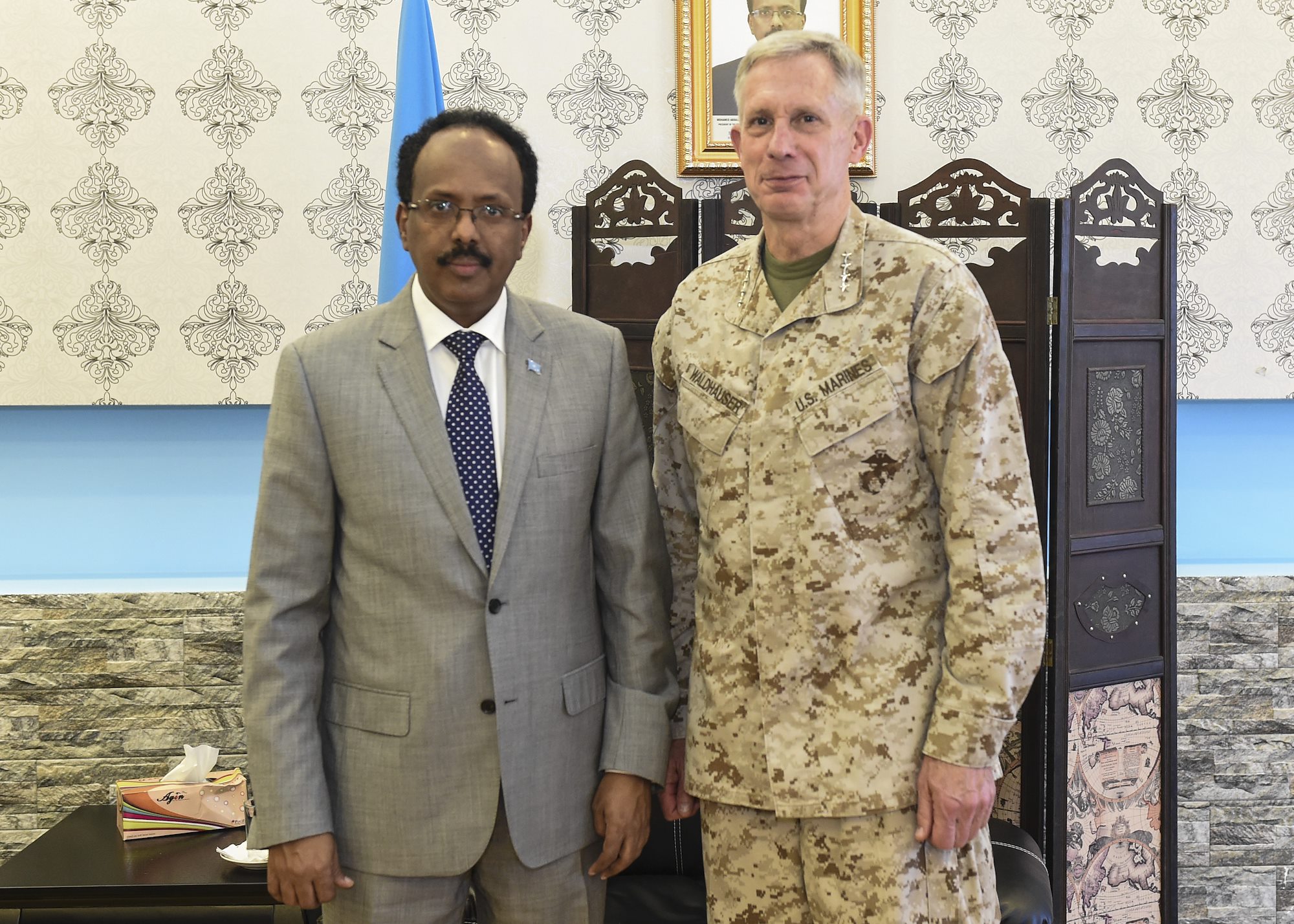 Somalia President Mohamed Abdullahi Mohamed and U.S. Marine Corps Gen. Thomas Waldhauser, U.S. Africa Command commander, pose for a photo in Mogadishu, Somalia, Oct. 12, 2017. Waldhauser and Martin Dale, the Chargé d’Affaires of the U.S. Mission to Somalia, along with other senior U.S. military and Department of State leaders, visited Somalia to engage with key Somalia stakeholders and express the U.S. government’s commitment to the security and stability of the Federal Government of Somalia, Somali National Security Forces, and the African Union Mission in Somalia. (U.S. Air Force photo by Staff Sgt. Eboni Prince)