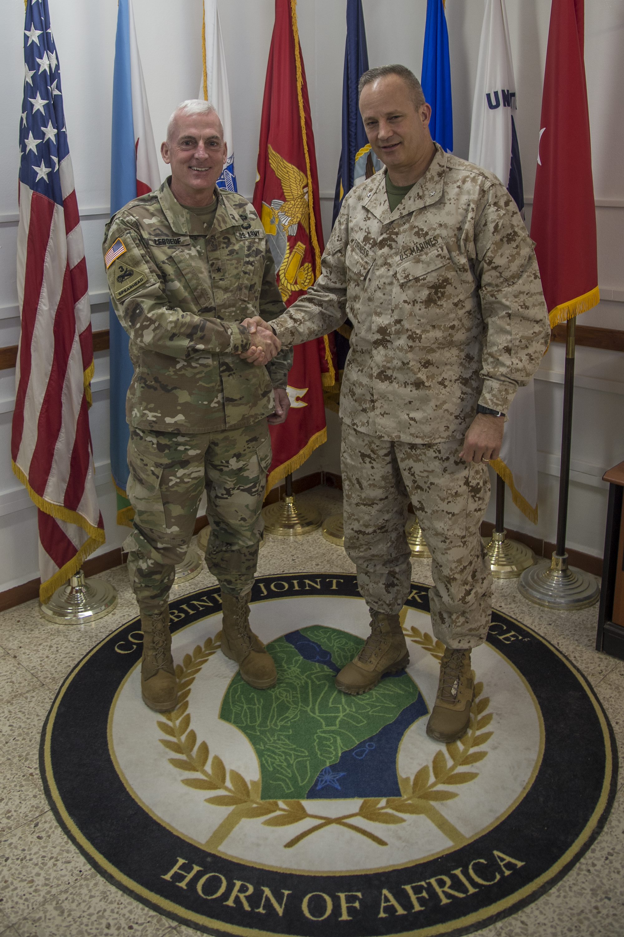 U.S. Army Brig. Gen. Eugene Leboeuf, U.S. Army Africa (USARAF) acting commanding general, meets with U.S. Marine Corps Brig. Gen. David Furness, Combined Joint Task Force - Horn of Africa commanding general, during a visit to Camp Lemonnier, Djibouti, on Oct. 25, 2017. Leboeuf is visiting key leaders and locations in East Africa to align USARAF strategic plans and training efforts in the region. (U.S. Air National Guard photo by Tech. Sgt. Joe Harwood)