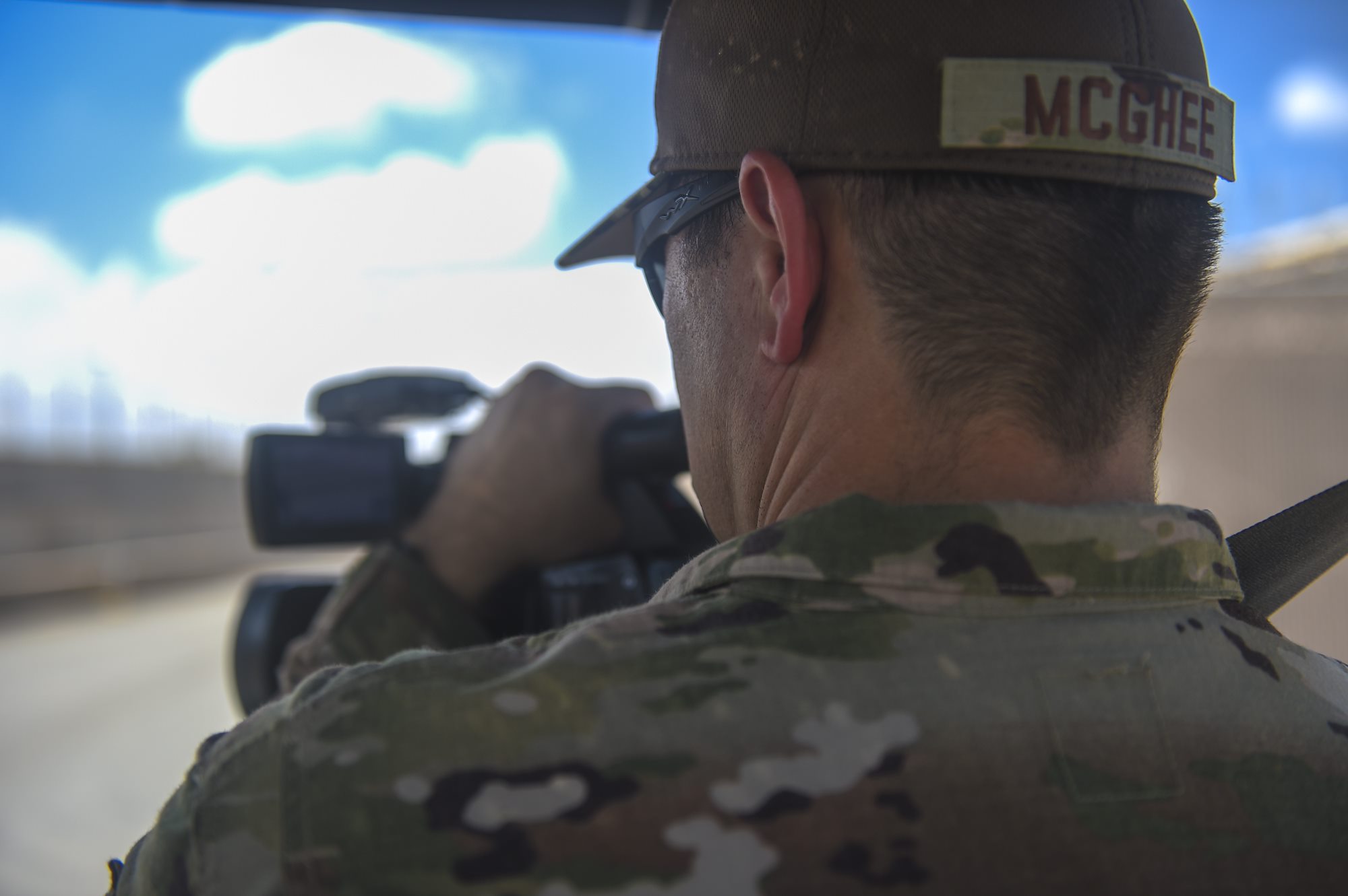 U.S. Air Force Tech. Sgt. Michael McGhee, Combined Joint Task Force - Horn of Africa Public Affairs broadcast journalist, tests his equipment at Camp Lemonnier, Djibouti, Oct. 28, 2017. McGhee recently arrived at Camp Lemonnier. (U.S. Air Force photo by Staff Sgt. Timothy Moore)