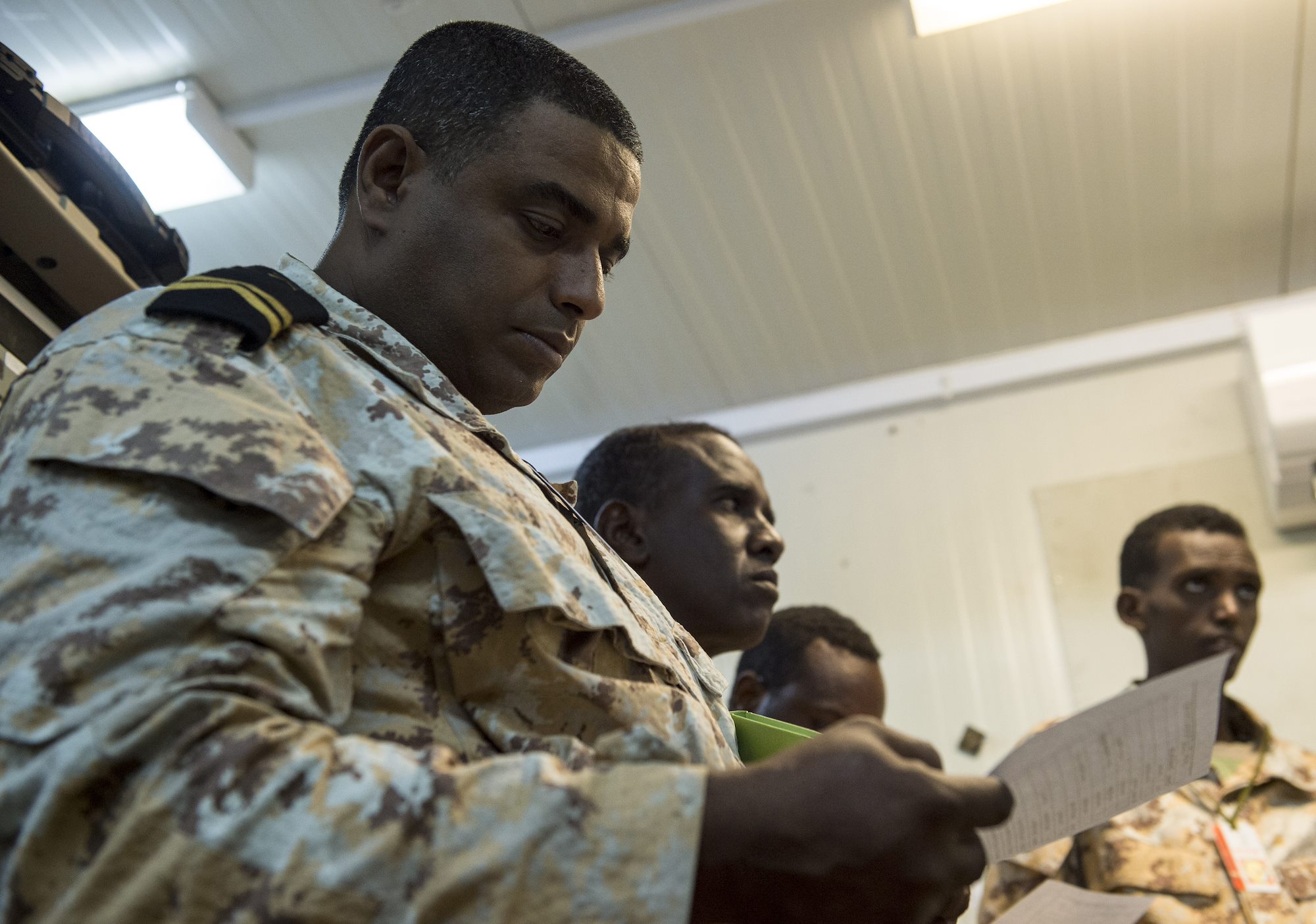 A Djibouti Armed Forces (FAD) member reviews a sheet of input commands during a military-to-military exchange course with U.S. Soldiers assigned to the Combined Joint Task Force - Horn of Africa (CJTF-HOA) Communications Directorate, at Camp Lemonnier, Djibouti, Jan. 9, 2018. Throughout a two-week period, communications experts advised Djiboutian service members on how to set up, operate, maintain, and troubleshoot network equipment to increase communication capabilities between African Union Mission in Somalia forces. (U.S. Air Force photo illustration by Staff Sgt. Timothy Moore)