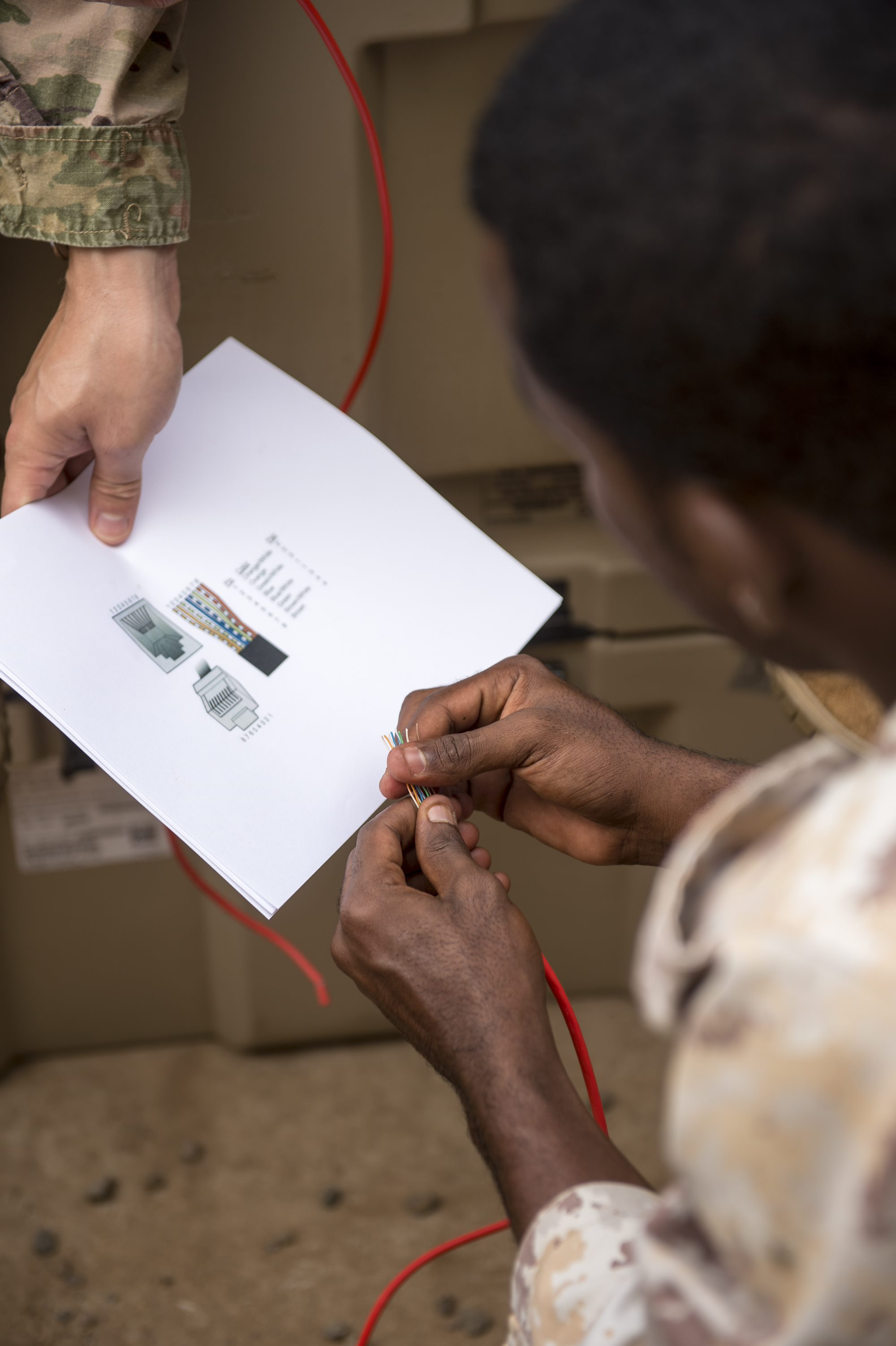 A Djibouti Armed Forces (FAD) member reviews a guide to set up the wires for a cable during a military-to-military exchange course with U.S. Soldiers assigned to the Combined Joint Task Force - Horn of Africa (CJTF-HOA) Communications Directorate, at Camp Lemonnier, Djibouti, Jan. 10, 2018. Throughout a two-week period, communications experts advised Djiboutian service members on how to set up, operate, maintain, and troubleshoot network equipment to increase communication capabilities between African Union Mission in Somalia forces. (U.S. Air Force photo by Staff Sgt. Timothy Moore)