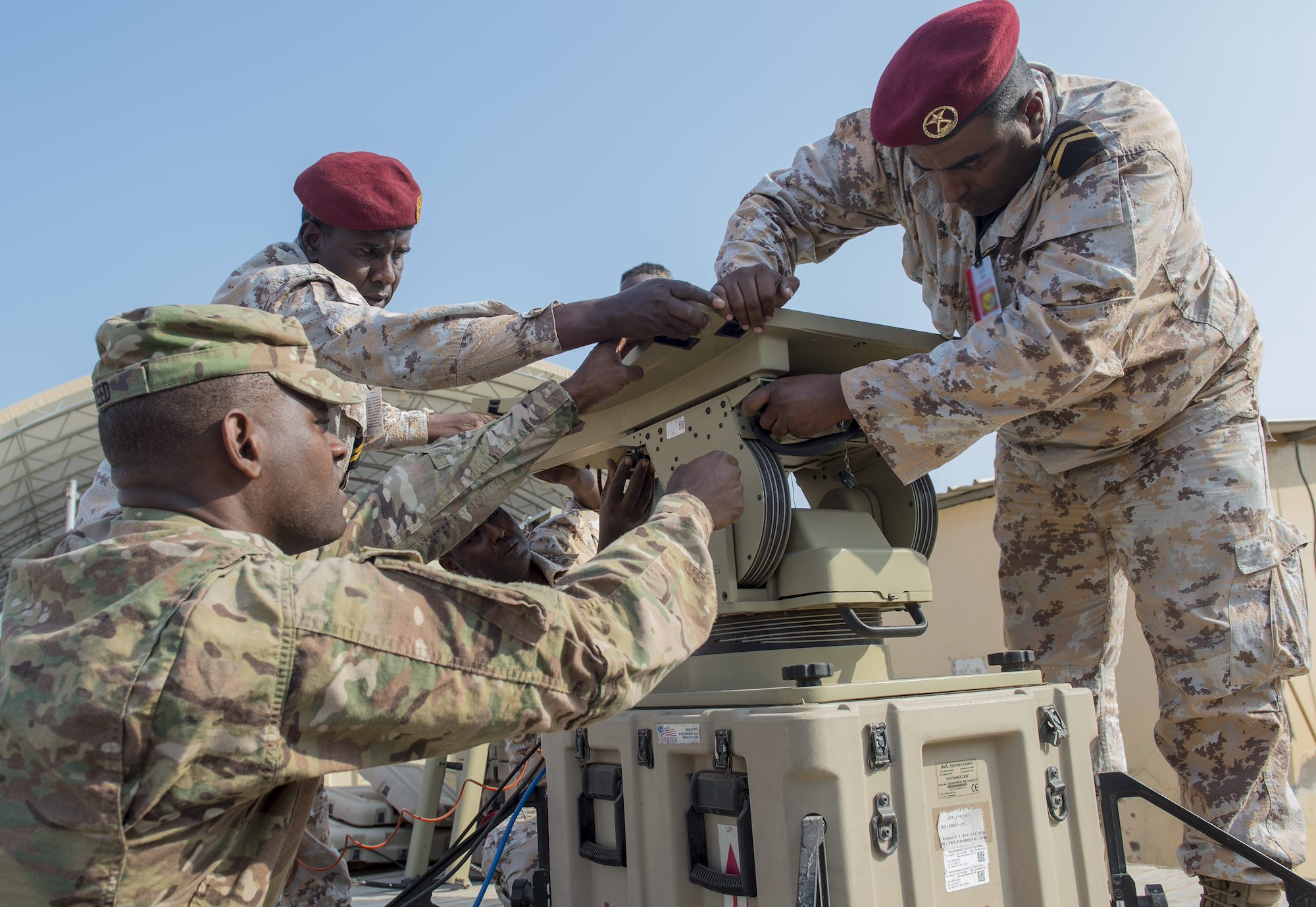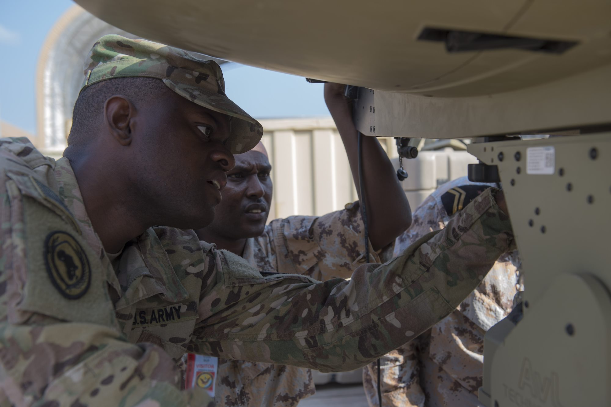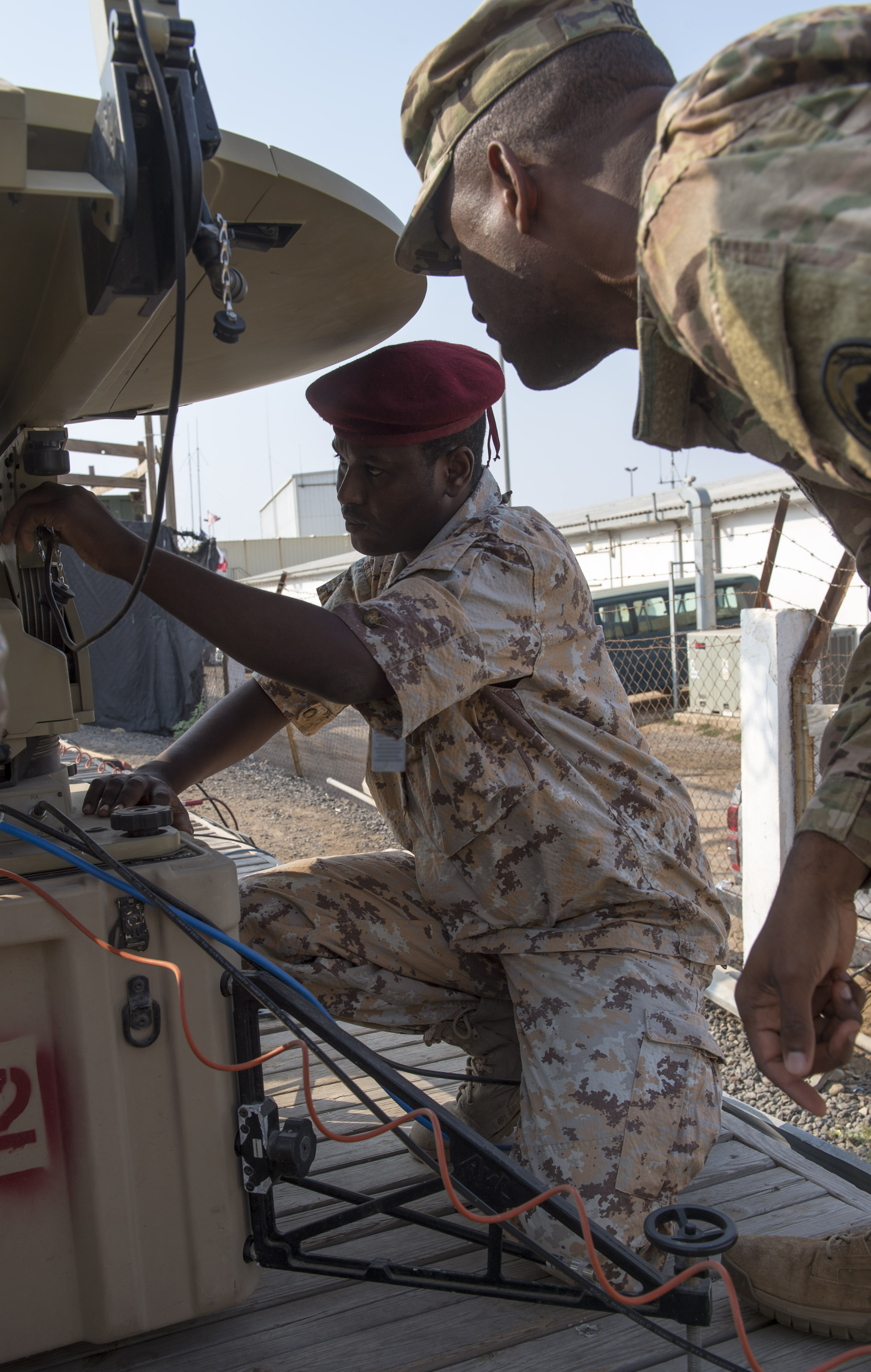 Djibouti Armed Forces (FAD) members watch as another FAD member checks the cable connections on an antenna during a military-to-military exchange course with U.S. Soldiers assigned to the Combined Joint Task Force - Horn of Africa (CJTF-HOA) Communications Directorate, at Camp Lemonnier, Djibouti, Jan. 9, 2018. Throughout a two-week period, communications experts advised Djiboutian service members on how to set up, operate, maintain, and troubleshoot network equipment to increase communication capabilities between African Union Mission in Somalia forces. (U.S. Air Force photo illustration by Staff Sgt. Timothy Moore)